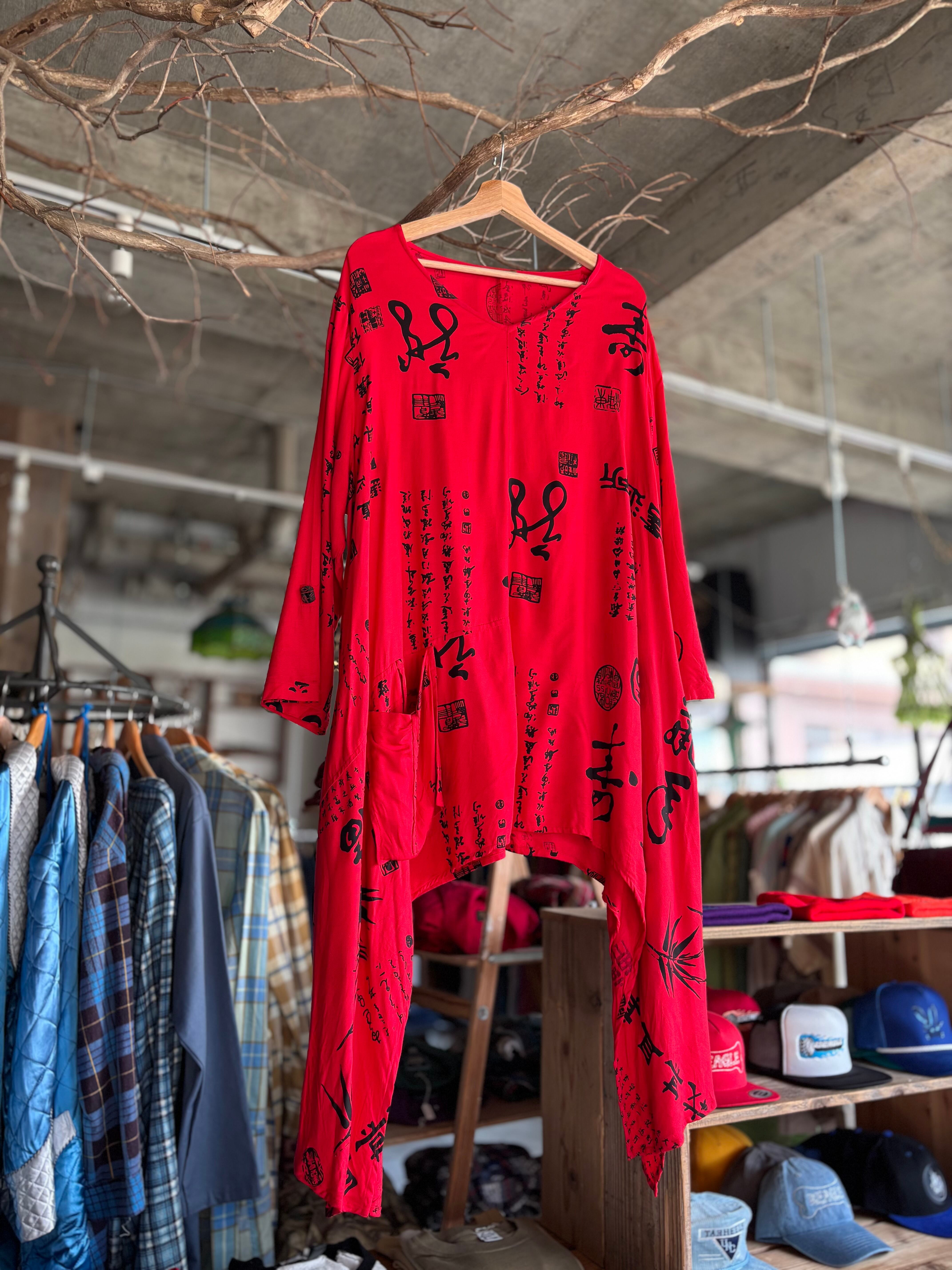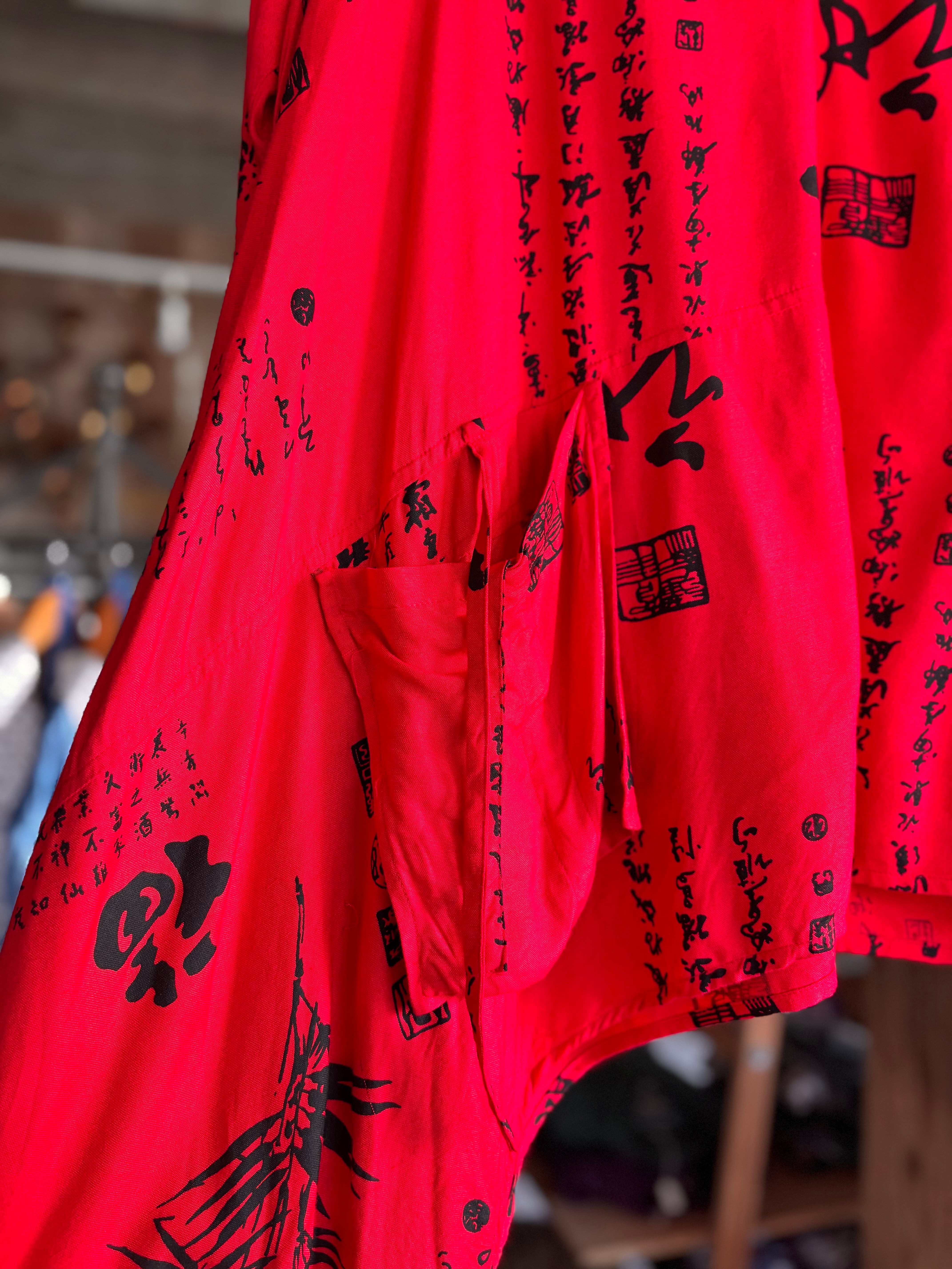 しっかりとしたレーヨン生地。オリエンタルムードたっぷりの漢字パターン。ゆとりのあるリラックスシルエット。変形シルエットやポケットなど古着ならではの面白さが詰まったアイテム。シンプルなパンツと合わせるだけで、1枚でお洒落なトップスです。