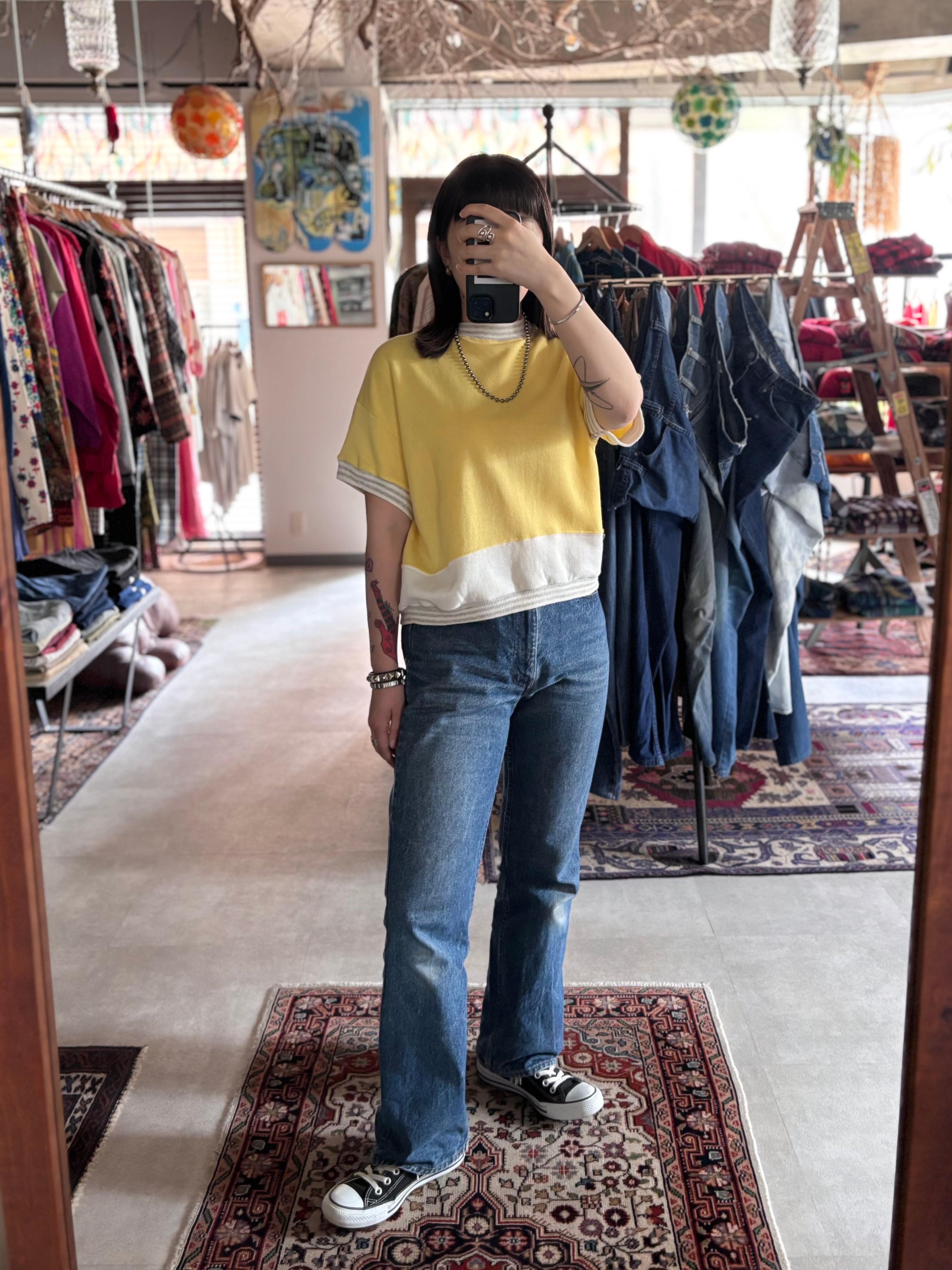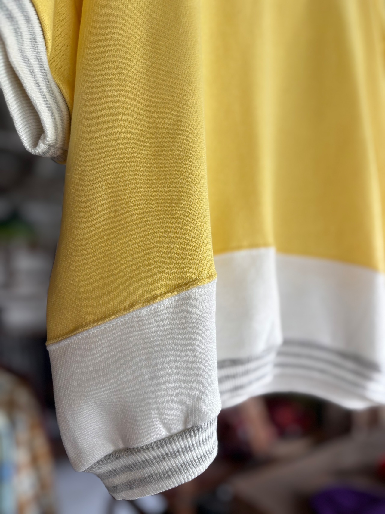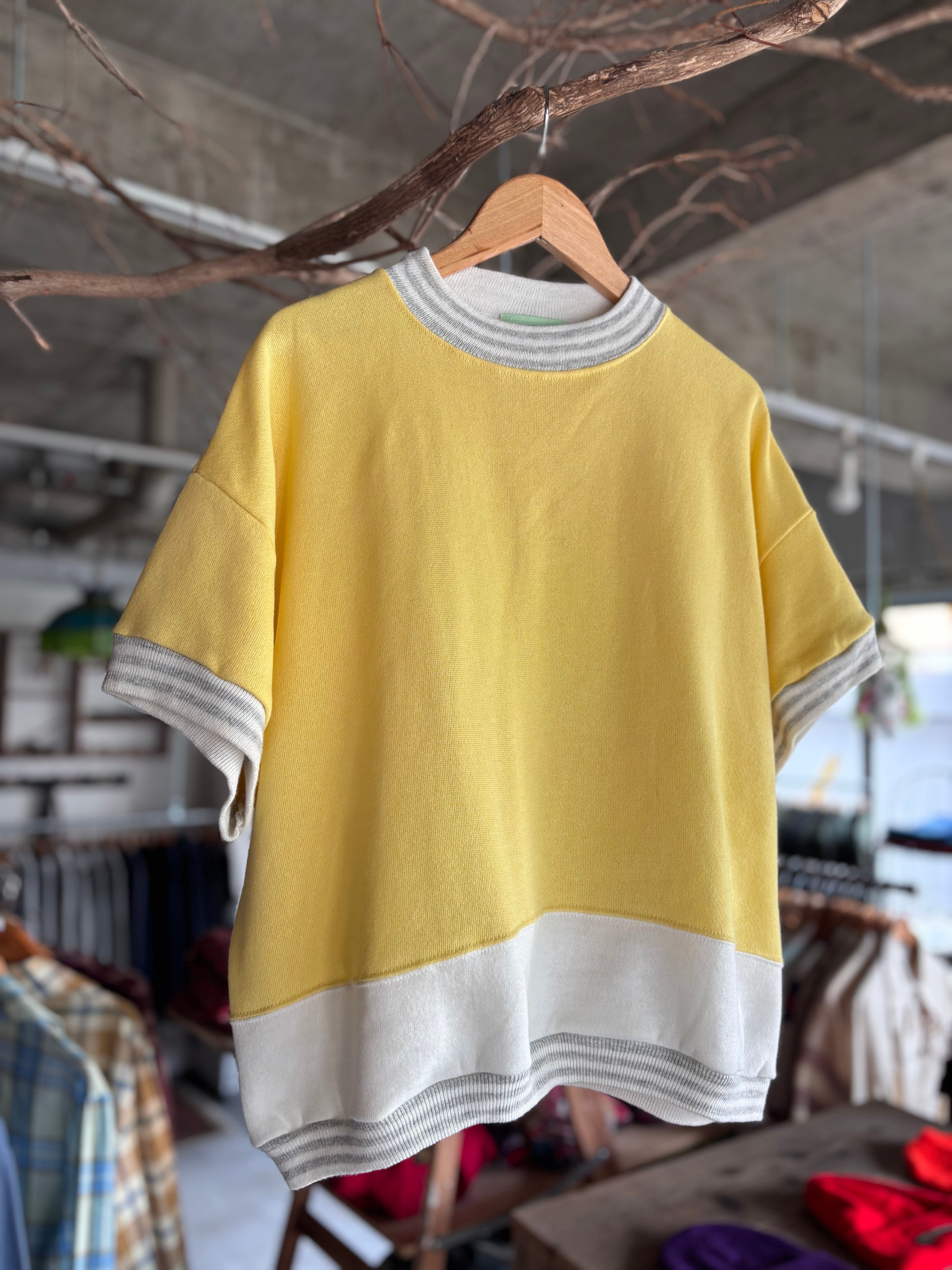 80年代製の半袖スウェット。ゆとりのある身幅に、着丈短めのシルエット。ペールイエロー、ホワイト、グレーの配色がビンテージスウェットらしい可愛さ。裾の切り替えとボーダーリブがレトロな雰囲気。長袖ブラウスやカットソーとのレイヤードコーデにもおすすめです◎