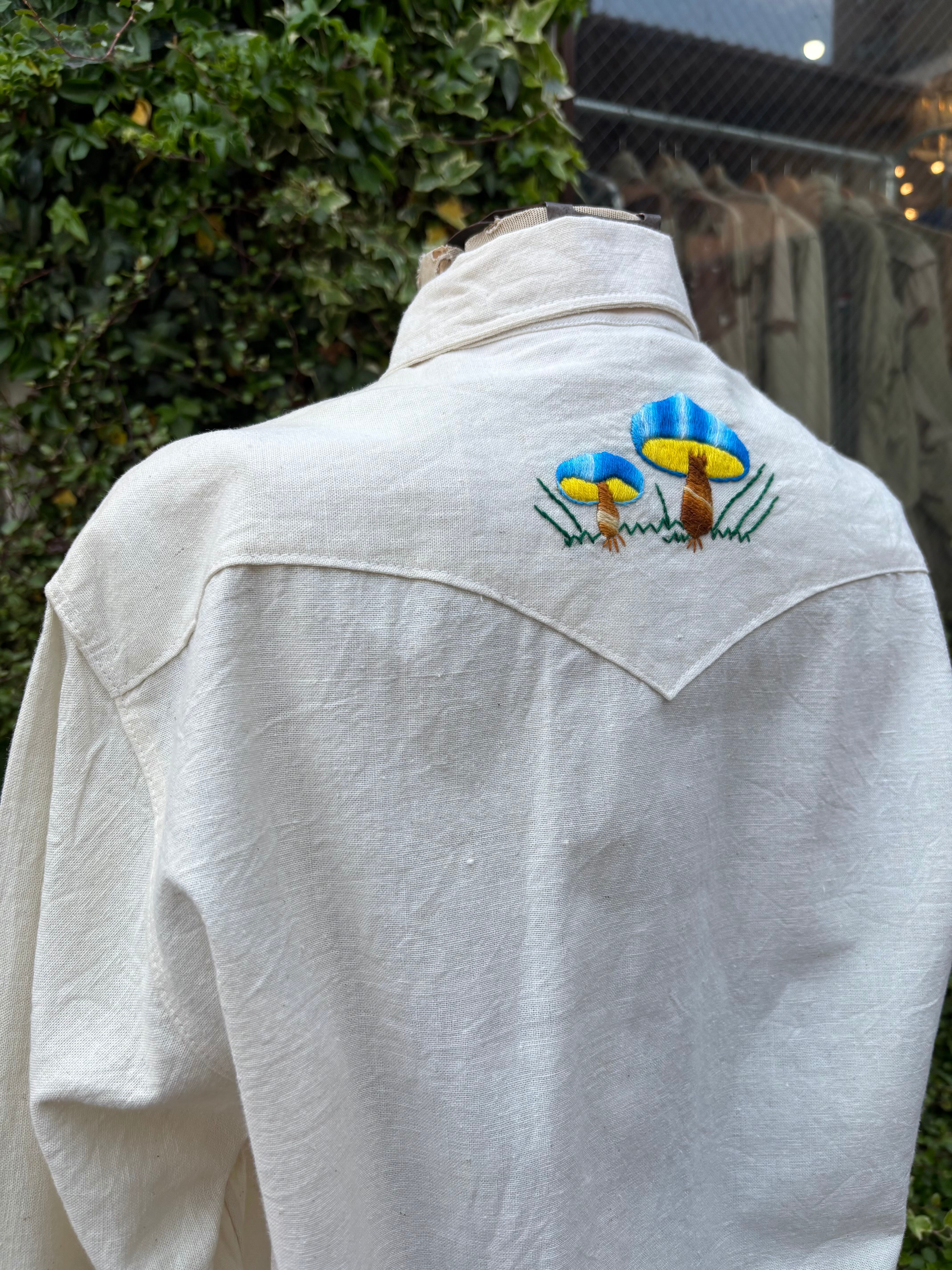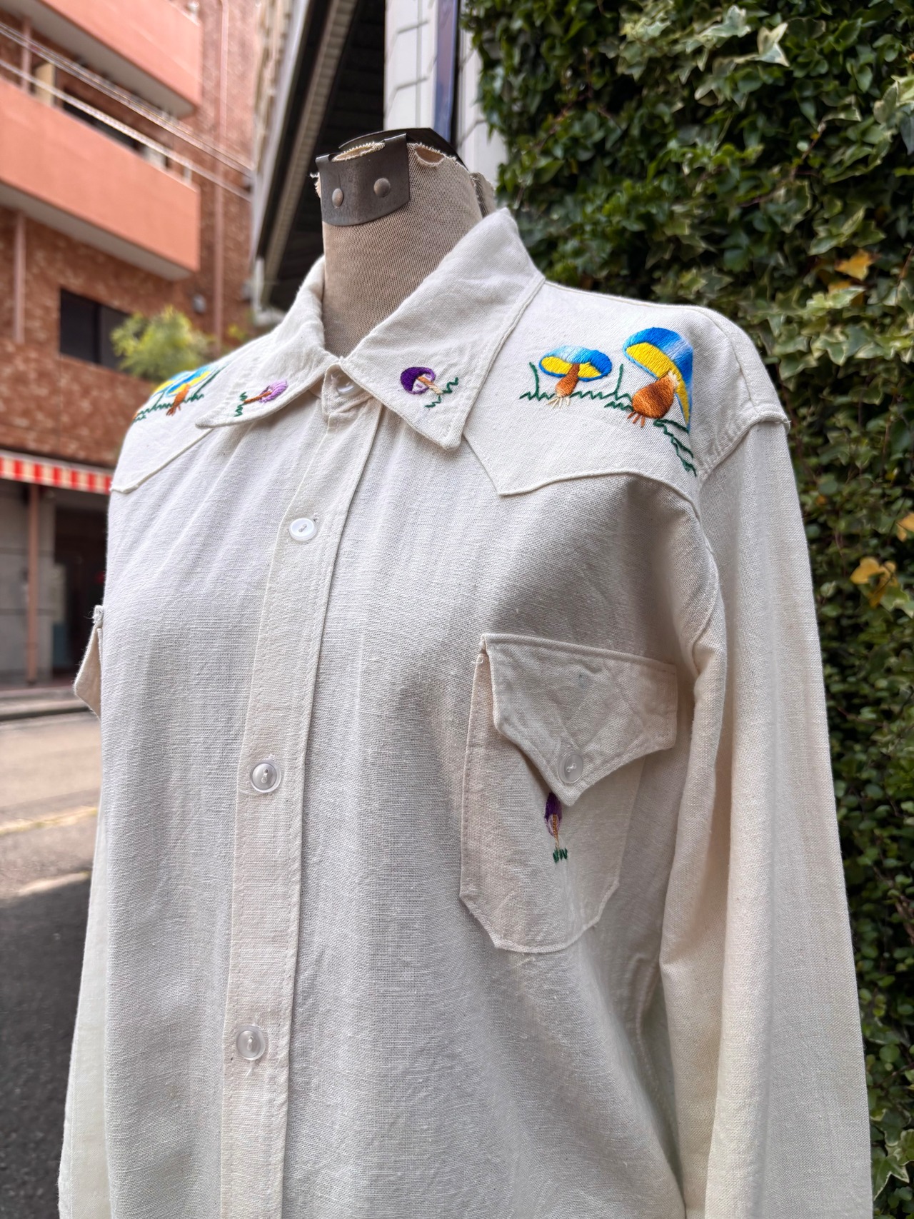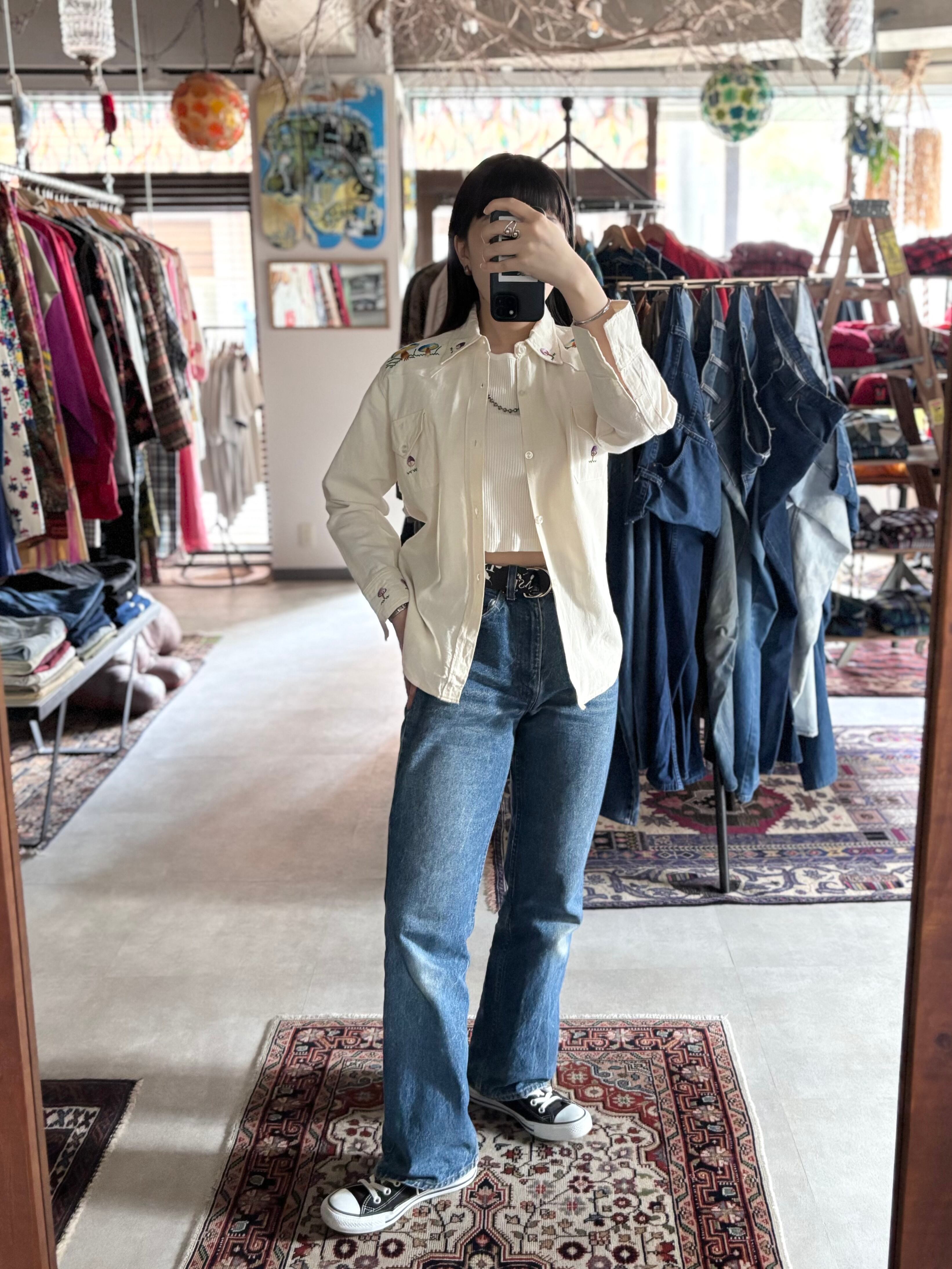 70年代生産の刺繍ブラウス。しっかりとした厚みのコットン生地で、ドライな肌あたり。アイボリーベースにヒッピーテイストのキノコ柄刺繍。コンパクトなサイズ感で様々なボトムスと合わせやすく、おすすめのアイテムです。