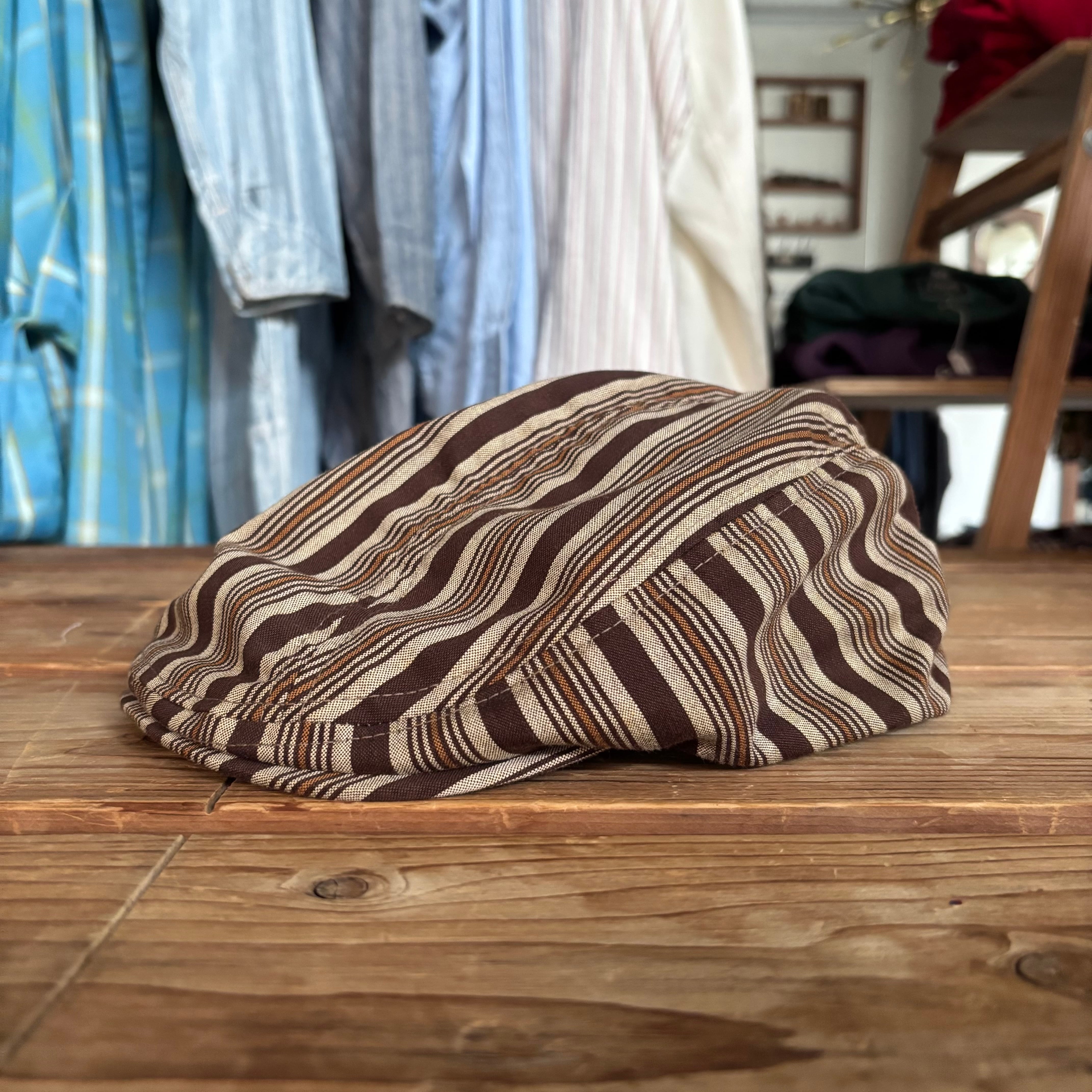 シャツ生地程度のコットン素材。クラシカルなブラウン系ストライプ。着用感少なめのとても綺麗なコンディション。USAメイドのNY HAT製。
