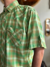 軽い着心地のコットンポリ素材。vintage感抜群のgreen × brown カラー。リラックスフィット。シェイプの効いたフラップに、袖口のデザインがとてもお洒落です。数が集まらないウエスタン仕様。OLDの雰囲気が好きな方におすすめの一着。