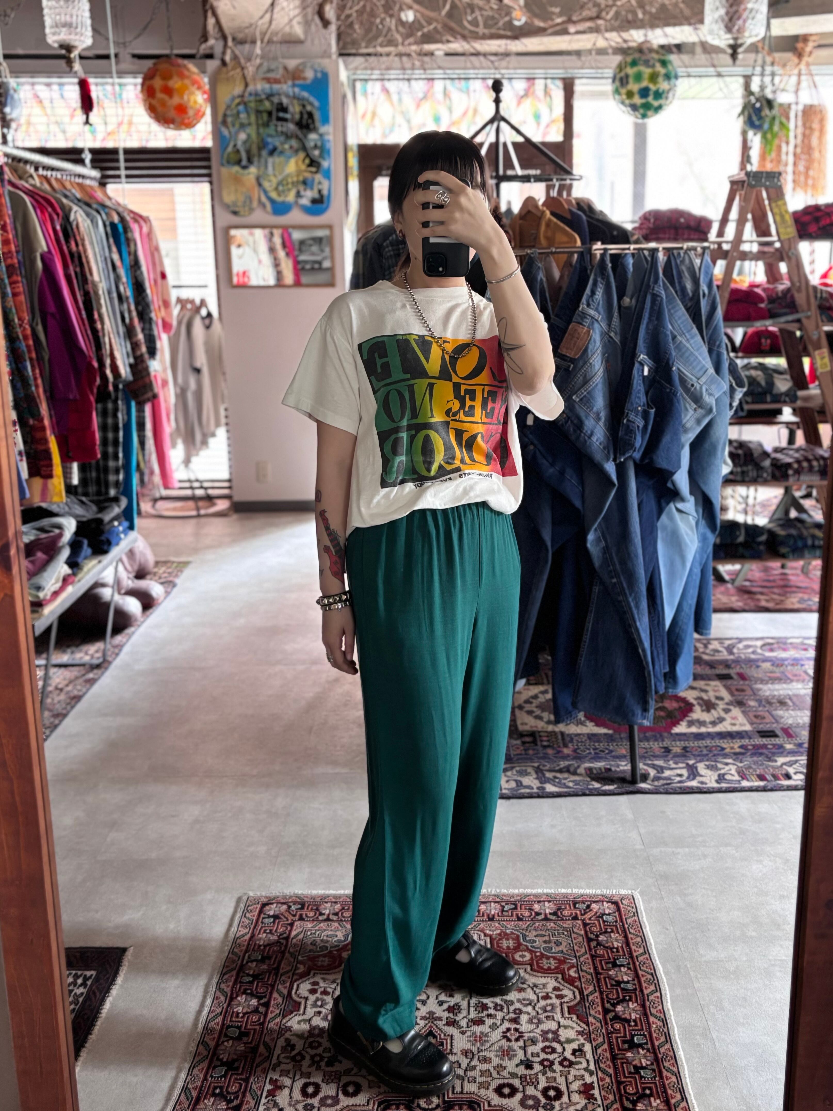 しっかりした厚みがあり、やや落ち感のあるレーヨンmix生地。エメラルドグリーンカラー。ウエストにゴムが入るリラックスフィット。嬉しいサイドポケット付き。使い勝手抜群のカラーパンツです。