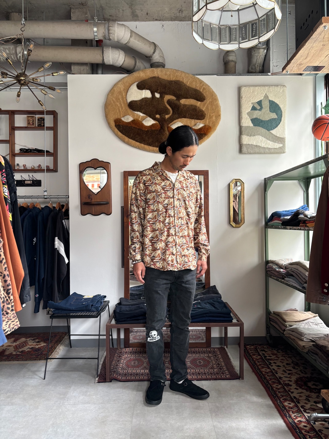 しっかりめのレーヨン素材。リラックスフィット。パール調のドーム型ボタン。トップを外しても映えるループカラー仕様。ナードな雰囲気の本の総柄パターン。