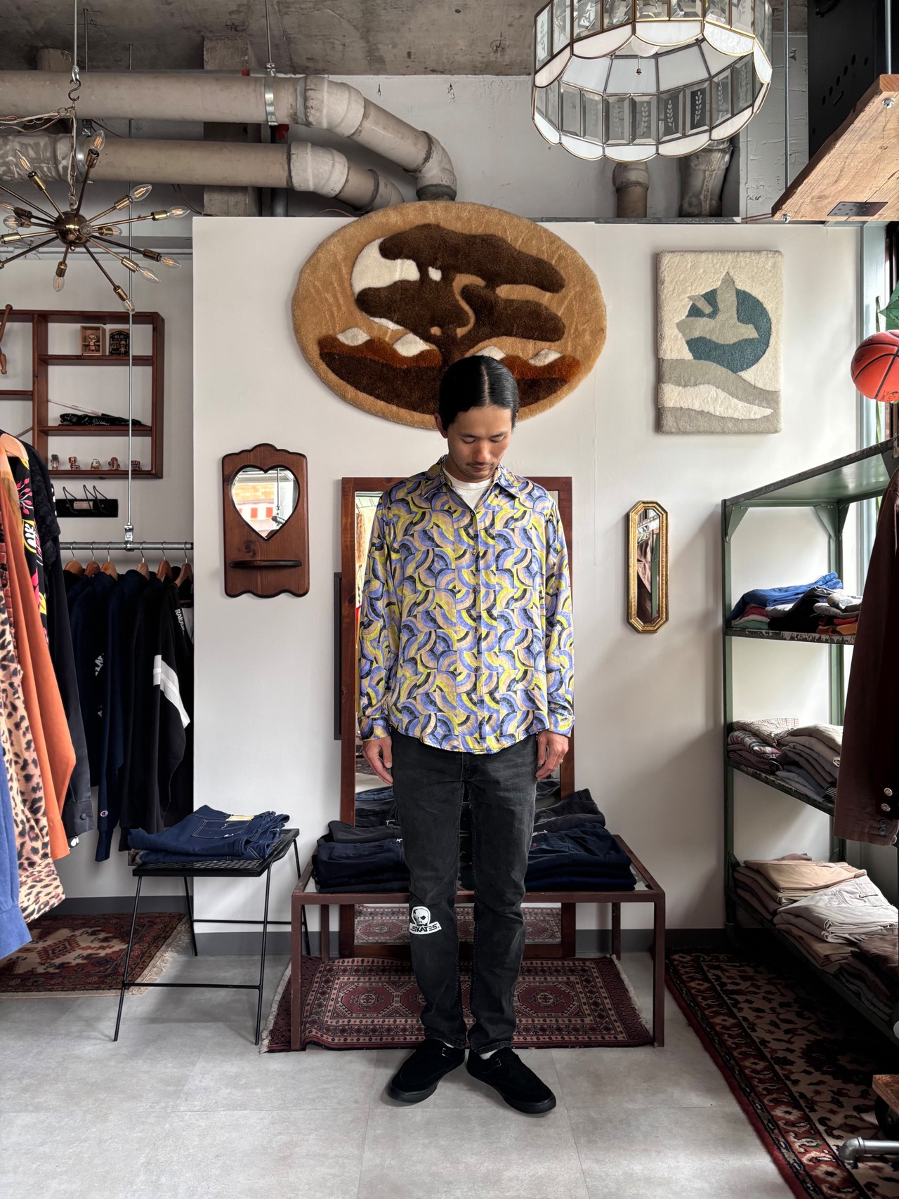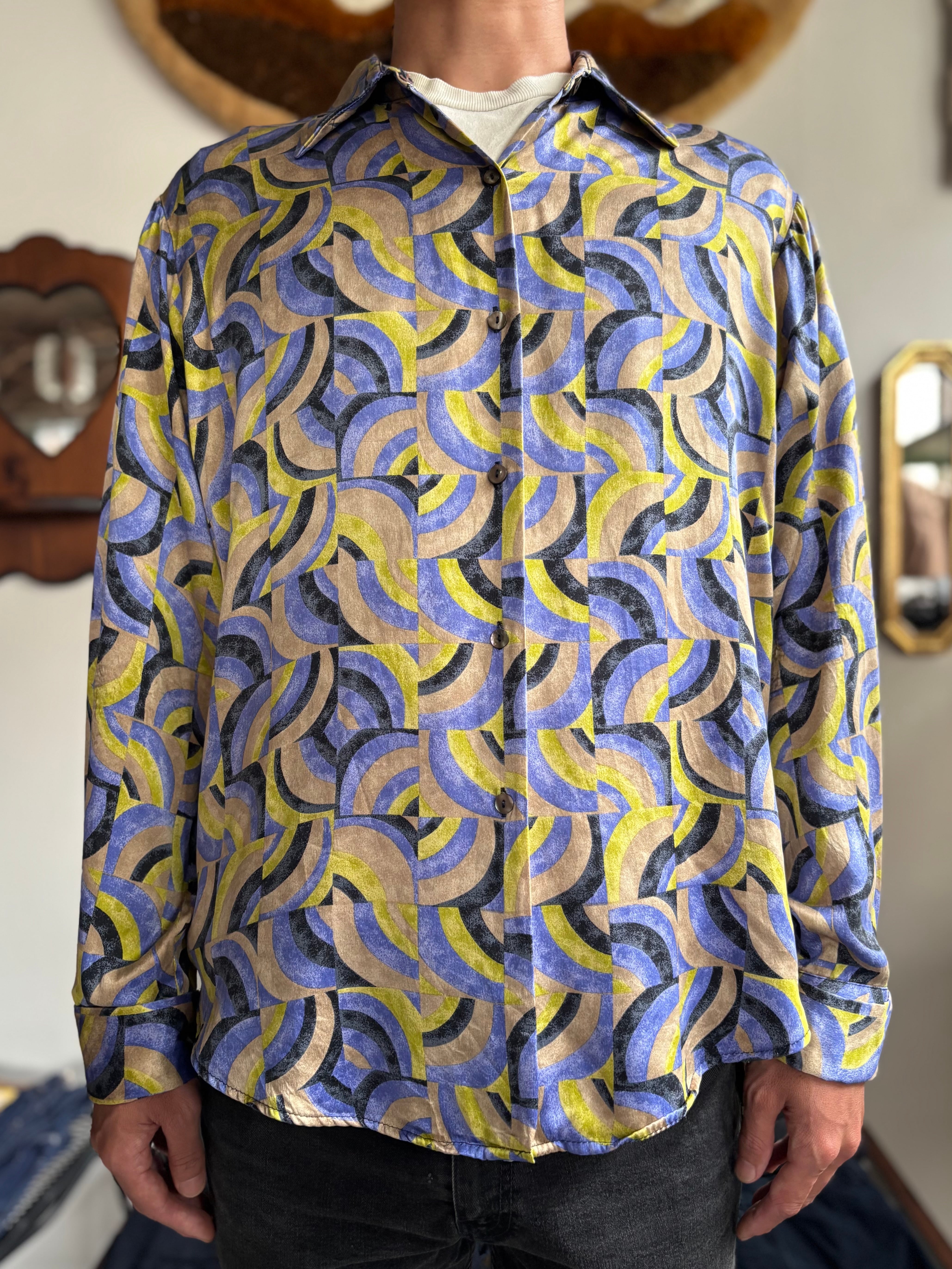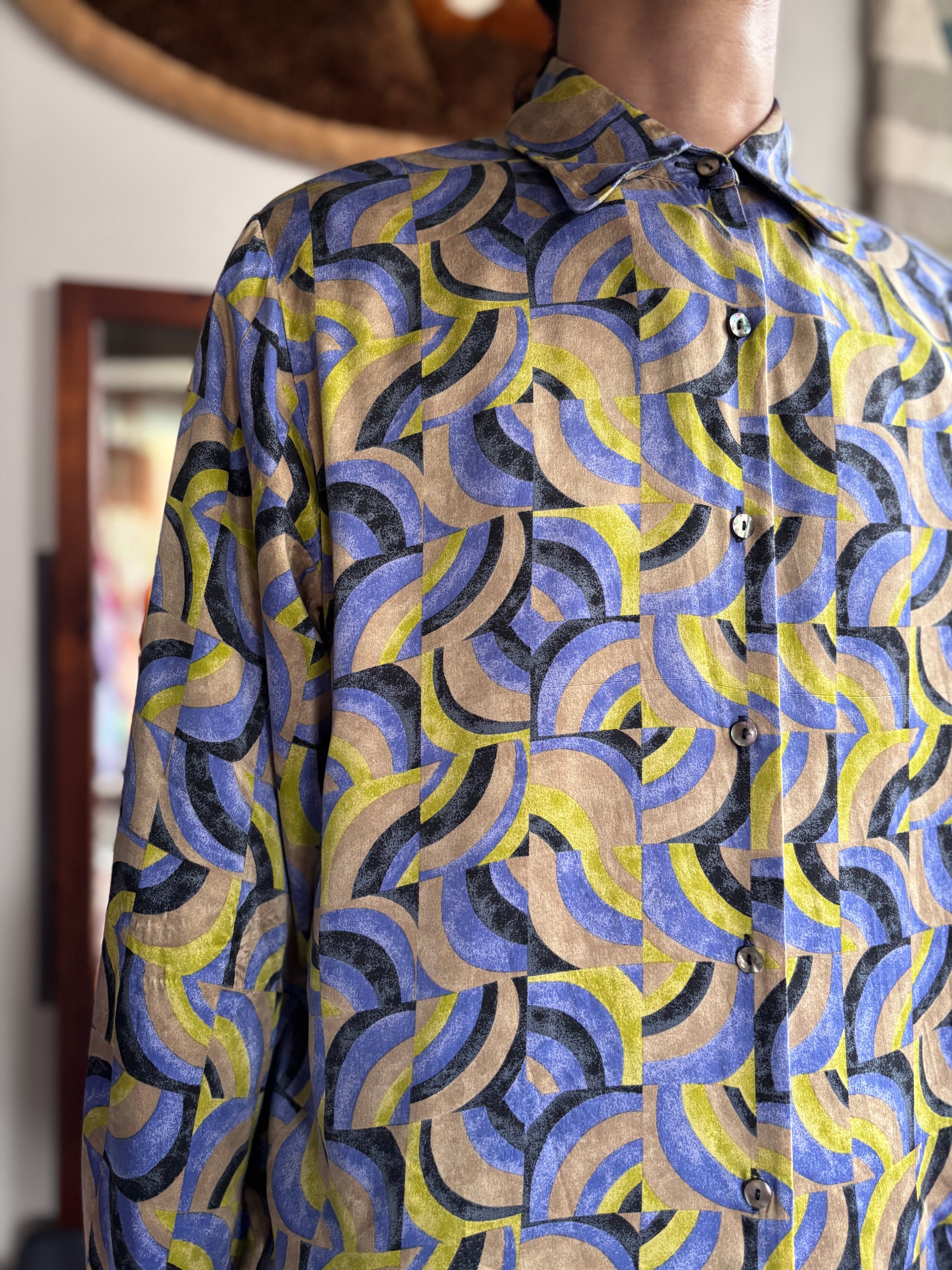 上質感抜群のしっかりしたシルク素材。リラックスフィット。ビンテージライクな袋襟。ダブルカフスのシェルボタン仕様。サイケデリックな印象の幾何学パターン。