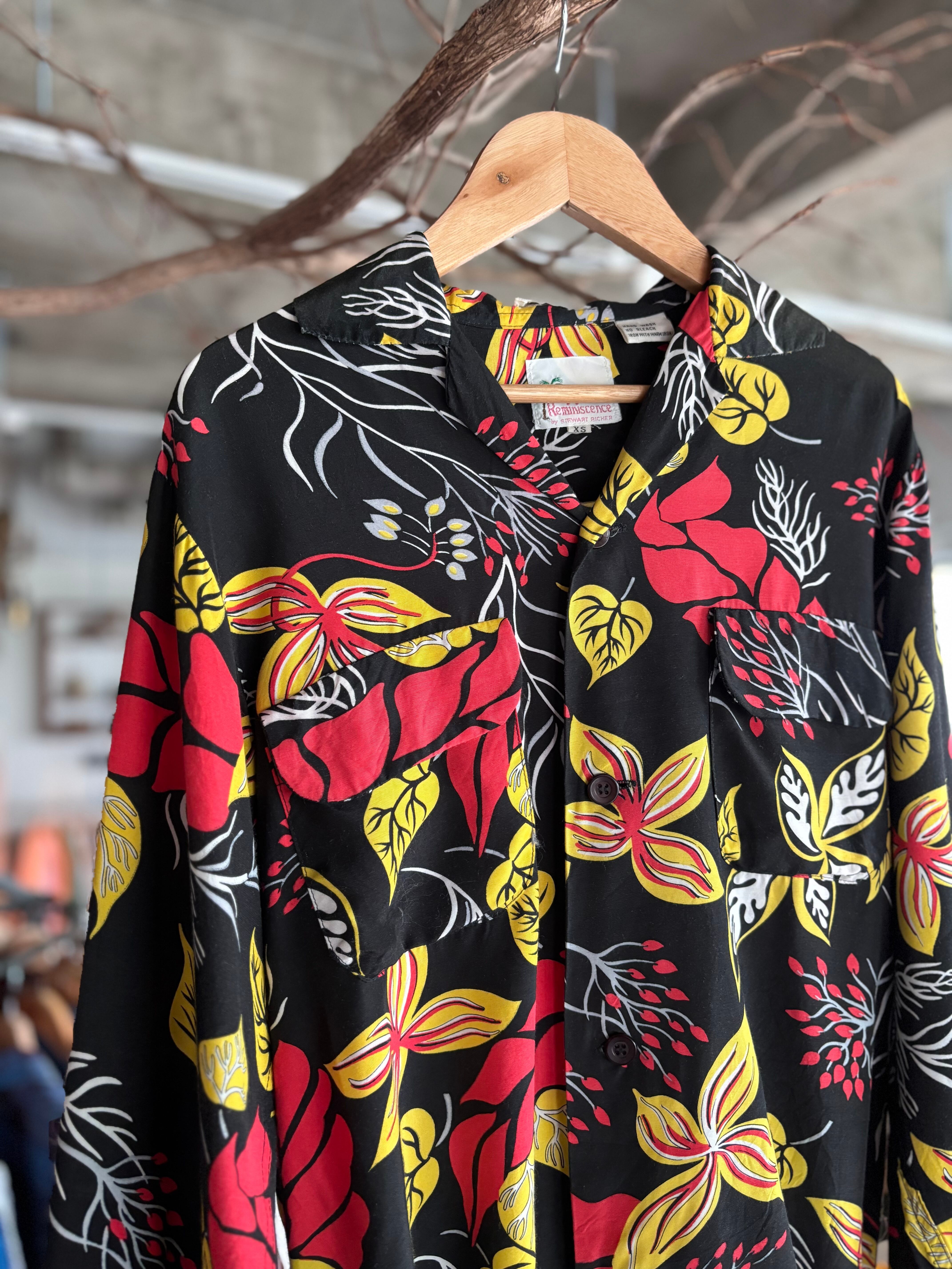 ビンテージライクな薄手のレーヨン素材。ブラックベースのロングスリーブハワイアンスタイル。オーセンティックフィット。クールなデザインのReminiscense製。