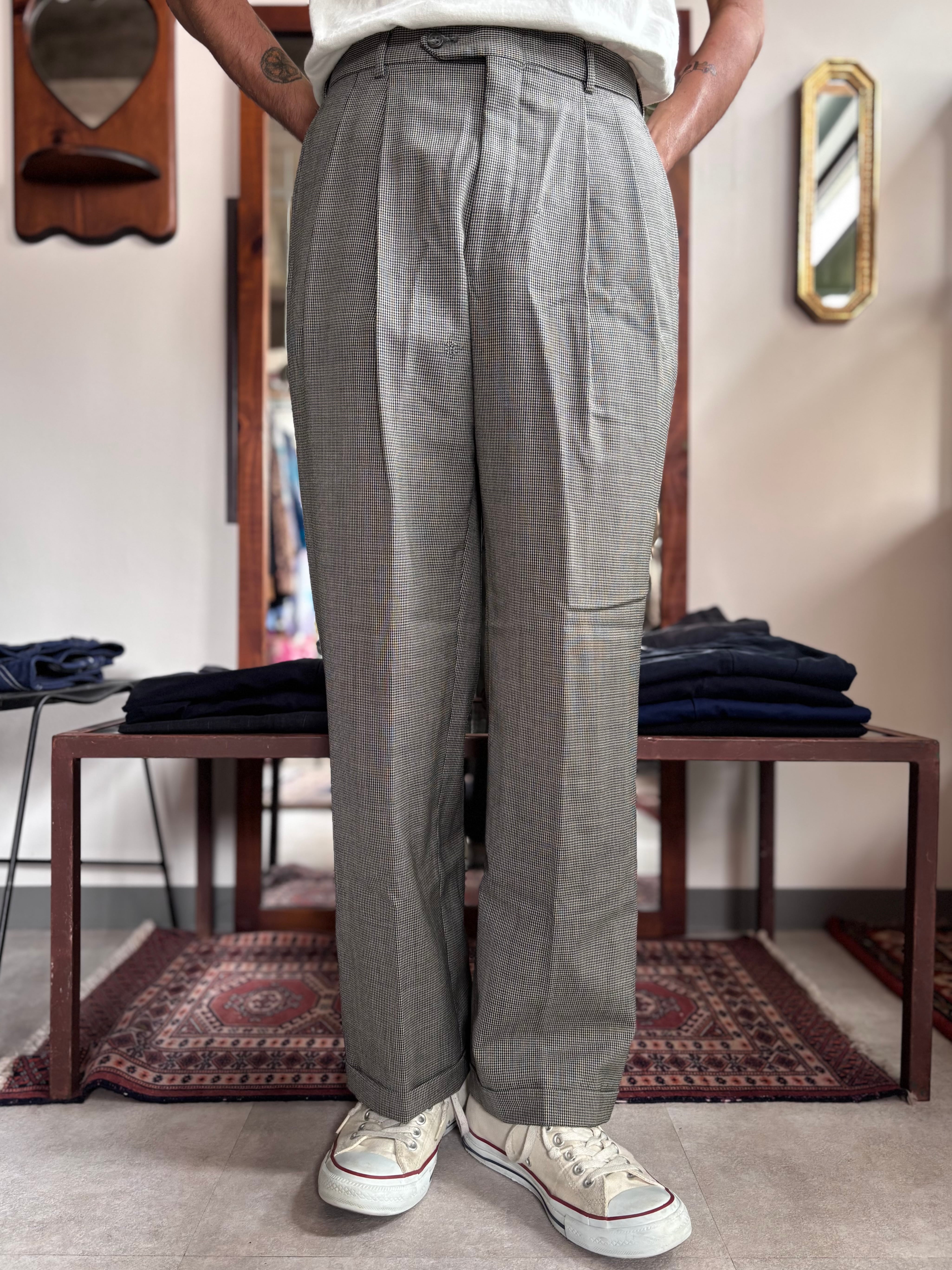 柔らかい肌触りのサマーウール素材。トラディショナルな千鳥柄。2タック入りのゆとりのあるストレートシルエット。裾はダブル仕様。90s USAメイドのOLDモデル。素材、仕立てともに高品質です。※リペアあり。
