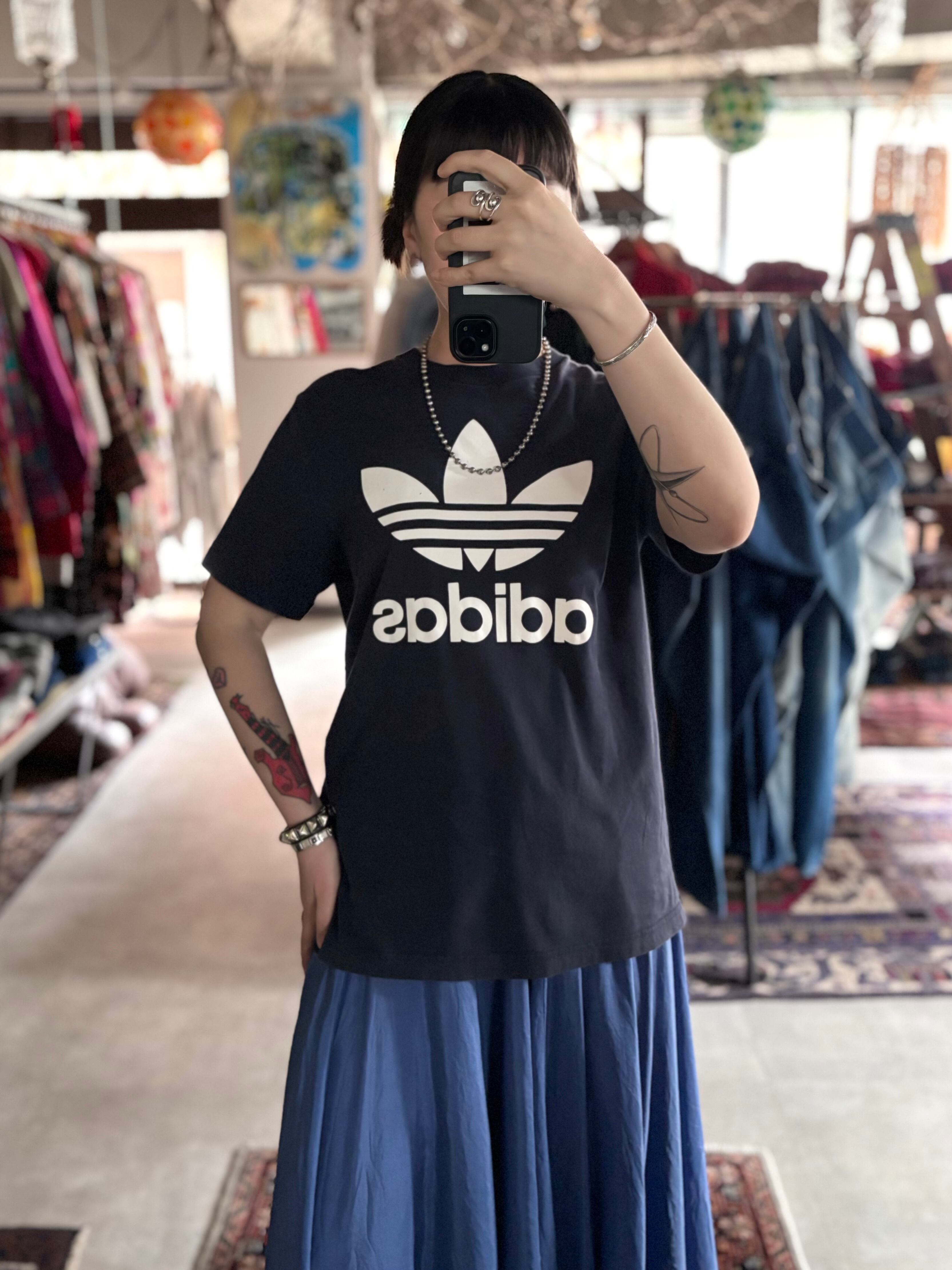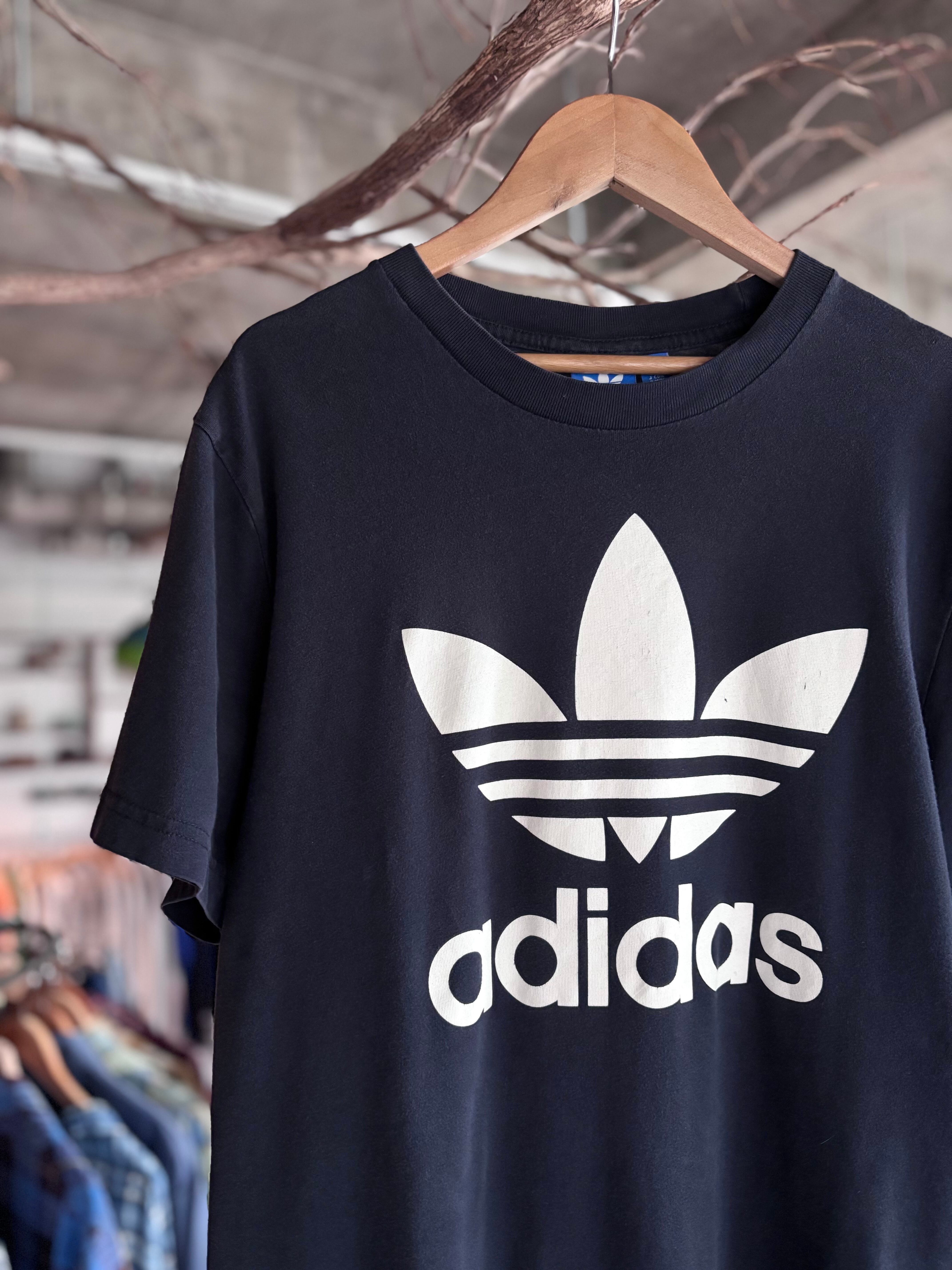 やわらかめの質感のコットン素材。程よく色褪せたネイビー地に、白のトレフォイルロゴ。1枚でもインナーでも使い勝手が良く、ユニセックスでおすすめのadidas tee。