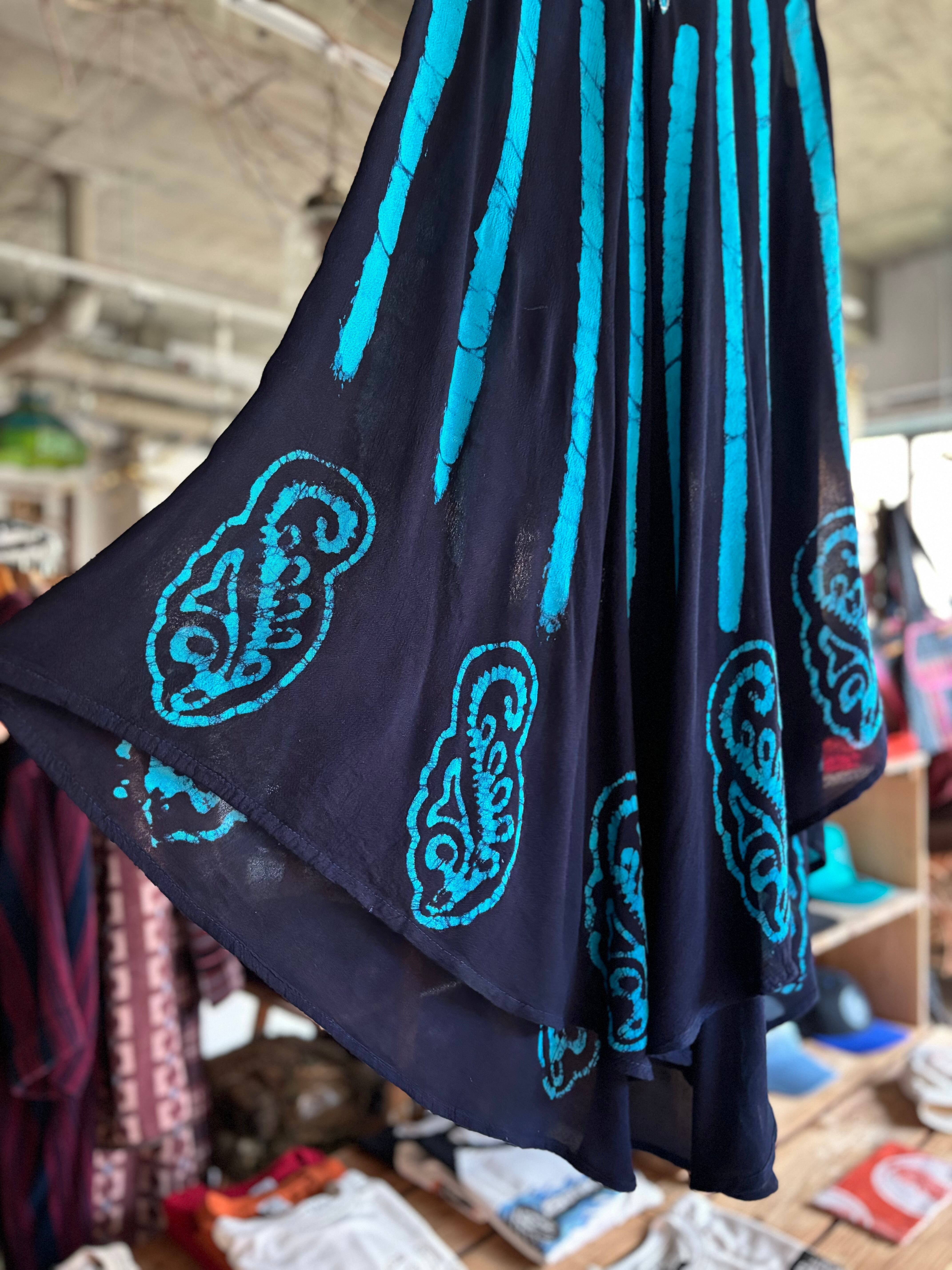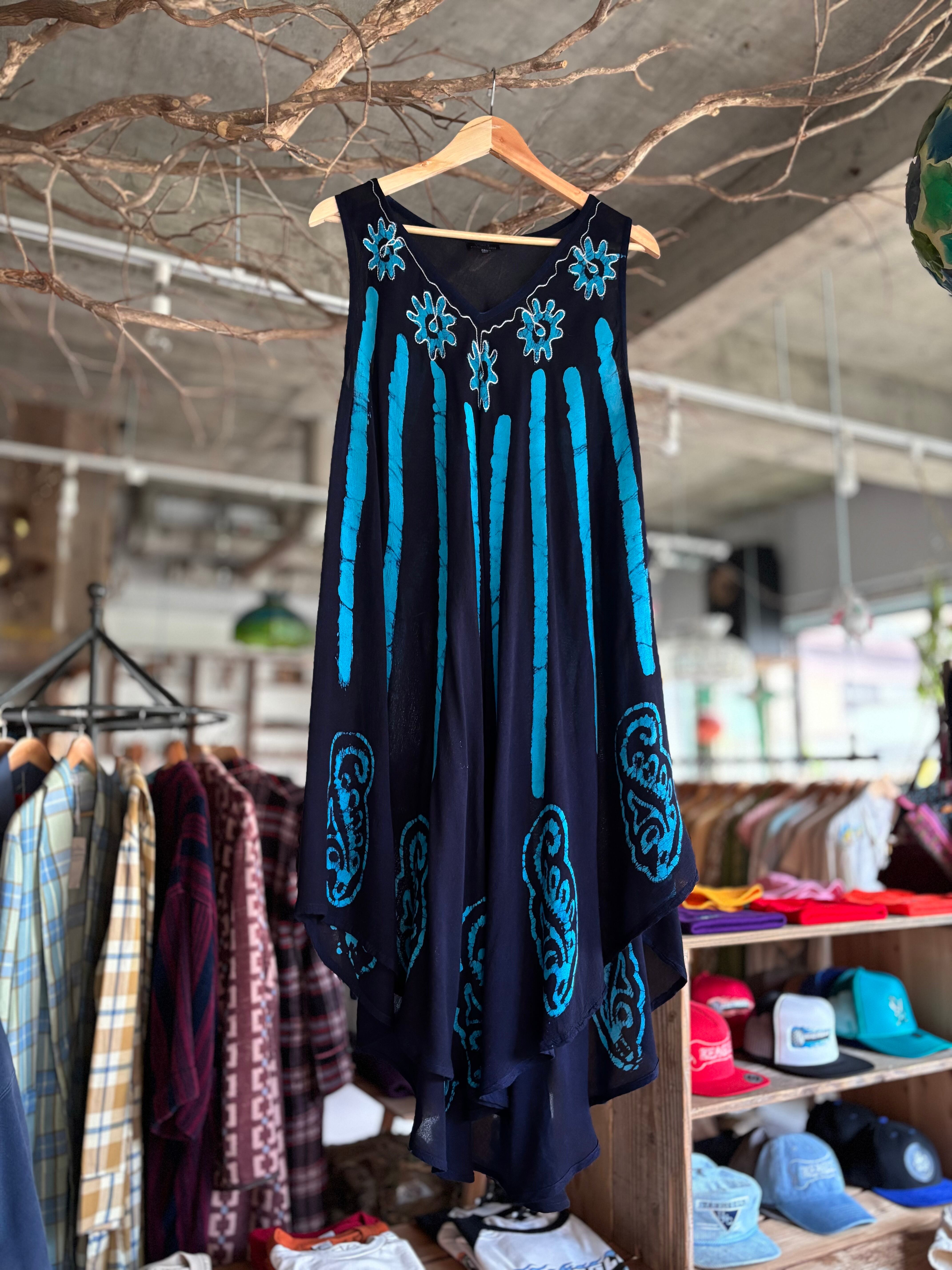 薄手で若干伸縮性のある軽めの生地感(透け感あり)。程よくゆとりのあるシルエット。エキゾチックなバティックパターン。クールな印象のブラック×ターコイズブルーの配色。一枚でも、レイヤードスタイルにもおすすめです◎
