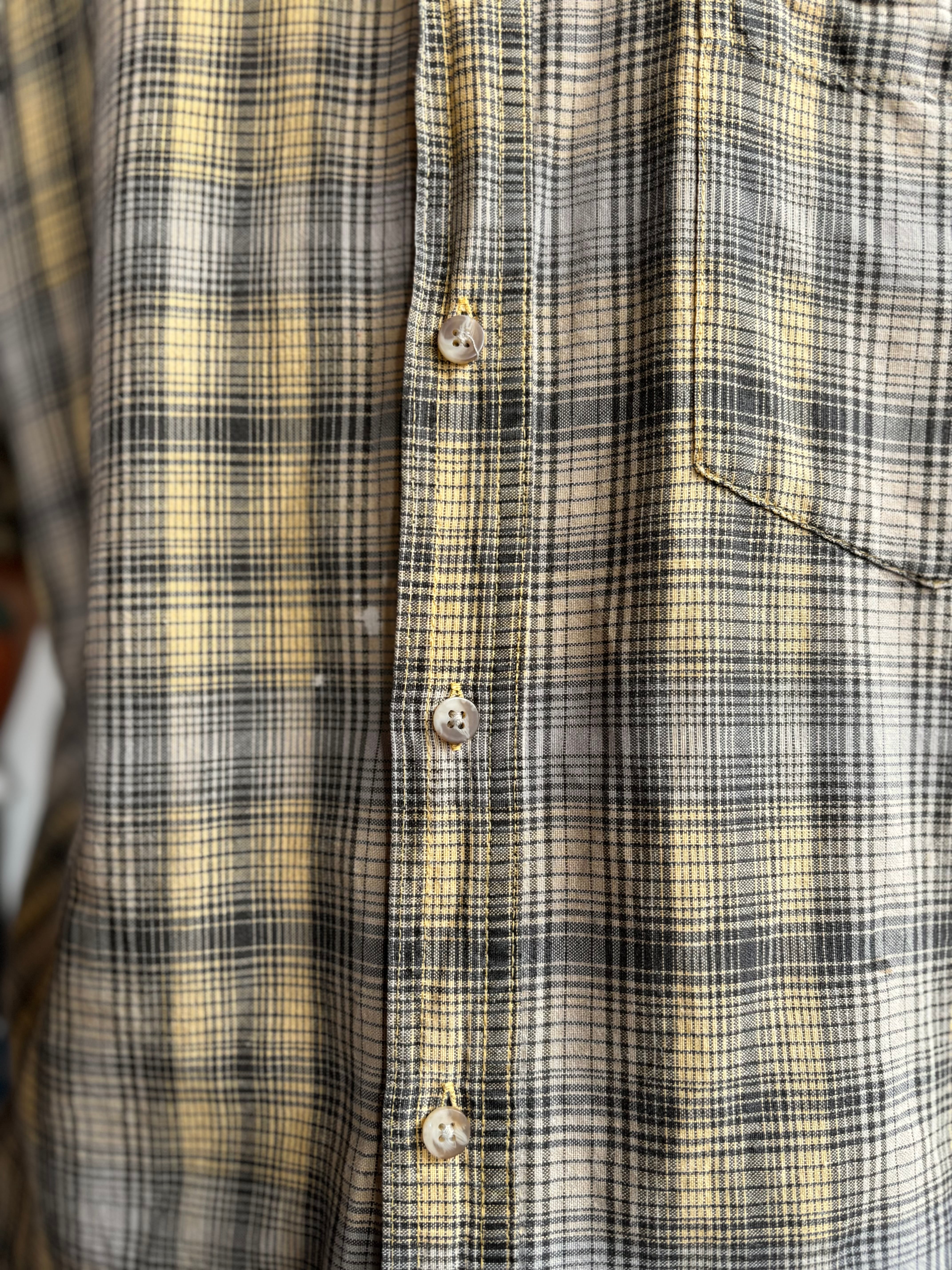 がさっと厚めのラミー×コットン素材。淡いイエローとグレーのタータンチェック。リラックスフィット。夏の日差し、夕暮れ時に映えること間違いなし。