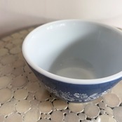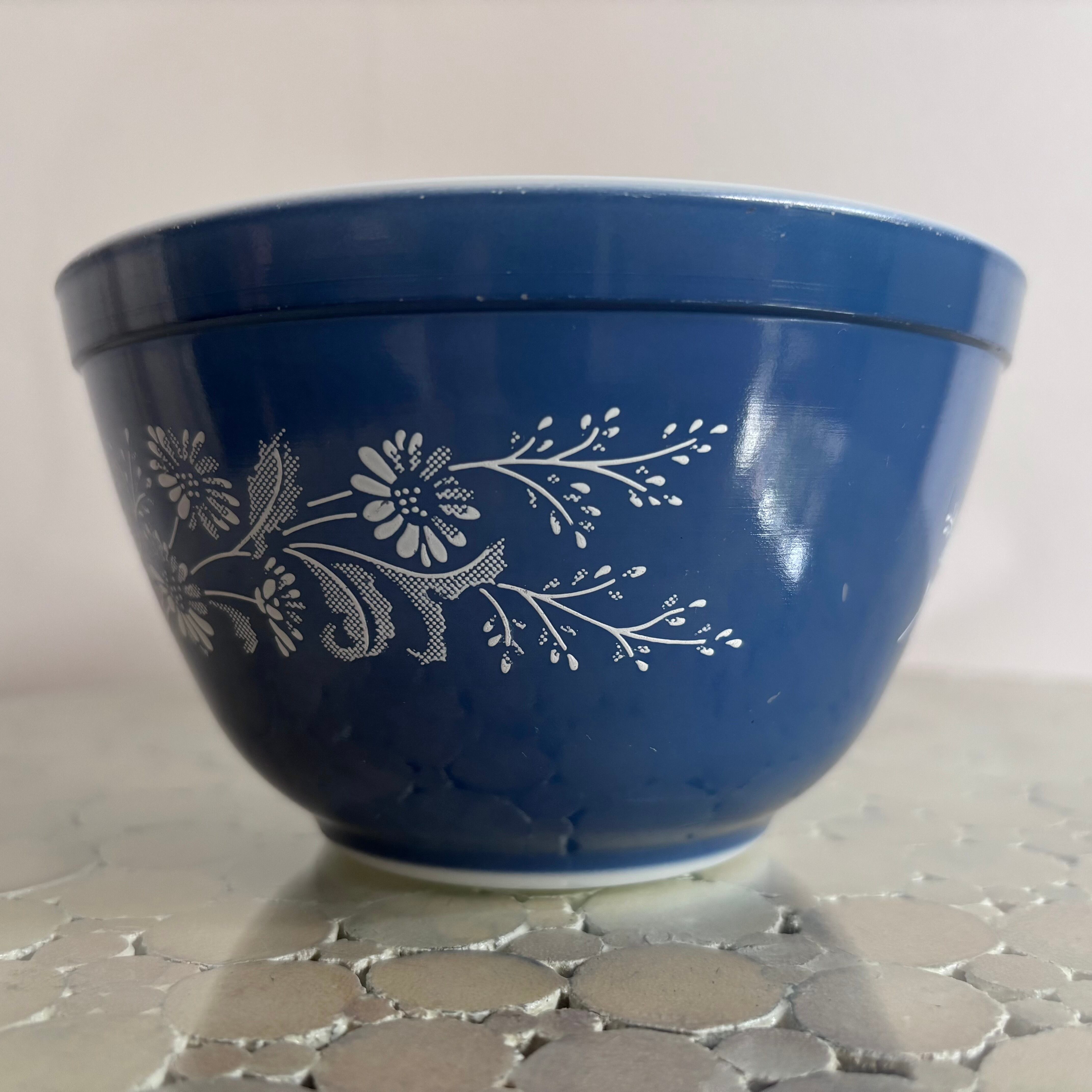 70年代生産のPYLEXミキシングボウル。コロニアルミストと呼ばれる、ブルー基調にデイジーの花がモチーフになっているシリーズ。厚みのあるミルクガラスはレトロな雰囲気たっぷり。