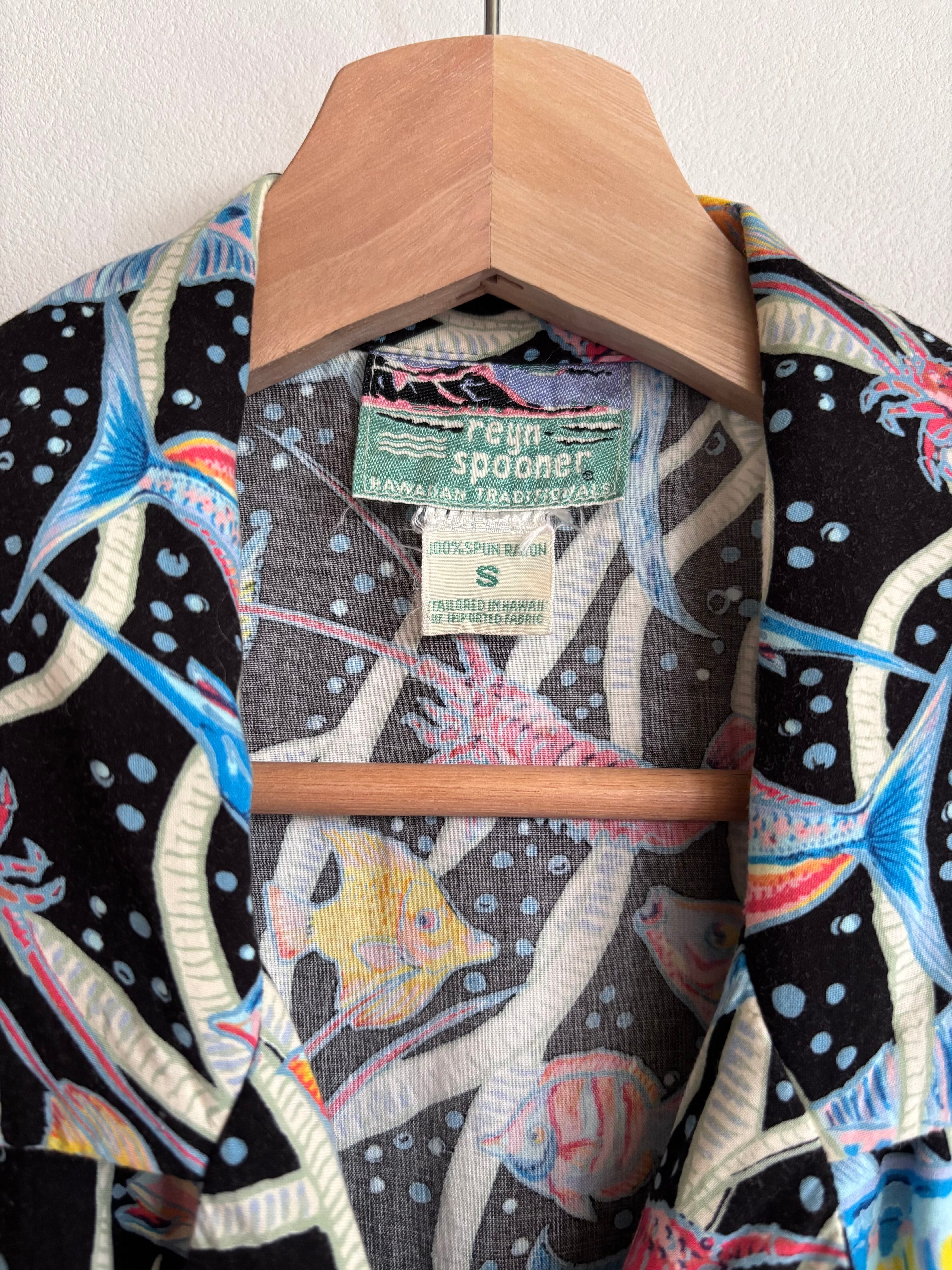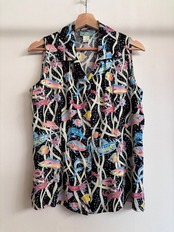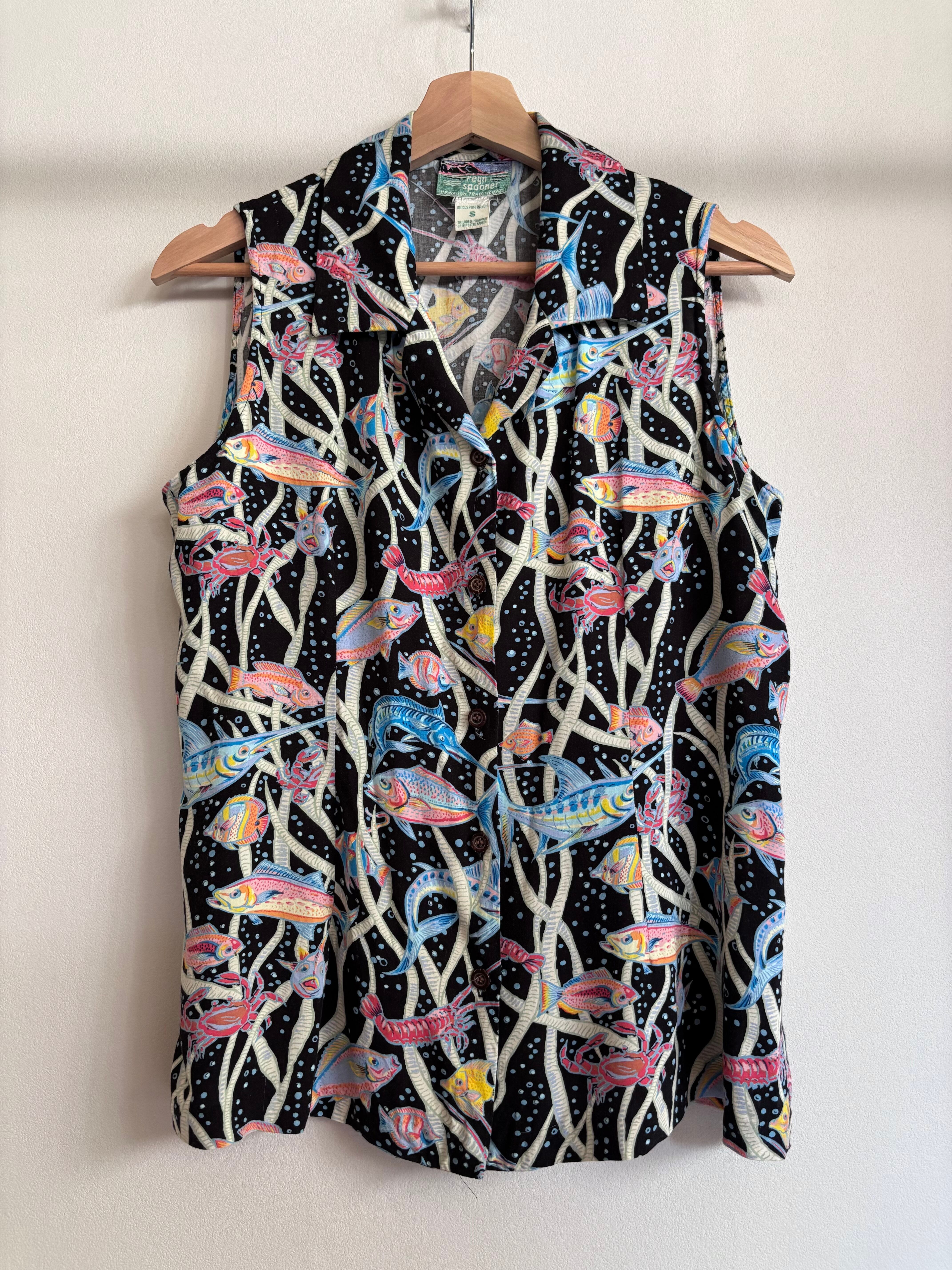 reyn spooner社製、とろみレーヨン素材のスリーブレストップス。オープンカラー仕様。程良くゆとりのあるフィット感。黒ベースにカラフルな魚の総柄。デニムやスラックスなどシンプルなボトムスに合わせていかがでしょうか◎
