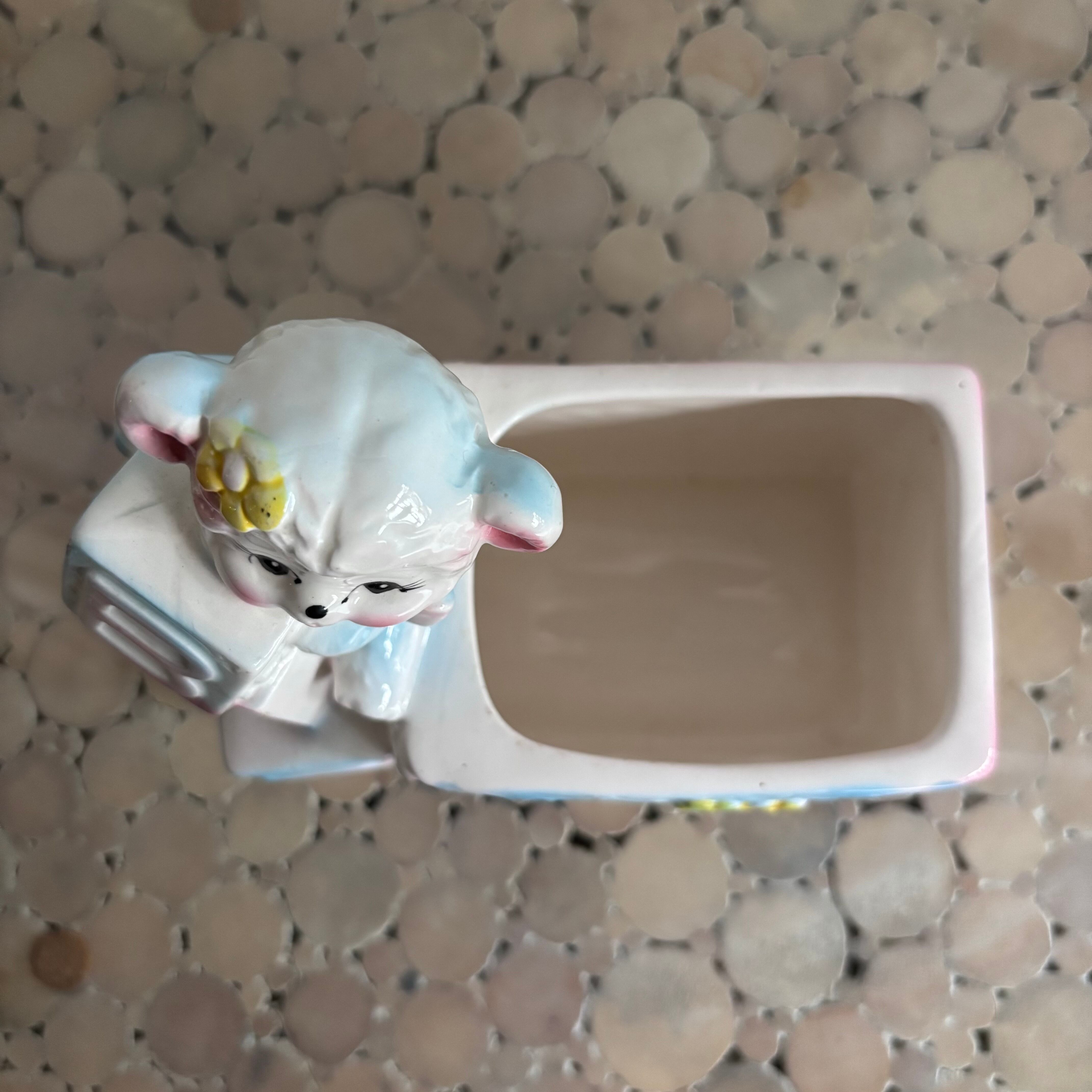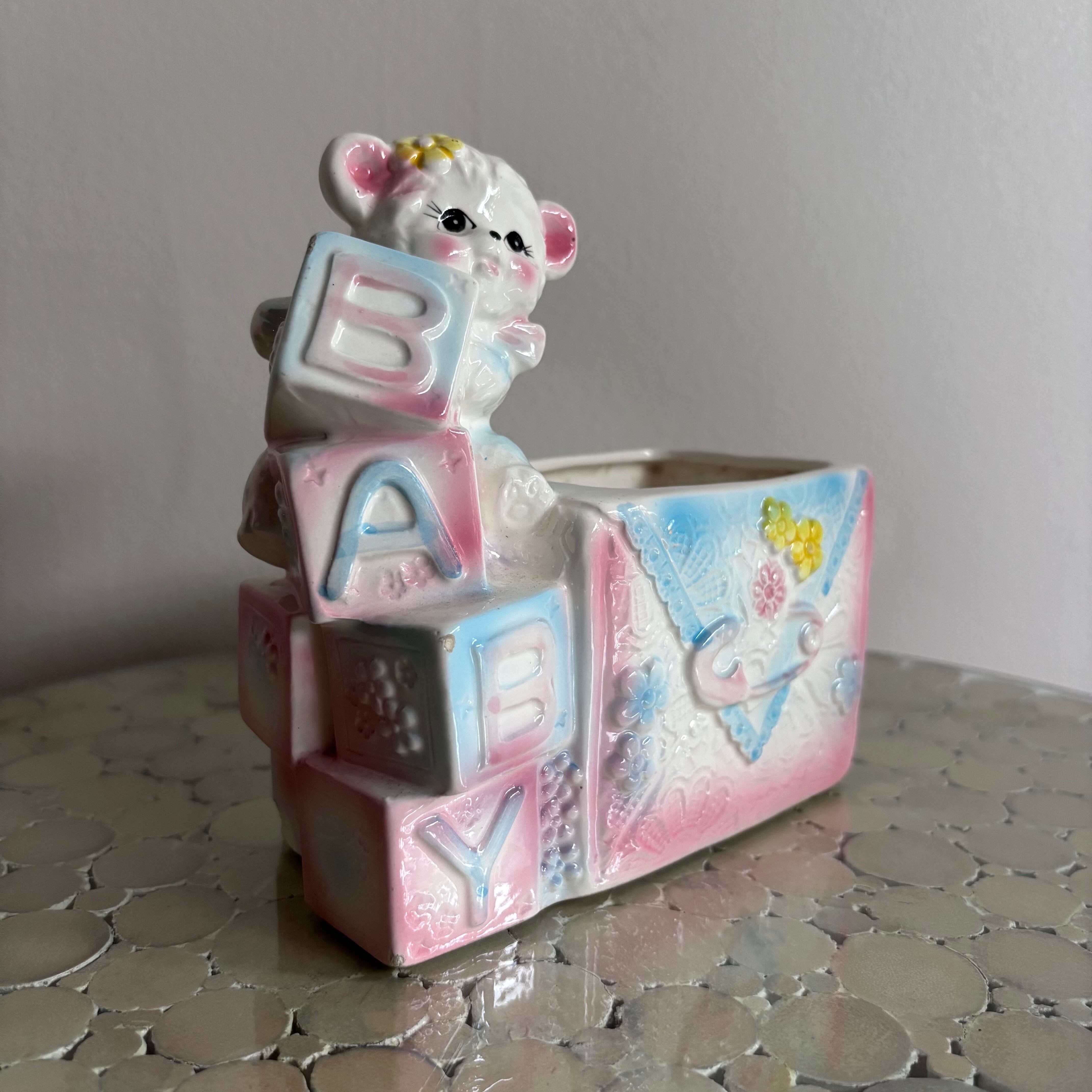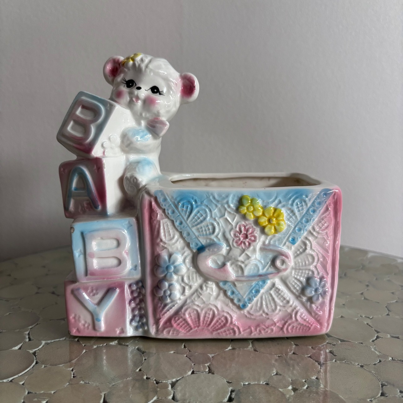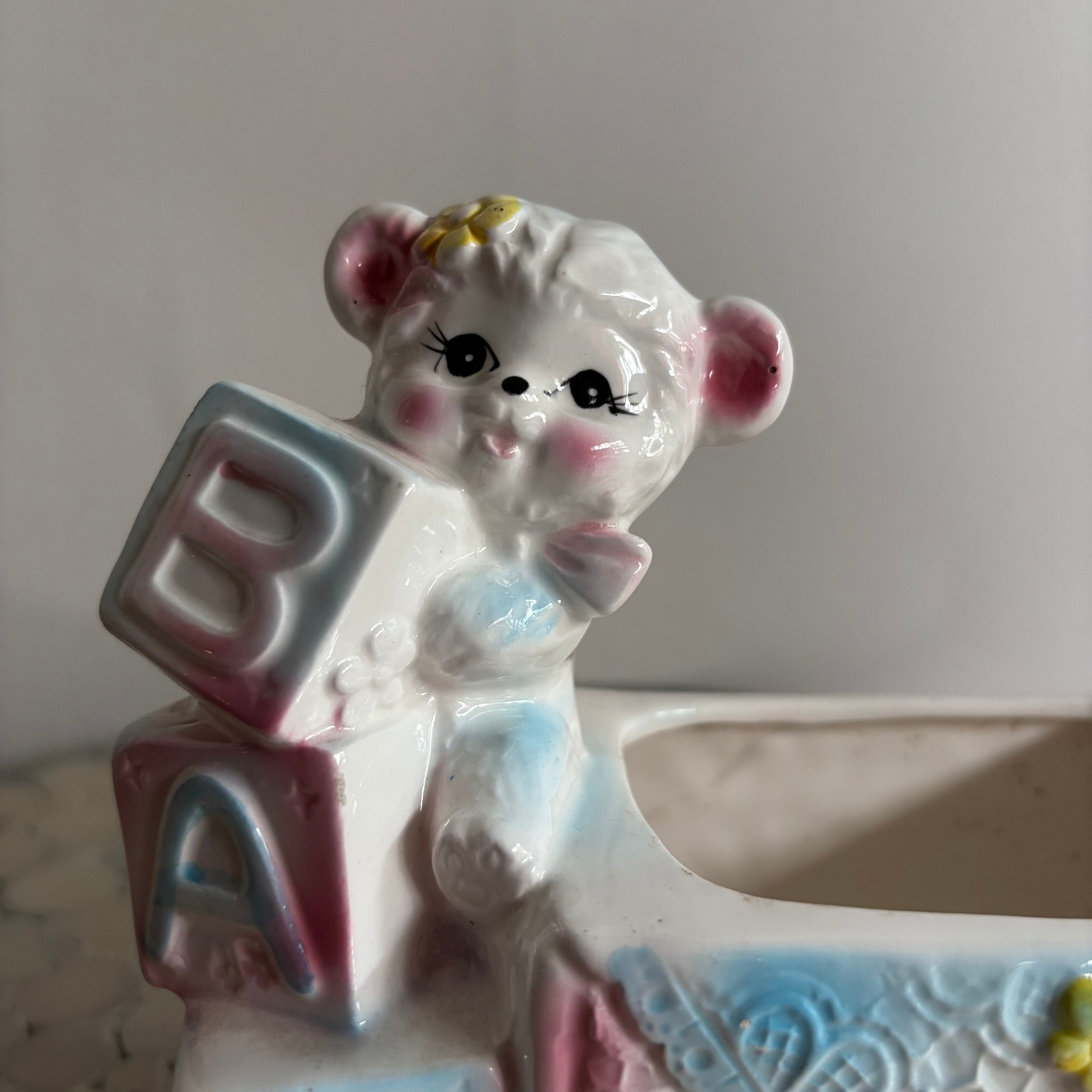 熊(?)のキャラクターのセラミック製フラワーベース。メルヘンな雰囲気。60s前後に日本からアメリカに輸出されていたもの。置物としても可愛い小ぶりなサイズ。ビンテージ品にご理解のある方のみご検討くださいませ。