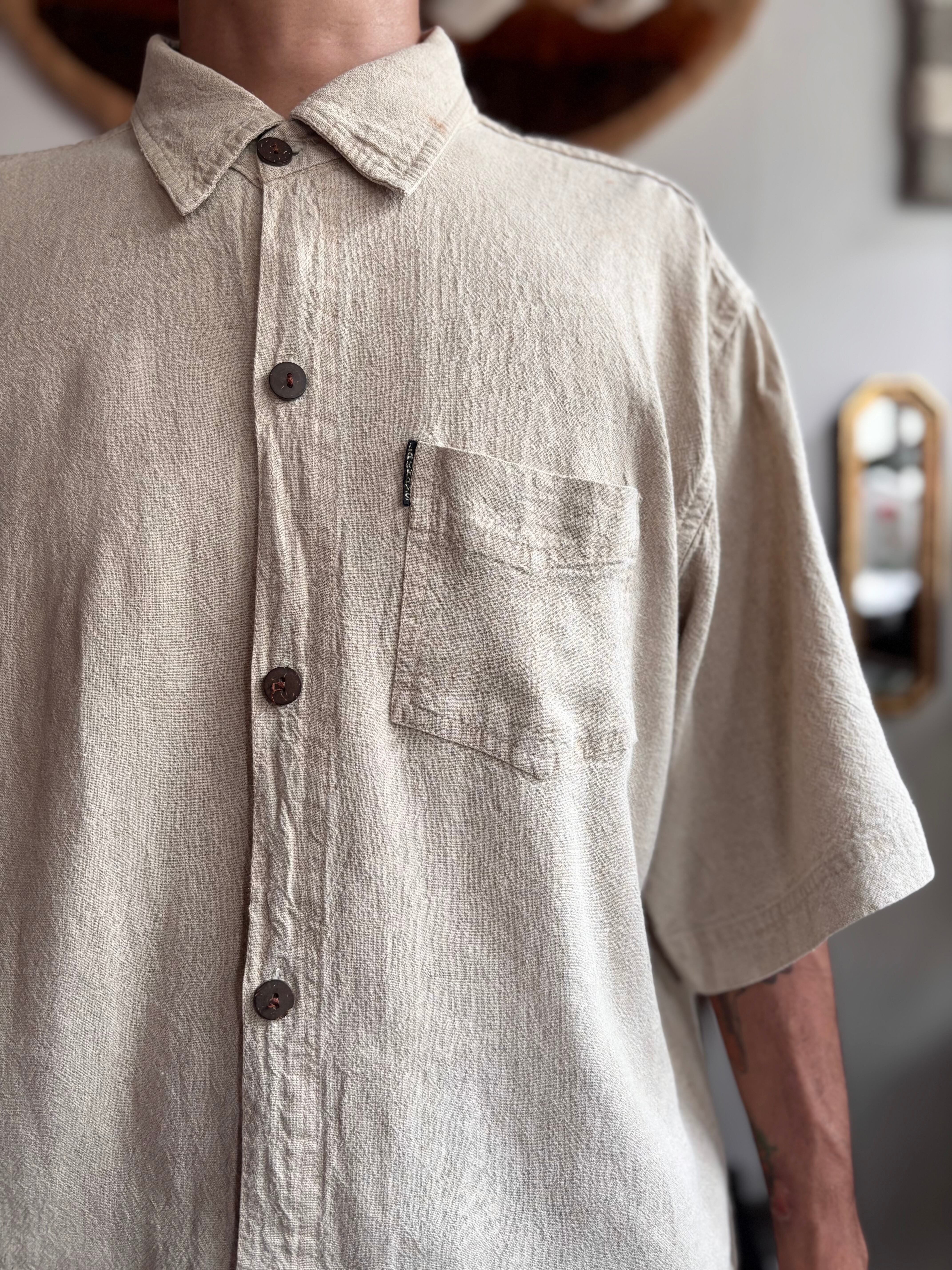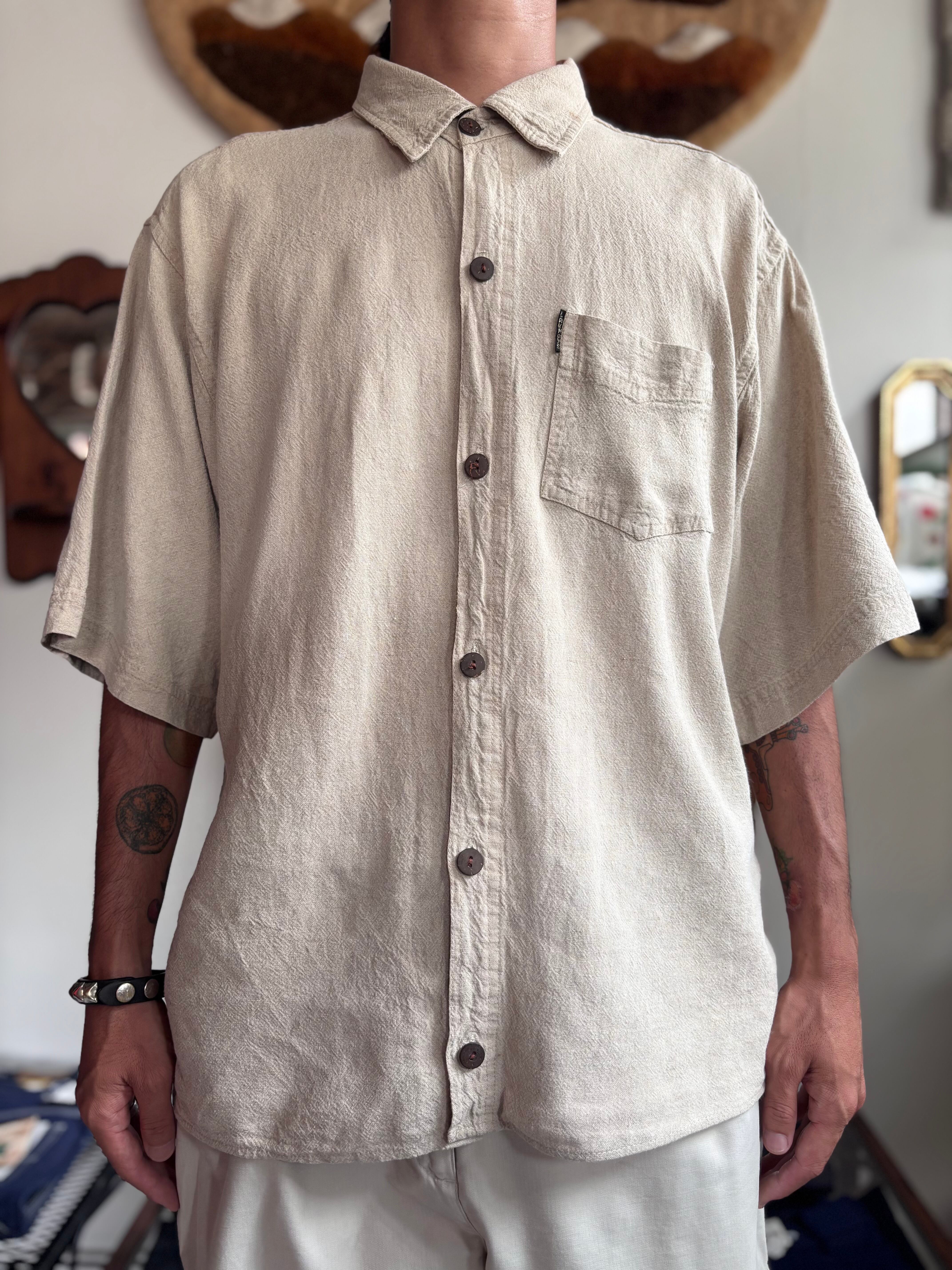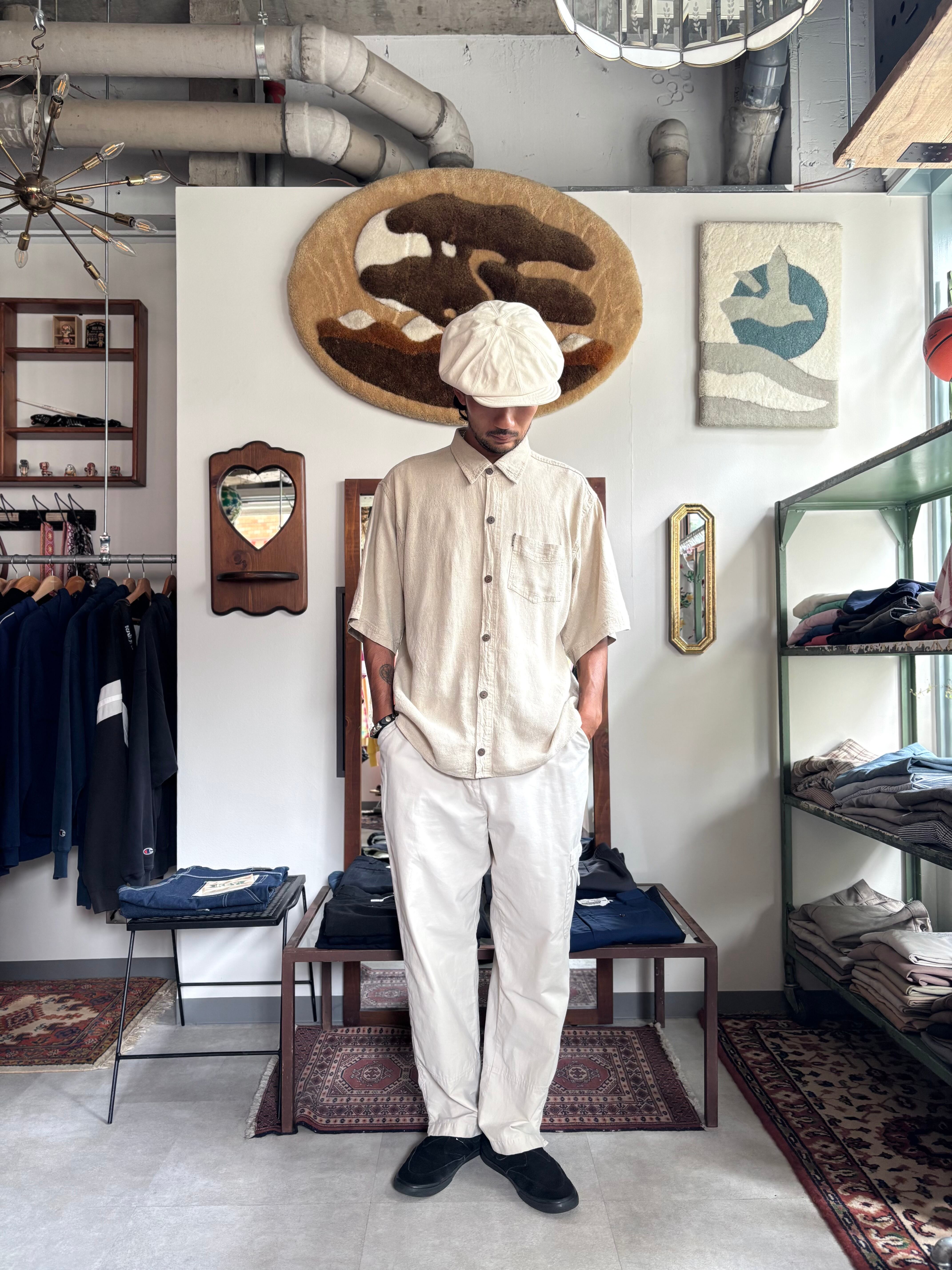 しっかり厚めのリネンレーヨン素材。リラックスフィット。ココナッツボタンに、長めの袖丈がお洒落感抜群。フロントのボタン幅がガチャついていたり、レギュラー古着の良さが出ています。表立った印象は少ないものの、良質ディテールのシャツ。