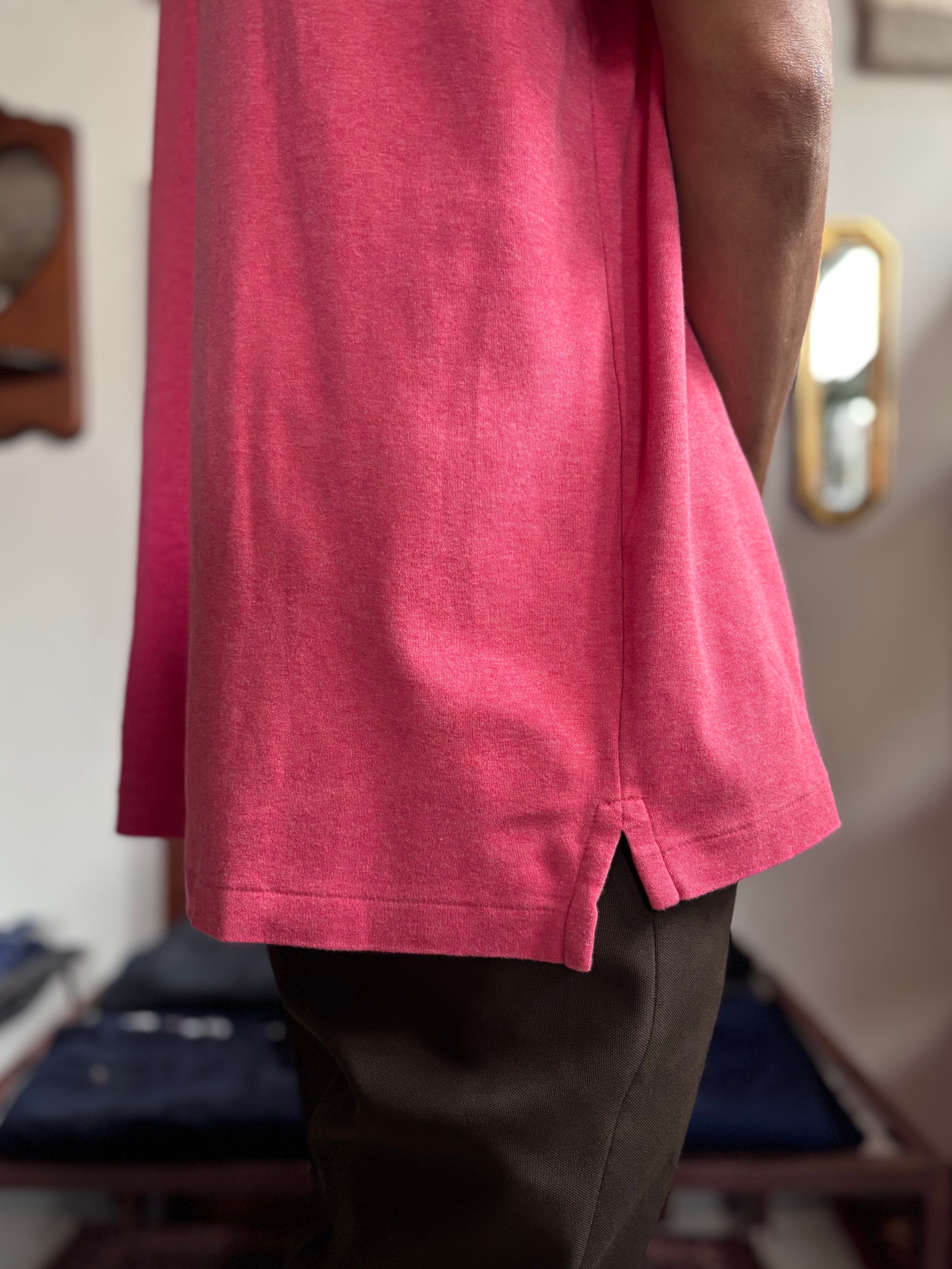 スムースな肌触りのTシャツ生地。柔らかい印象のウォッシュドピンクカラー。リラックスフィット。スリット入りのロングテール仕様。さほど着用感を感じない綺麗なコンディション。