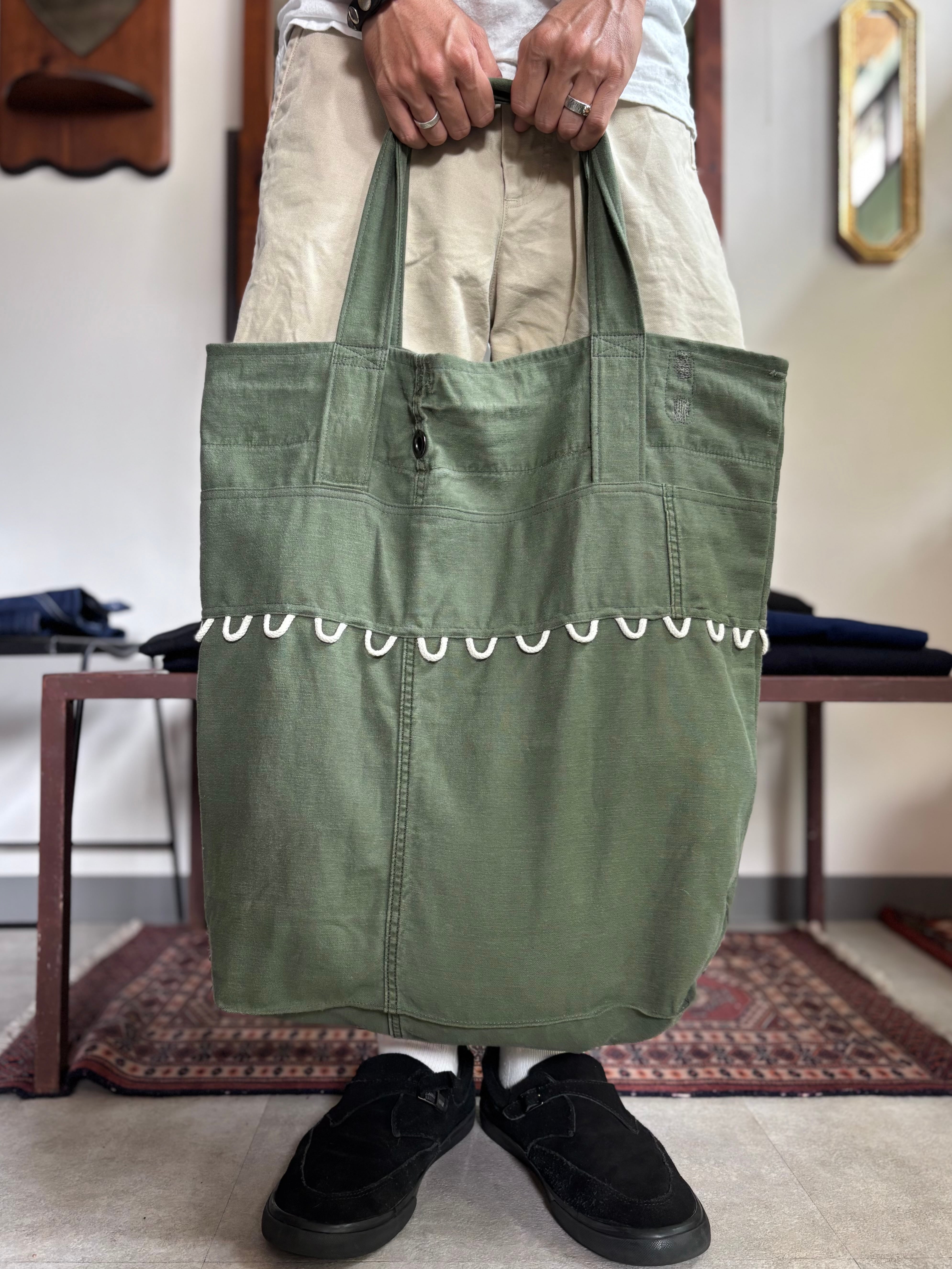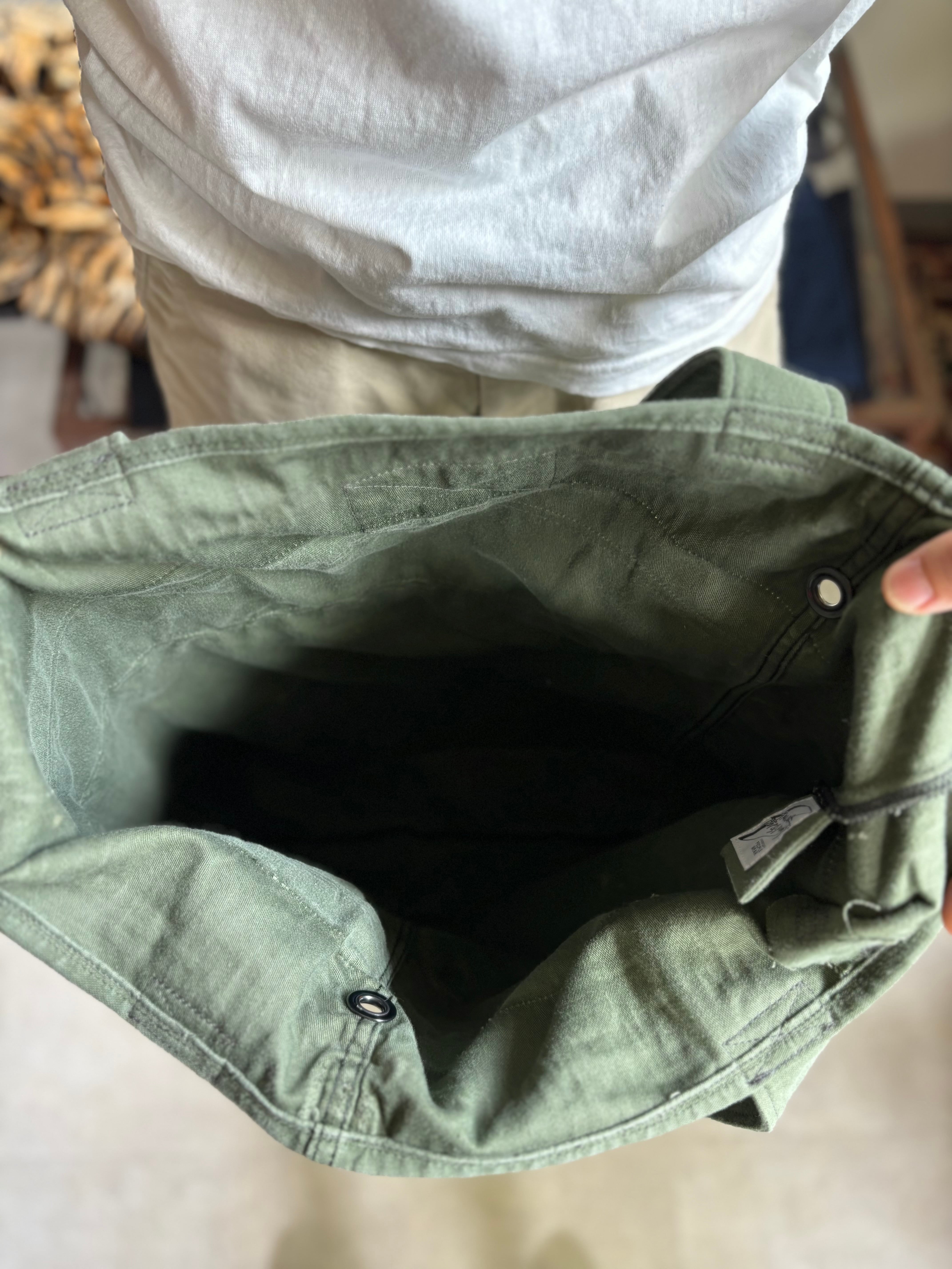 US ミリタリーのランドリーバッグを用いたアップサイクルトート。ビンテージらしい色褪せ感のコットンサテン生地。カギなどを下げることができるDカン付き。コットンのドローコードを再利用し、フリンジのようなフックを全面にあしらっています。