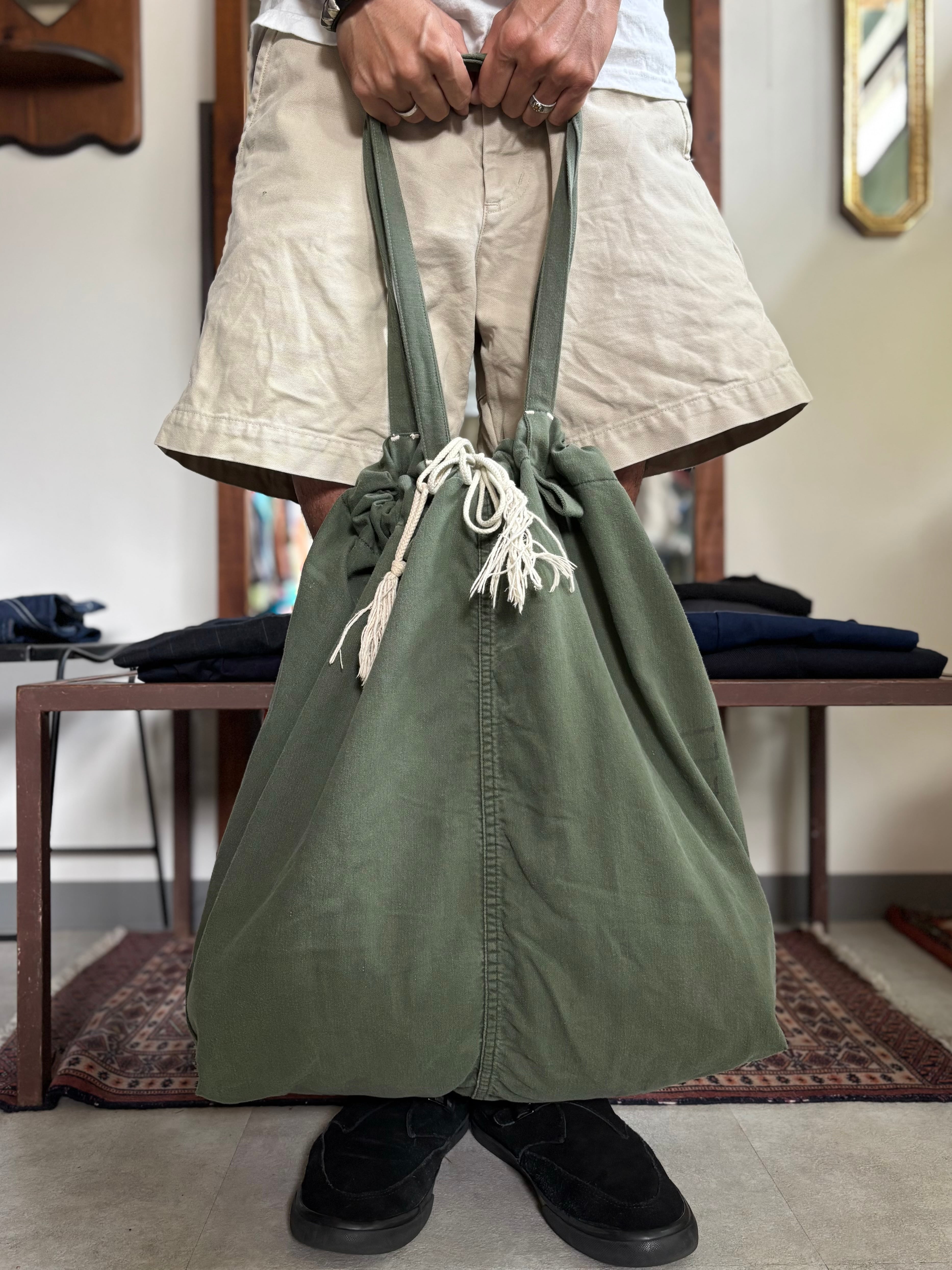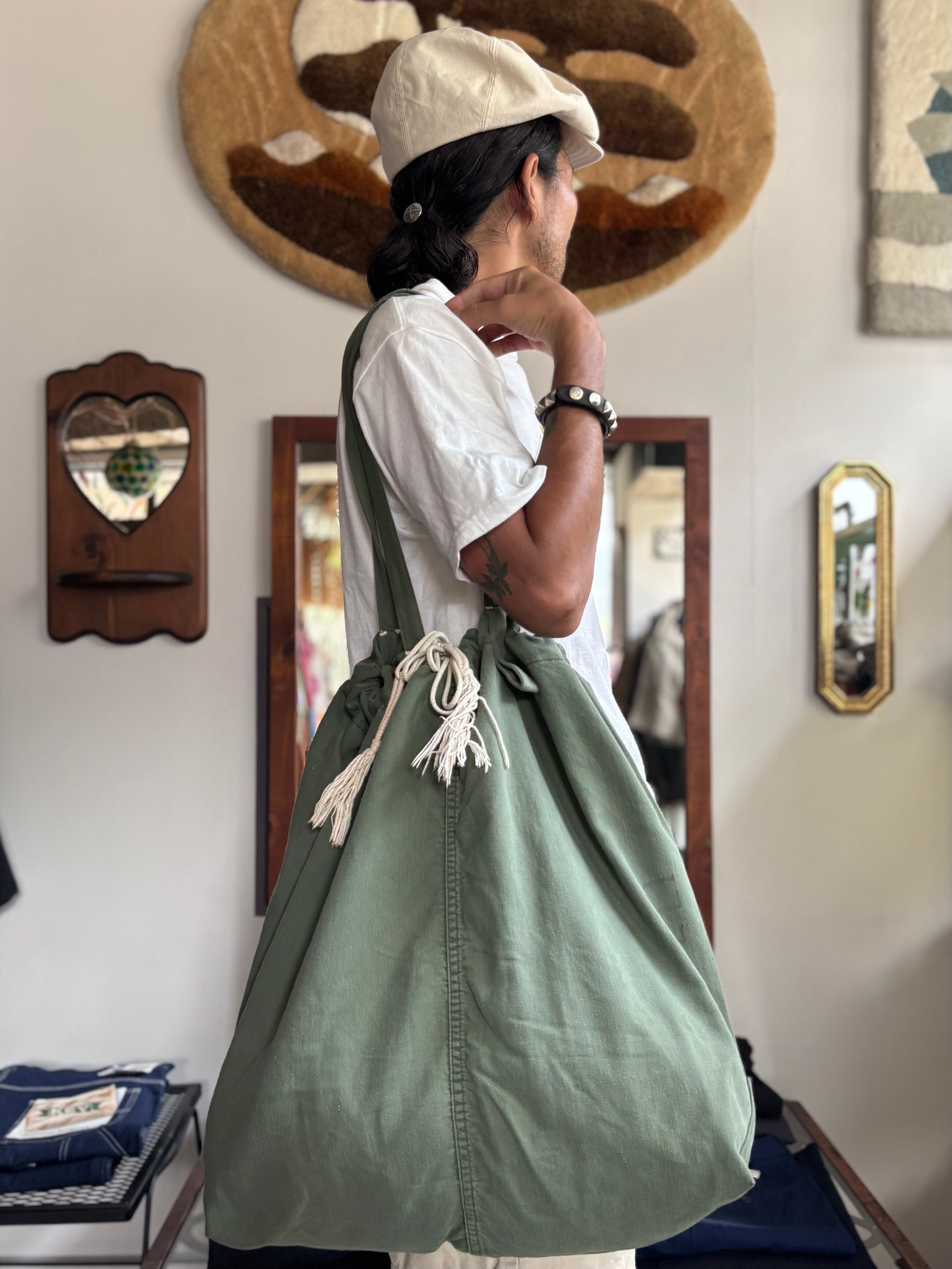 US ミリタリーのランドリーバッグを用いたアップサイクルトート。ビンテージらしい色褪せ感のコットンサテン生地。バッグ両サイドに手書きのネーム入り。
