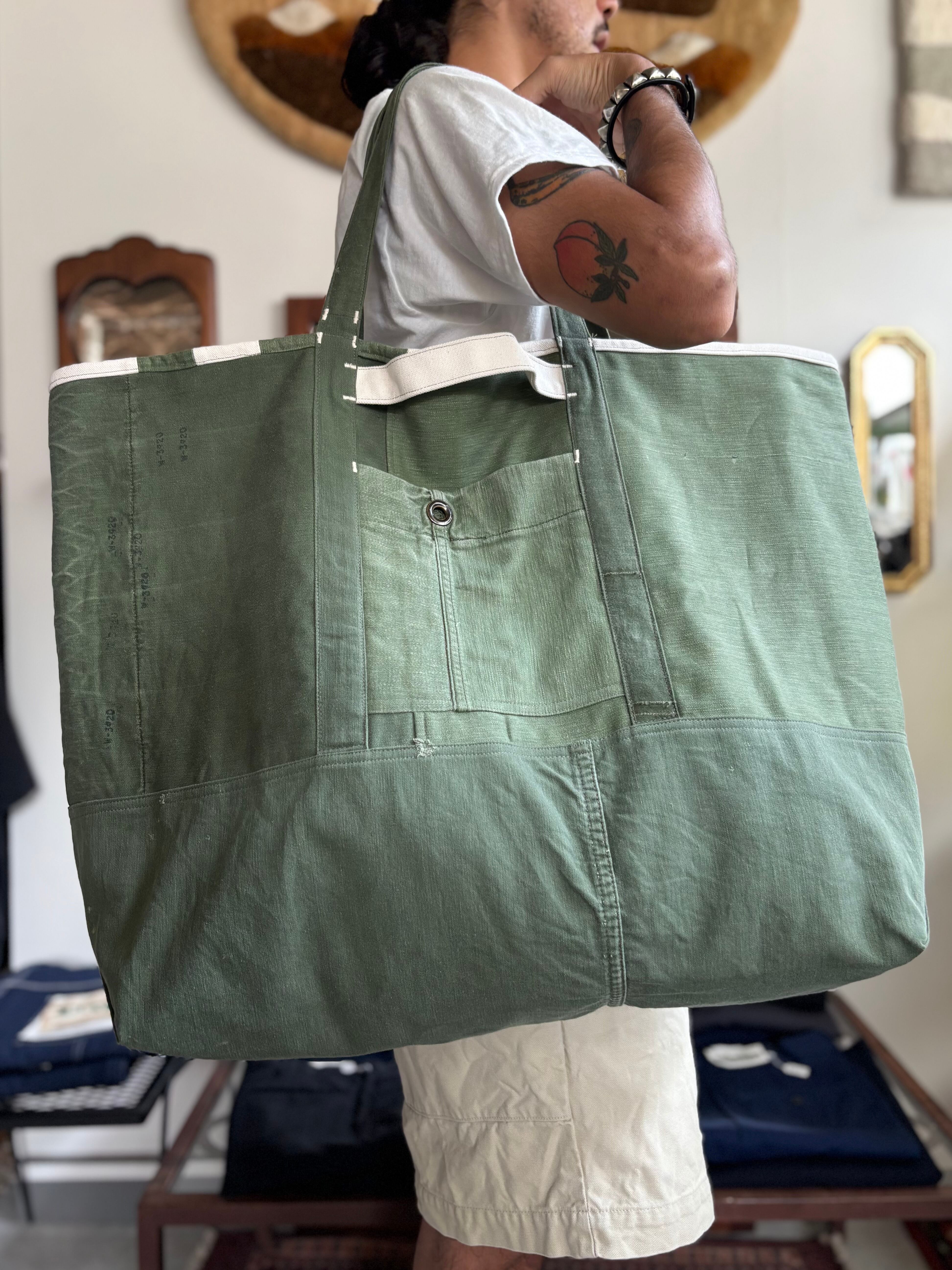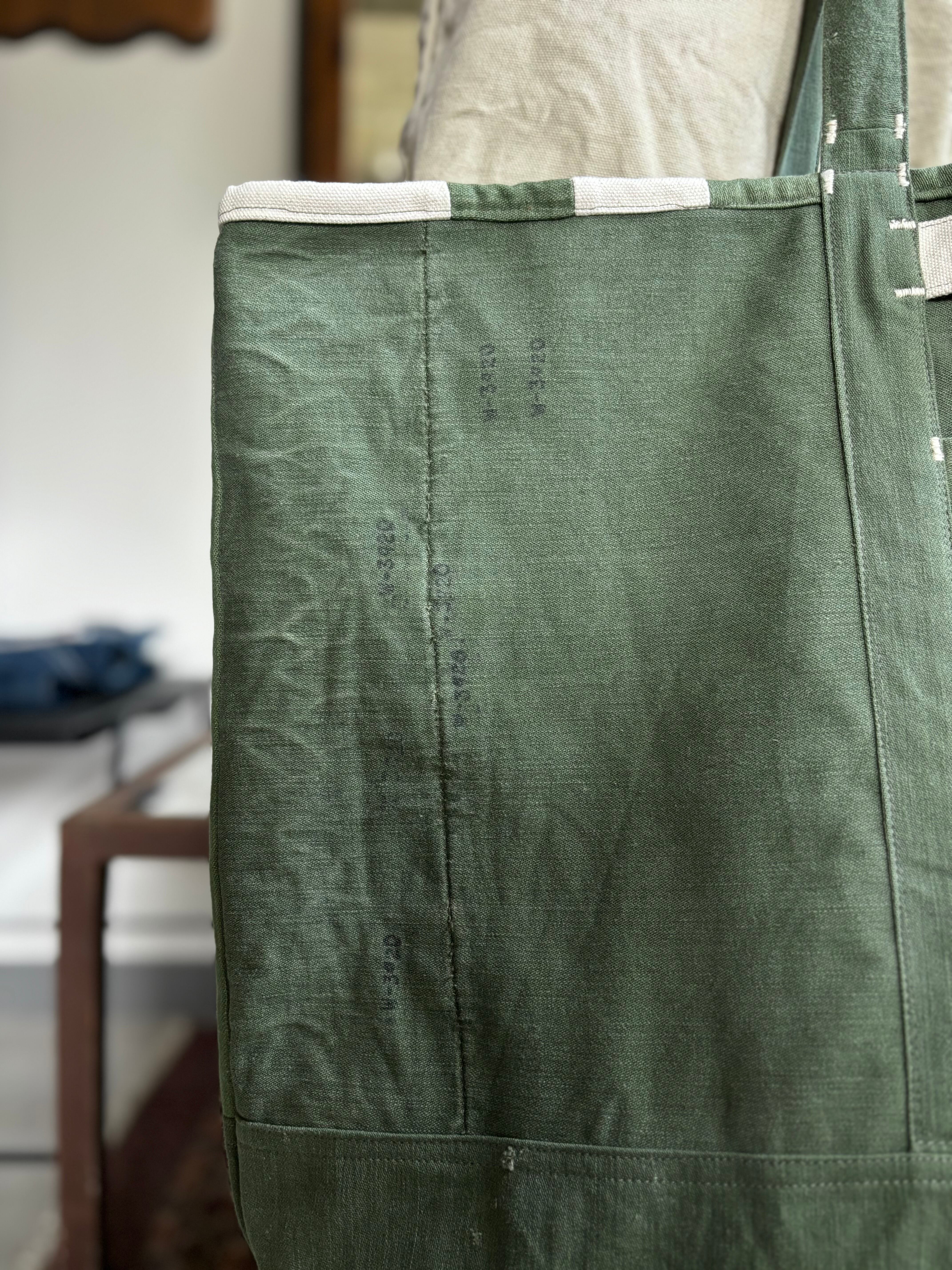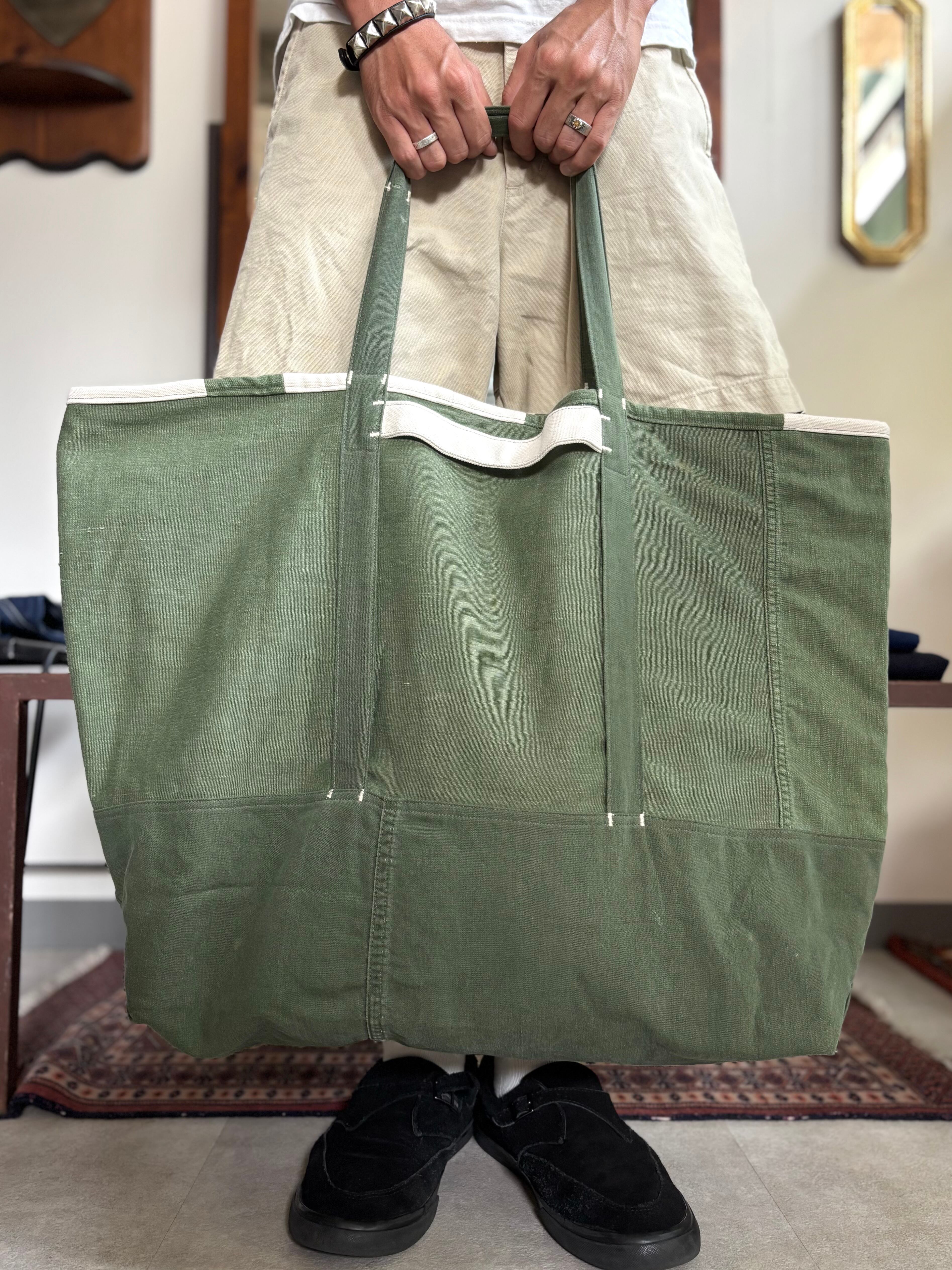 US ミリタリーのランドリーバッグを用いたアップサイクルトート。ライナーにキャンバスの中張り付き。フロント部分にポケット、内部にA4サイズのポケット付き。