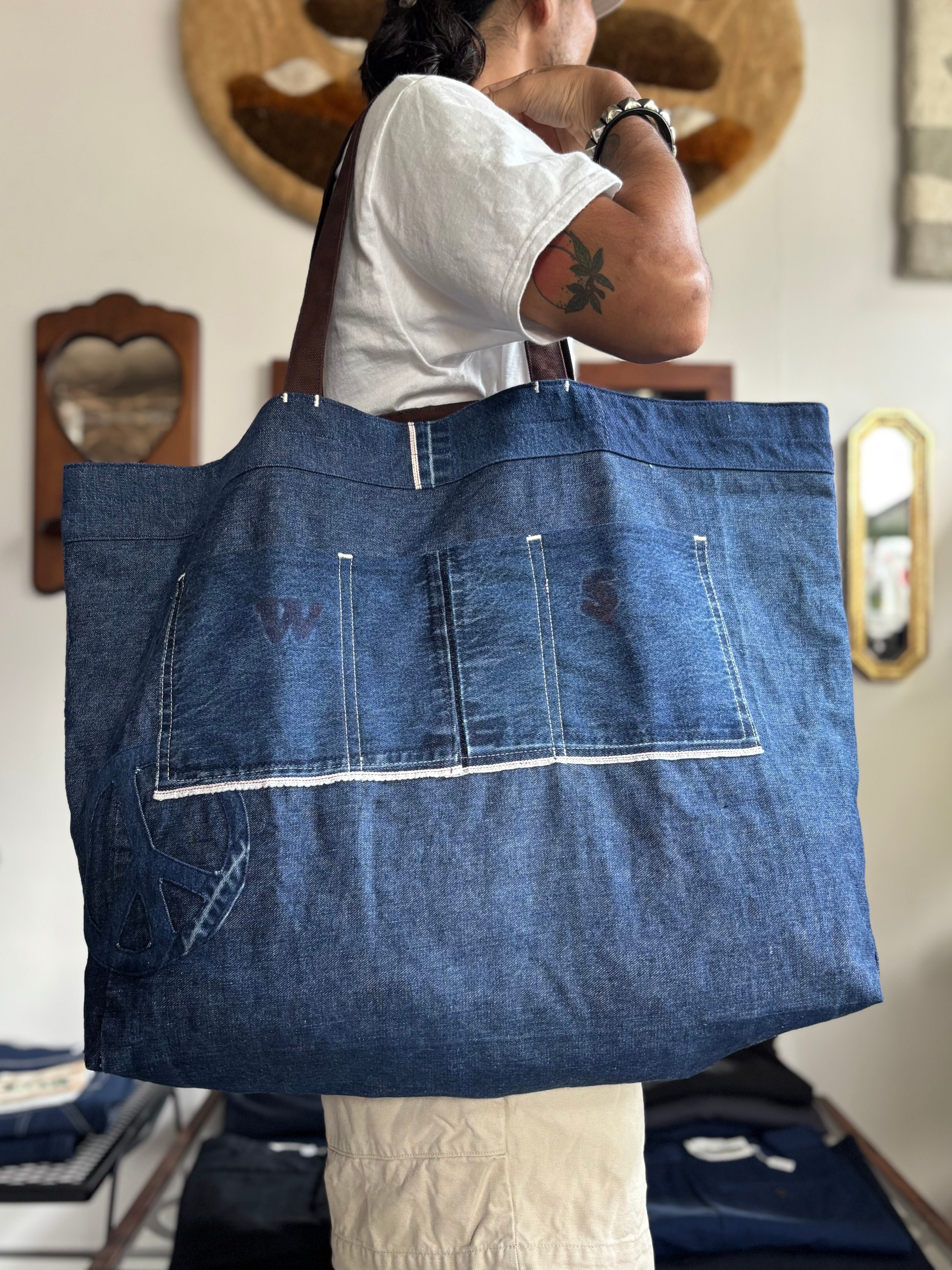 vintageのインディゴランドリーバッグと、エプロンを用いたアップサイクルトート。ビンテージらしい濃淡に、耳付きの良質生地。バッグフロントにエプロンのポケットを転用したポケット付き。ポケット下にピースマークのアップリケ付き。