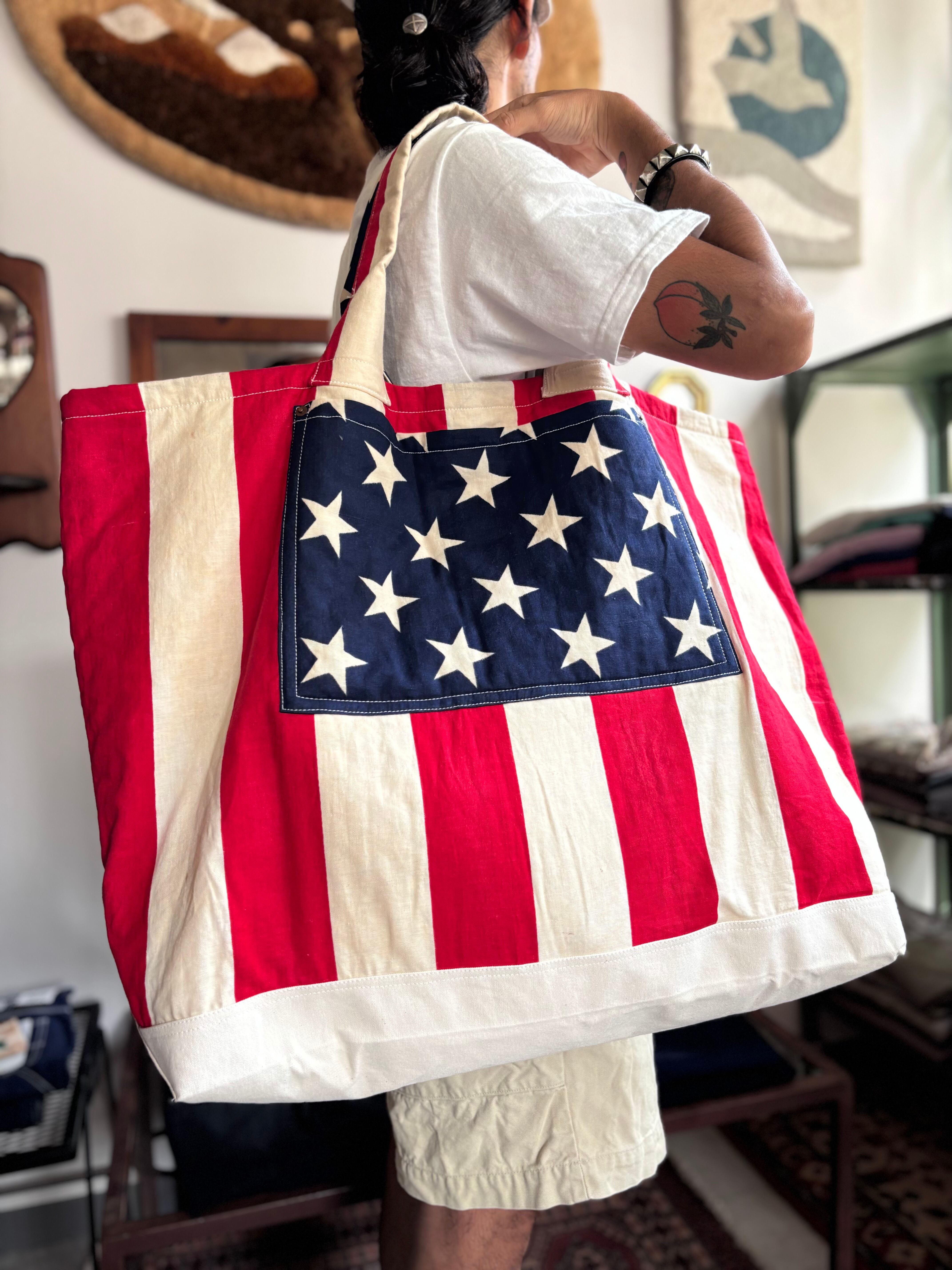 60s のビンテージフラッグを用いたトートバッグ。強度を出すため、ライナーにキルティング、底部にキャンバス生地貼り。バッグ前面と、内部にポケット付き。