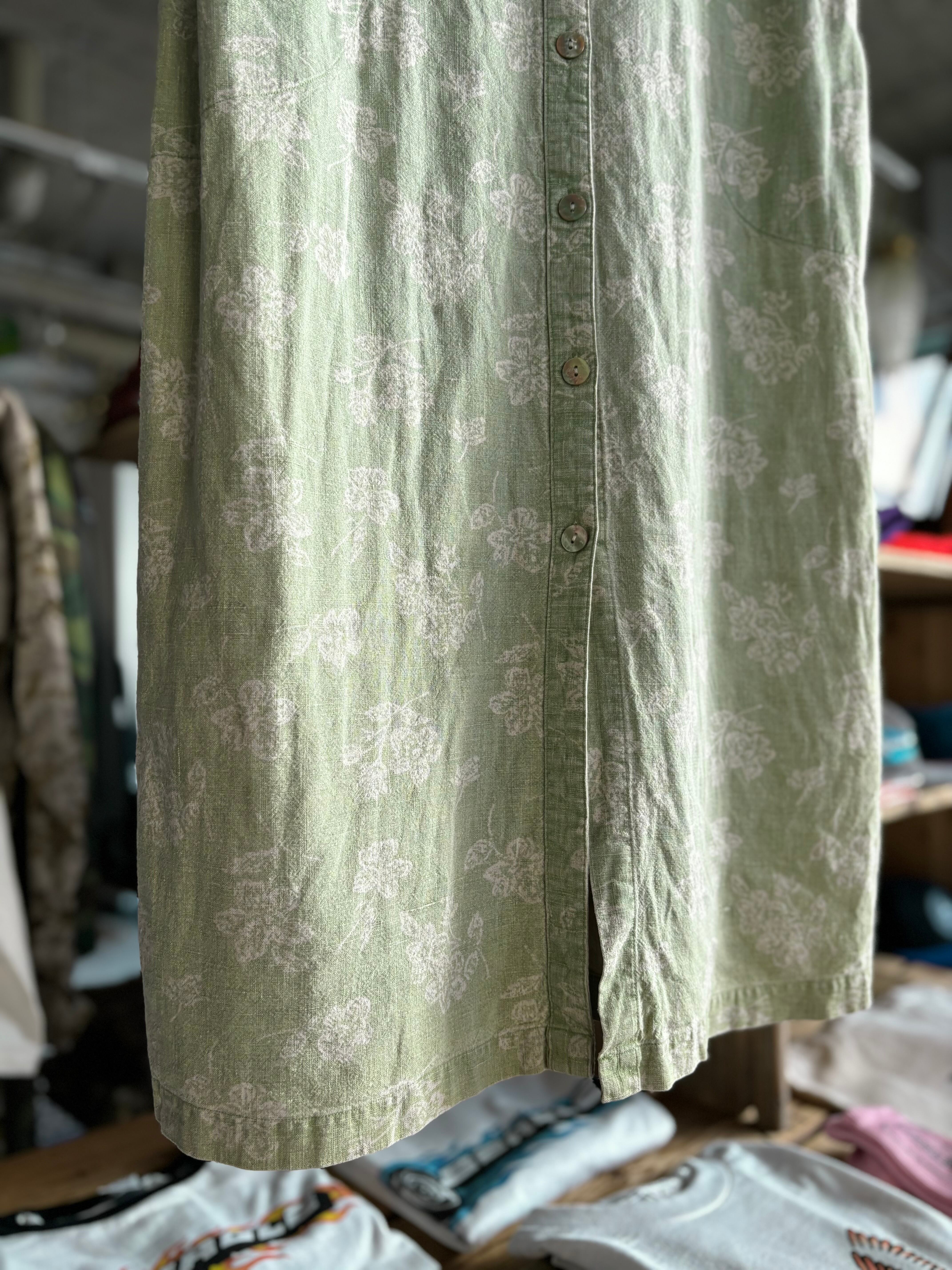 リネン×コットン混紡のしっかりとした生地感。フロントボタンのフルオープン仕様。やさしいペールグリーンにボタニカル総柄。1枚で着るのはもちろん、レイヤードコーデにも抜群です◎