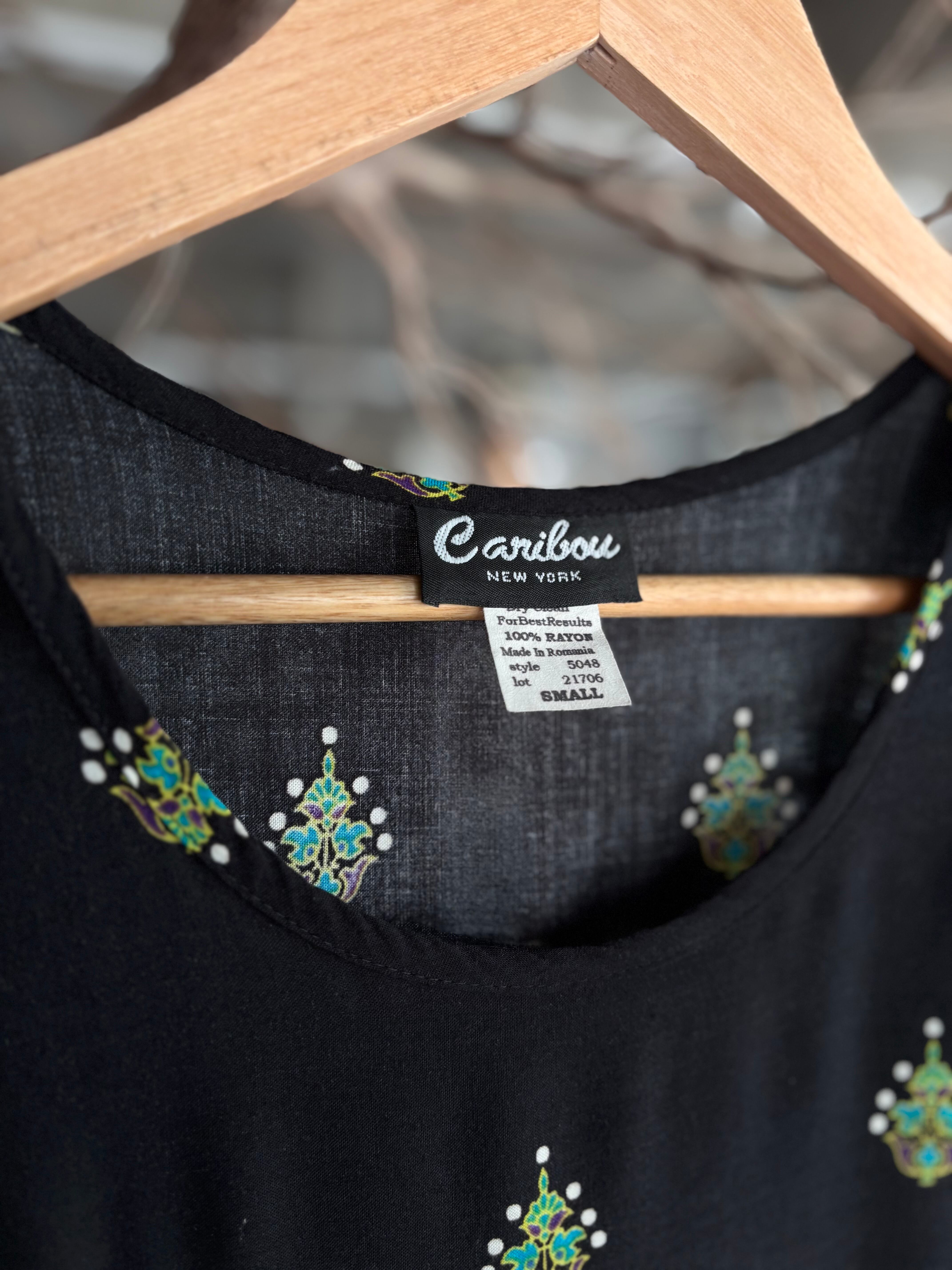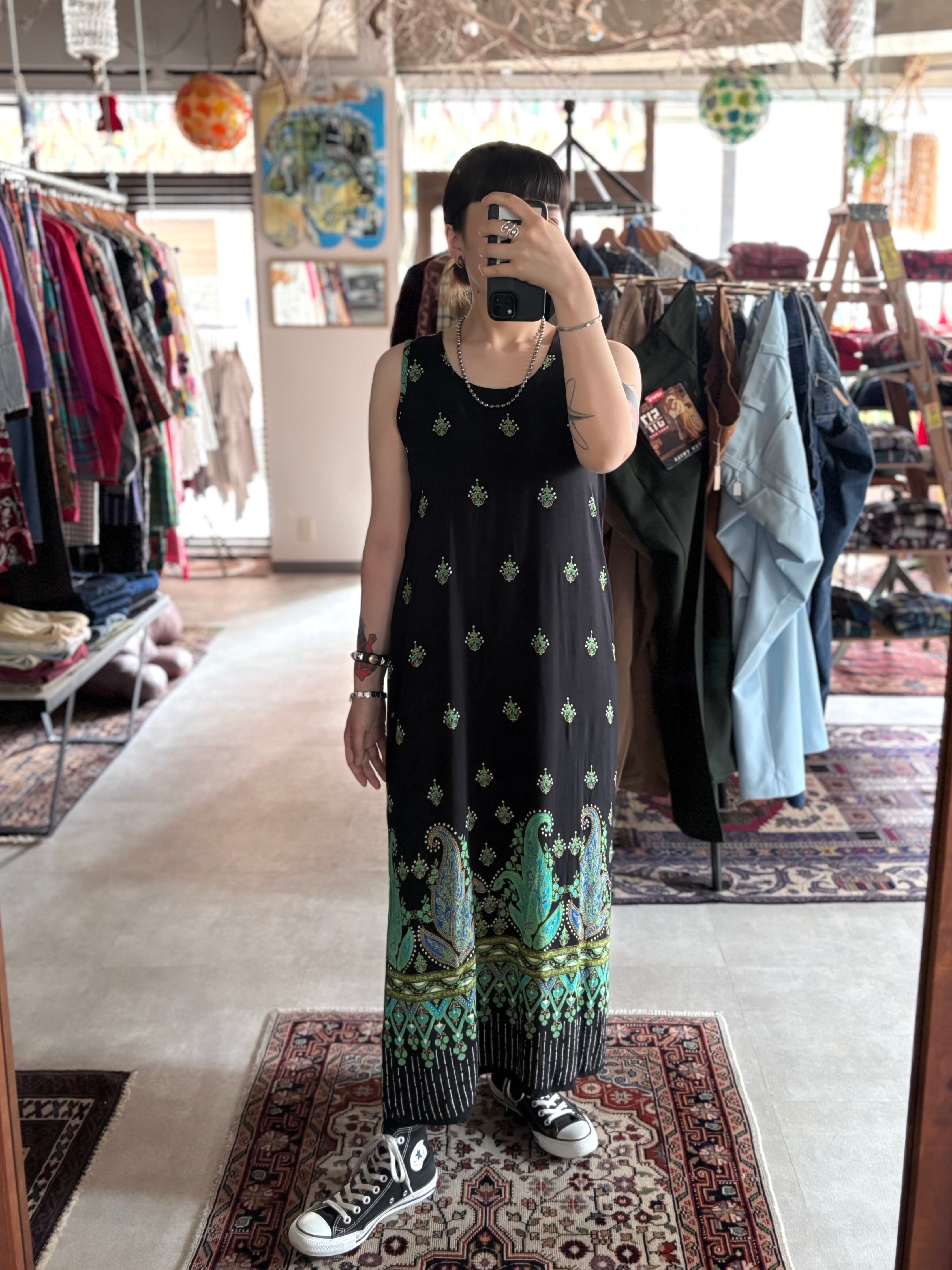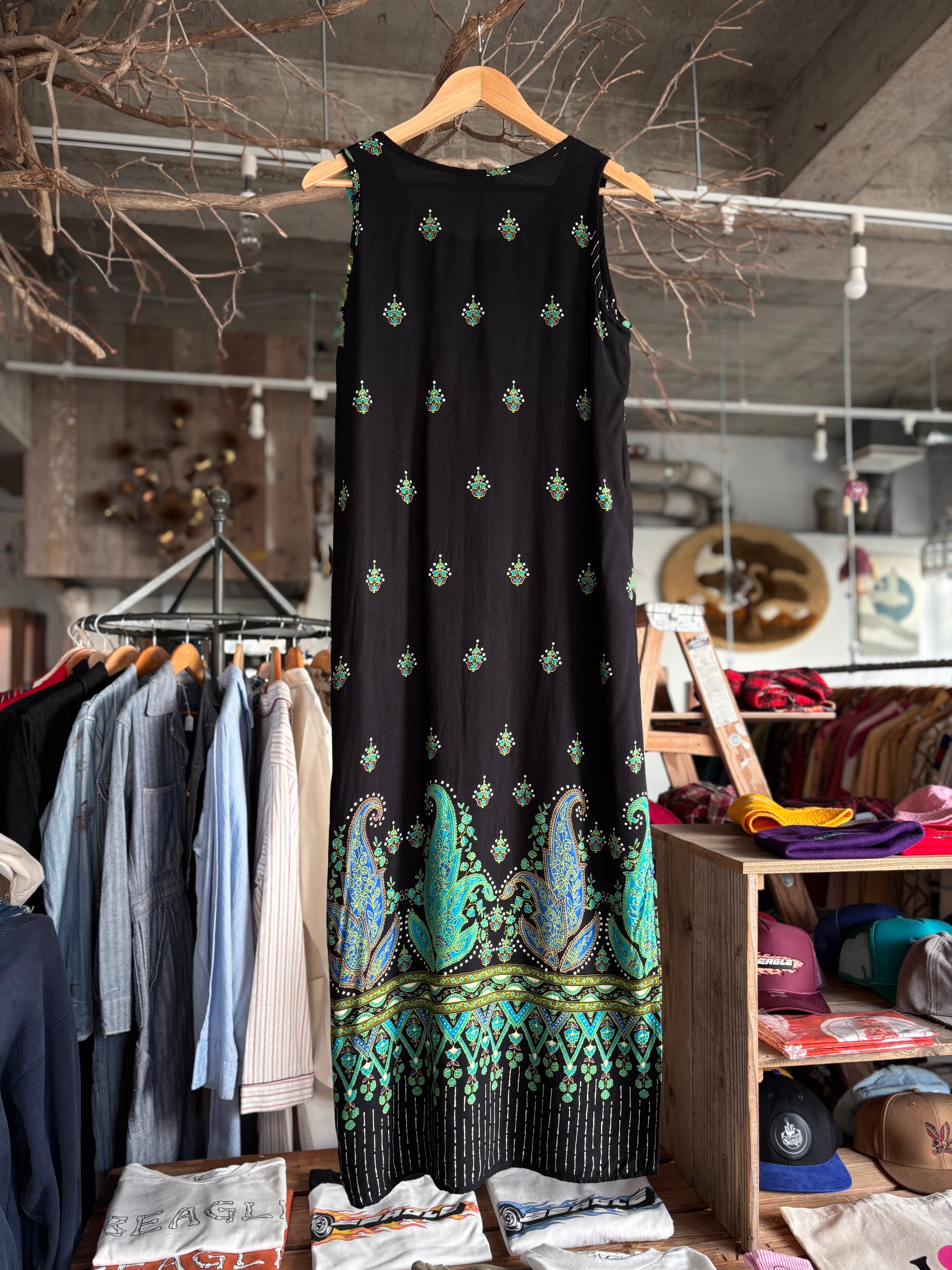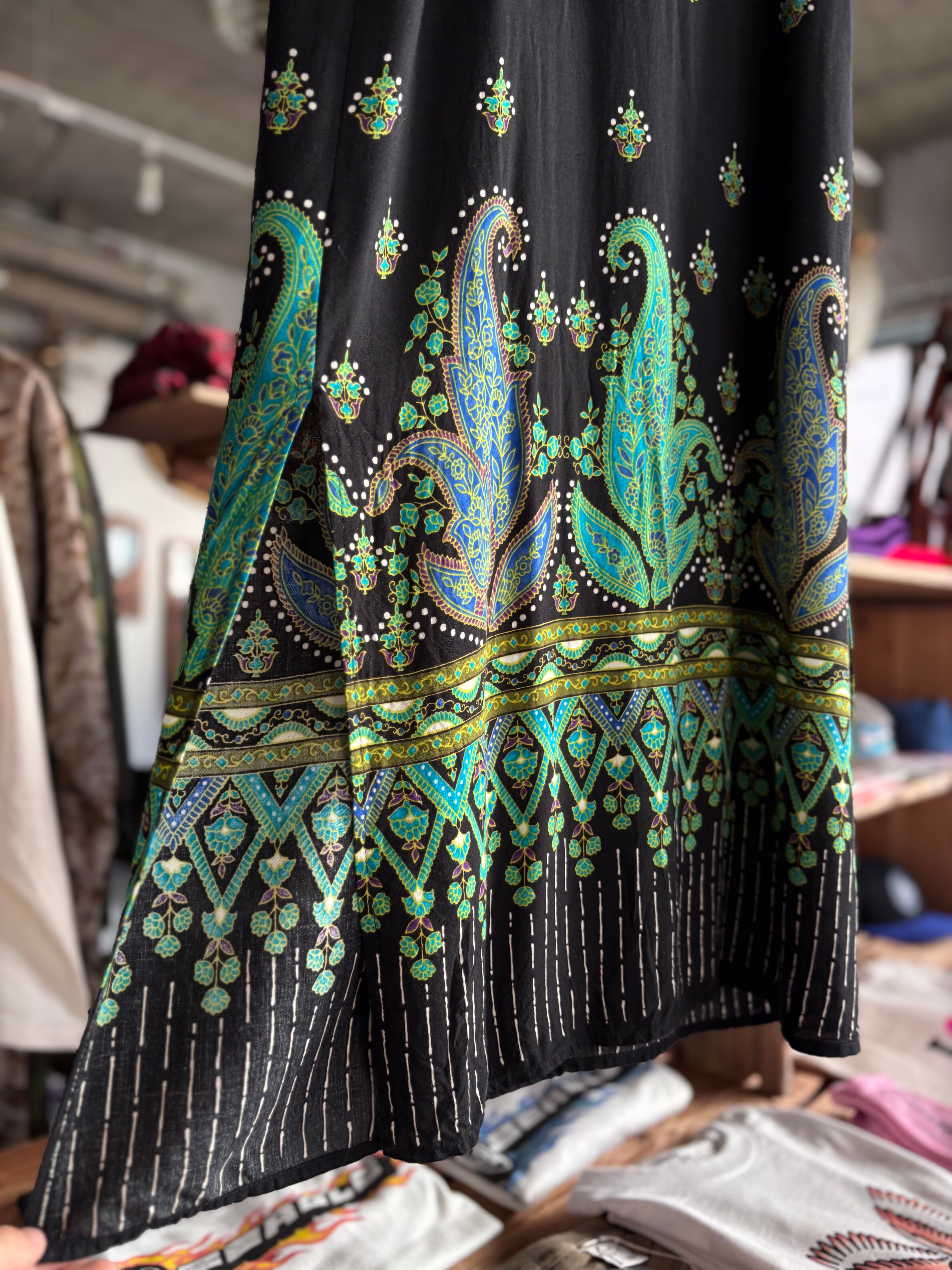 やわらかく肌あたりの良いレーヨン生地。シンプルなプルオーバー仕様。ブラックベースにブルー基調のペイズリーパターン。さほど着用感のない綺麗なコンディション。1枚で決まるワンピースをお探しの方におすすめです◎