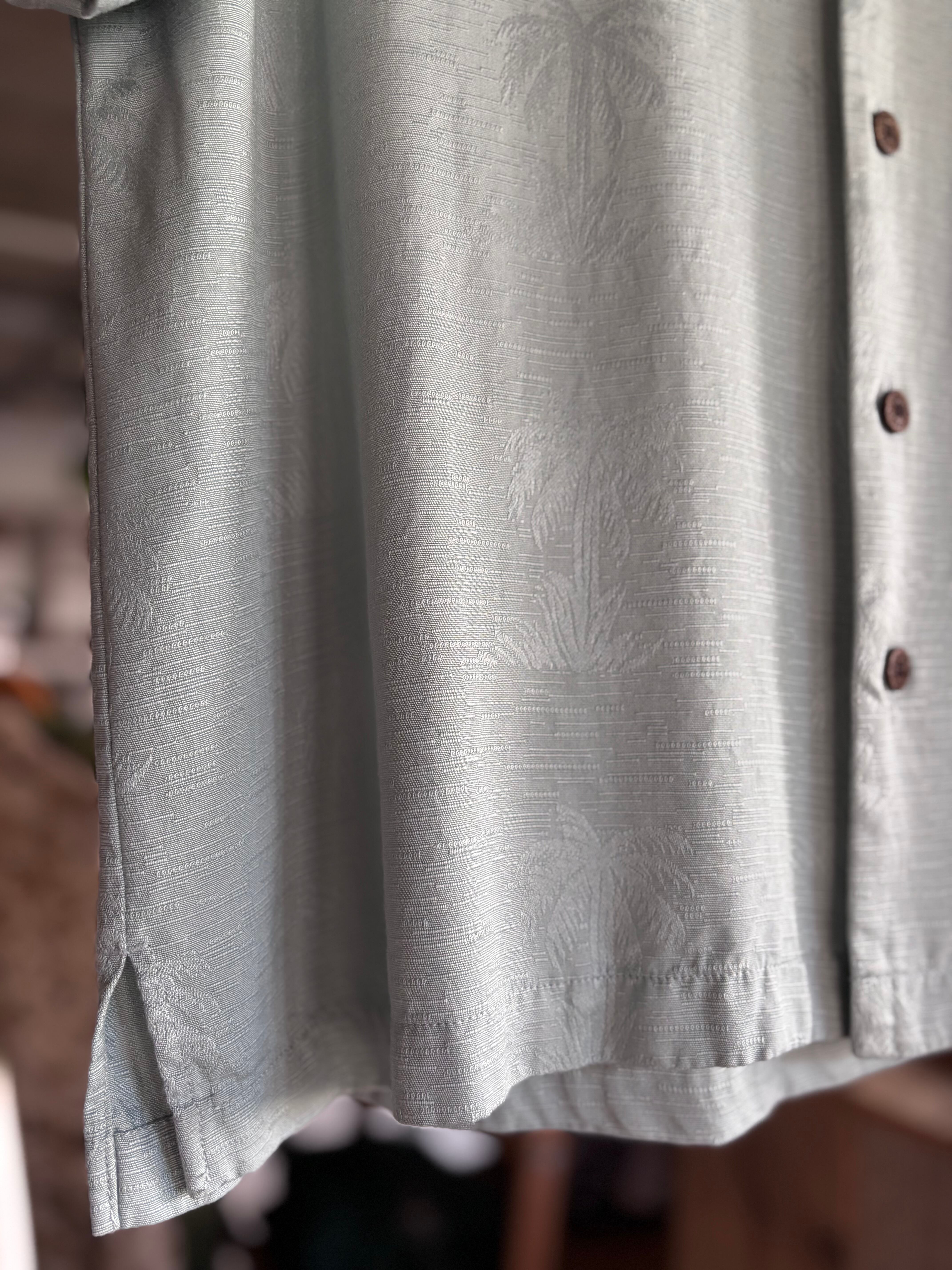 程よい厚みのレーヨン素材。ライトブルーのボタニカル織柄生地。リラックスシルエット。ループボタン仕様。ユニセックスでいかがでしょうか◎