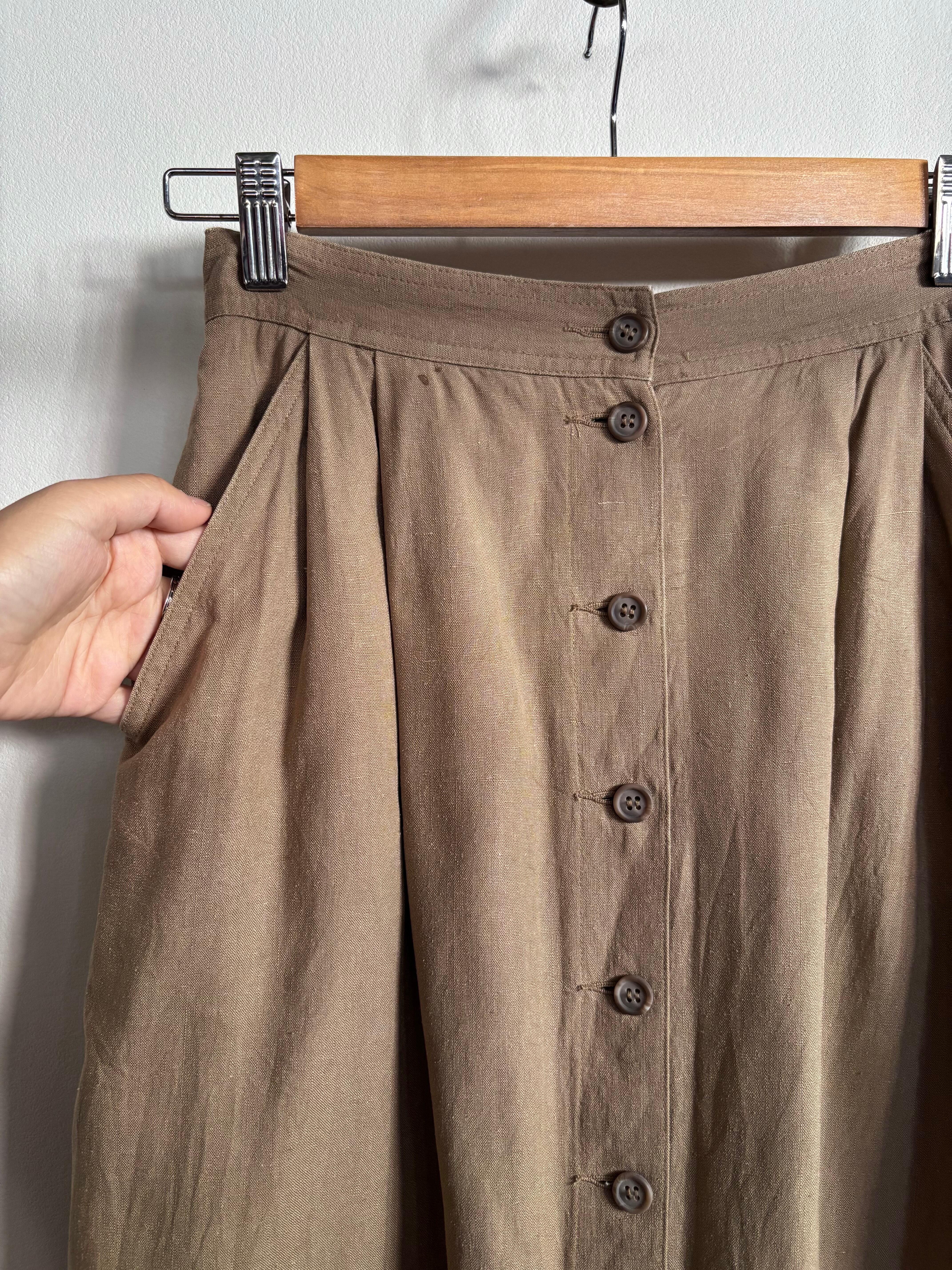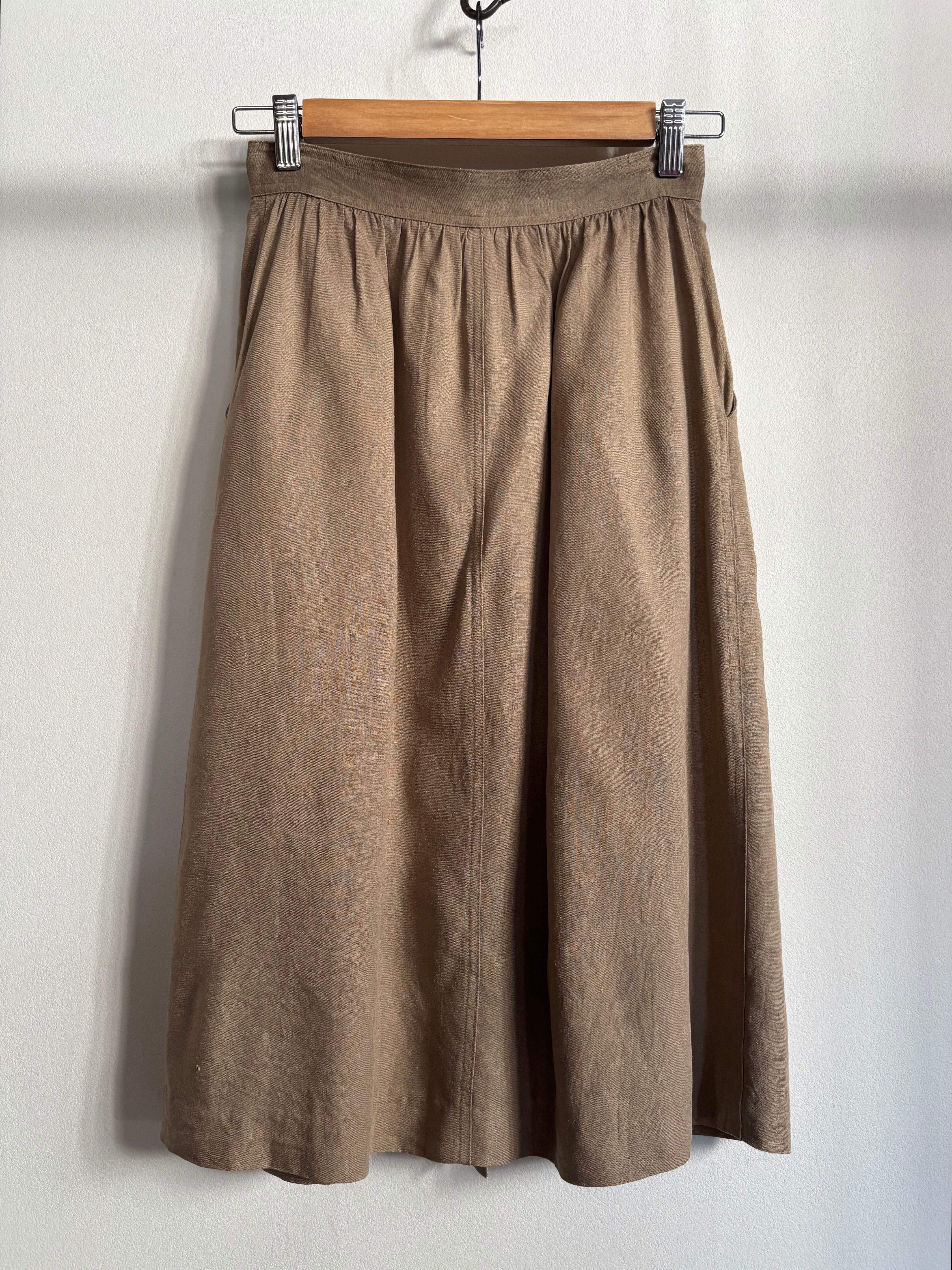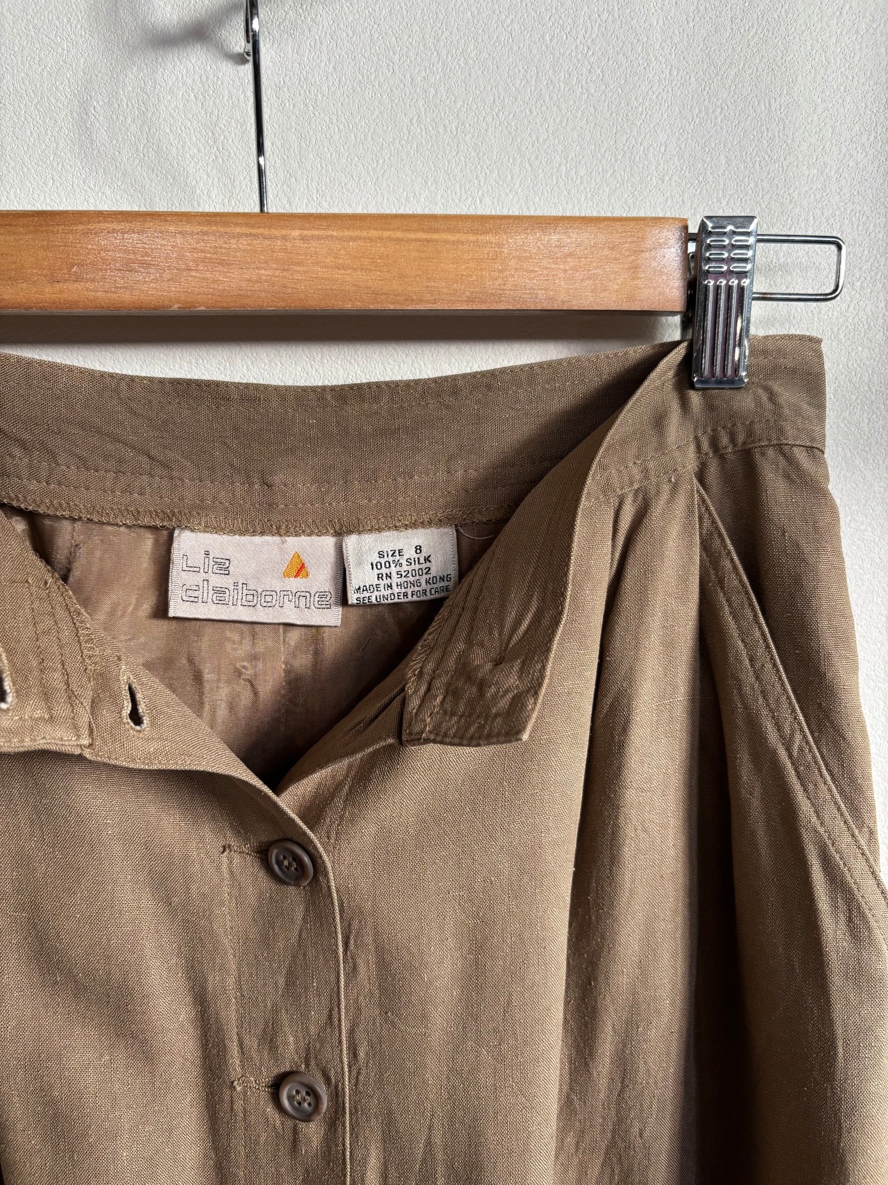 90年代生産のシルク100%スカート。Liz claiborne社製。しっかりとした厚みがあり、ややドライな生地感。合わせ易いカーキベージュカラー。同色アセテート生地の裏地付き。フロントボタン仕様でポケット付き。程よい丈感で様々なスタイルに取り入れ易いスカートです。