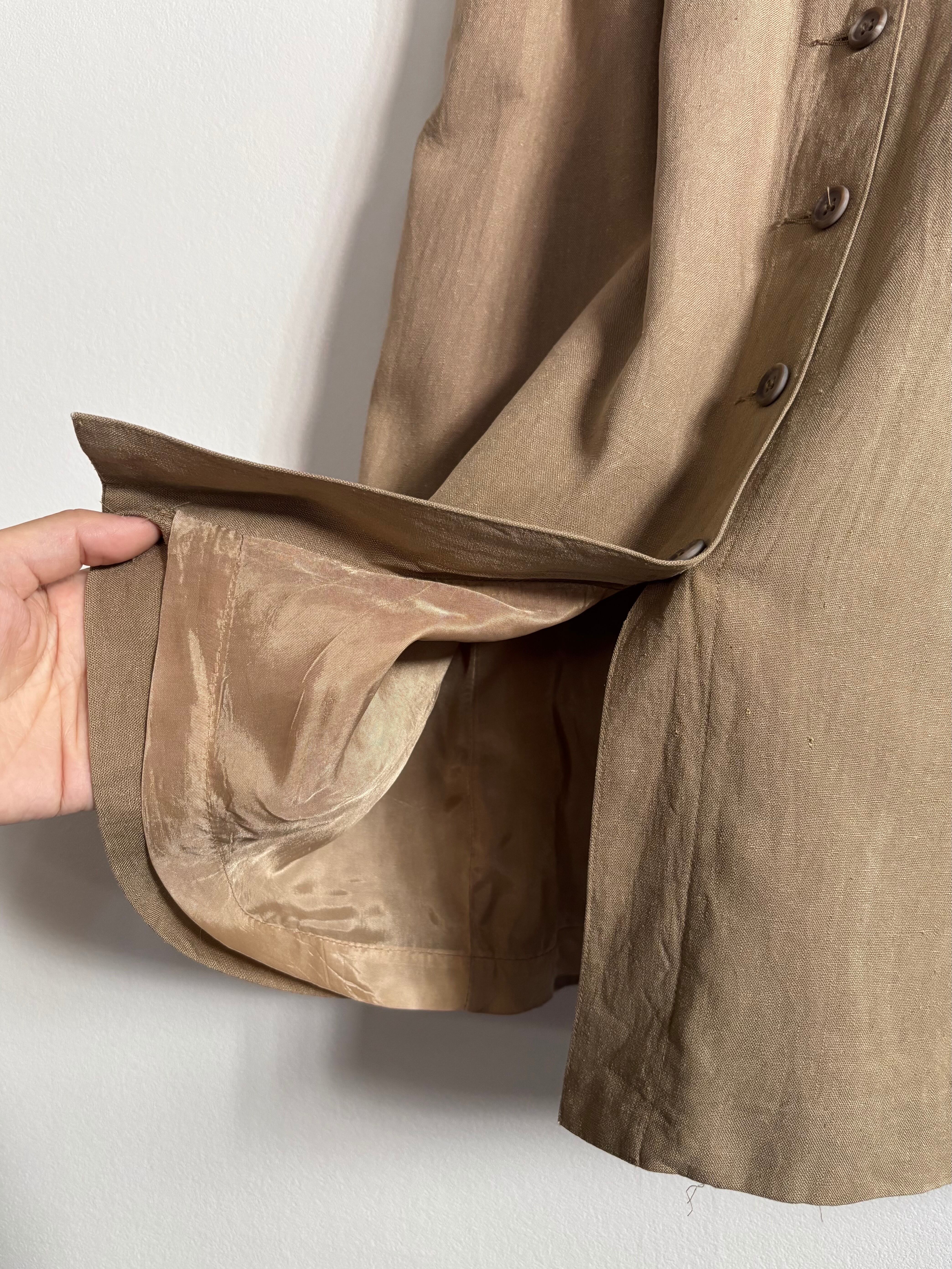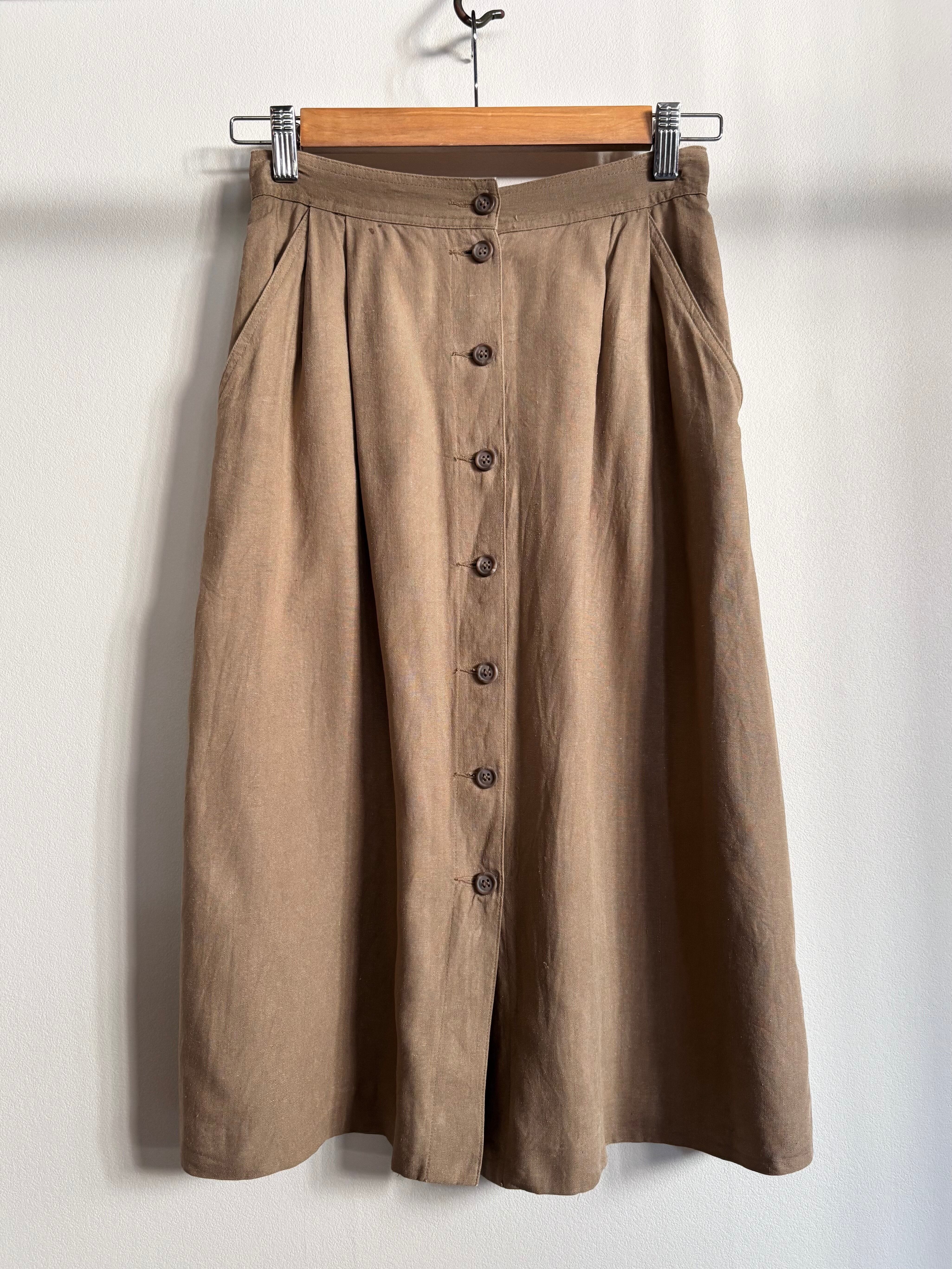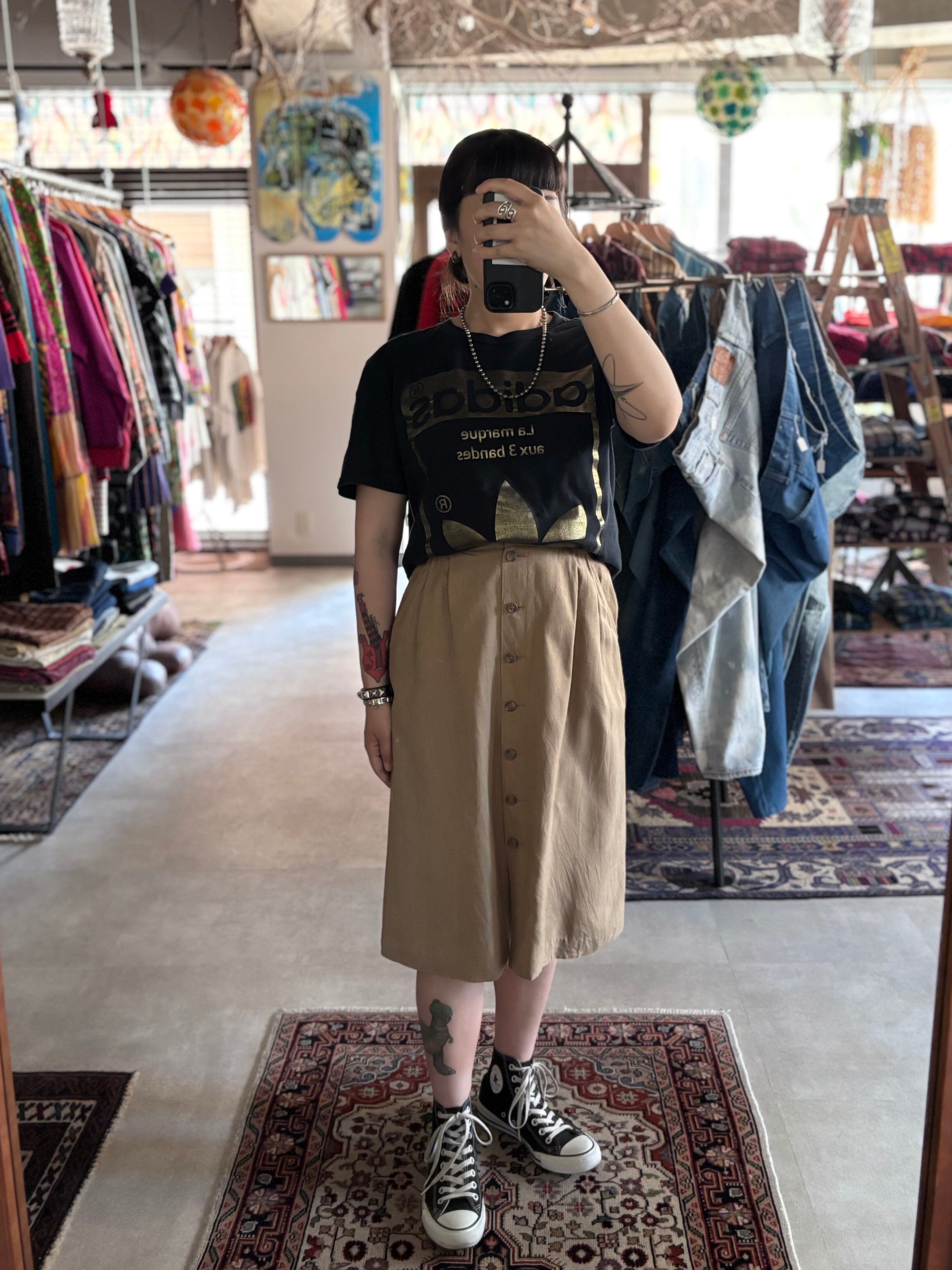 90年代生産のシルク100%スカート。Liz claiborne社製。しっかりとした厚みがあり、ややドライな生地感。合わせ易いカーキベージュカラー。同色アセテート生地の裏地付き。フロントボタン仕様でポケット付き。程よい丈感で様々なスタイルに取り入れ易いスカートです。