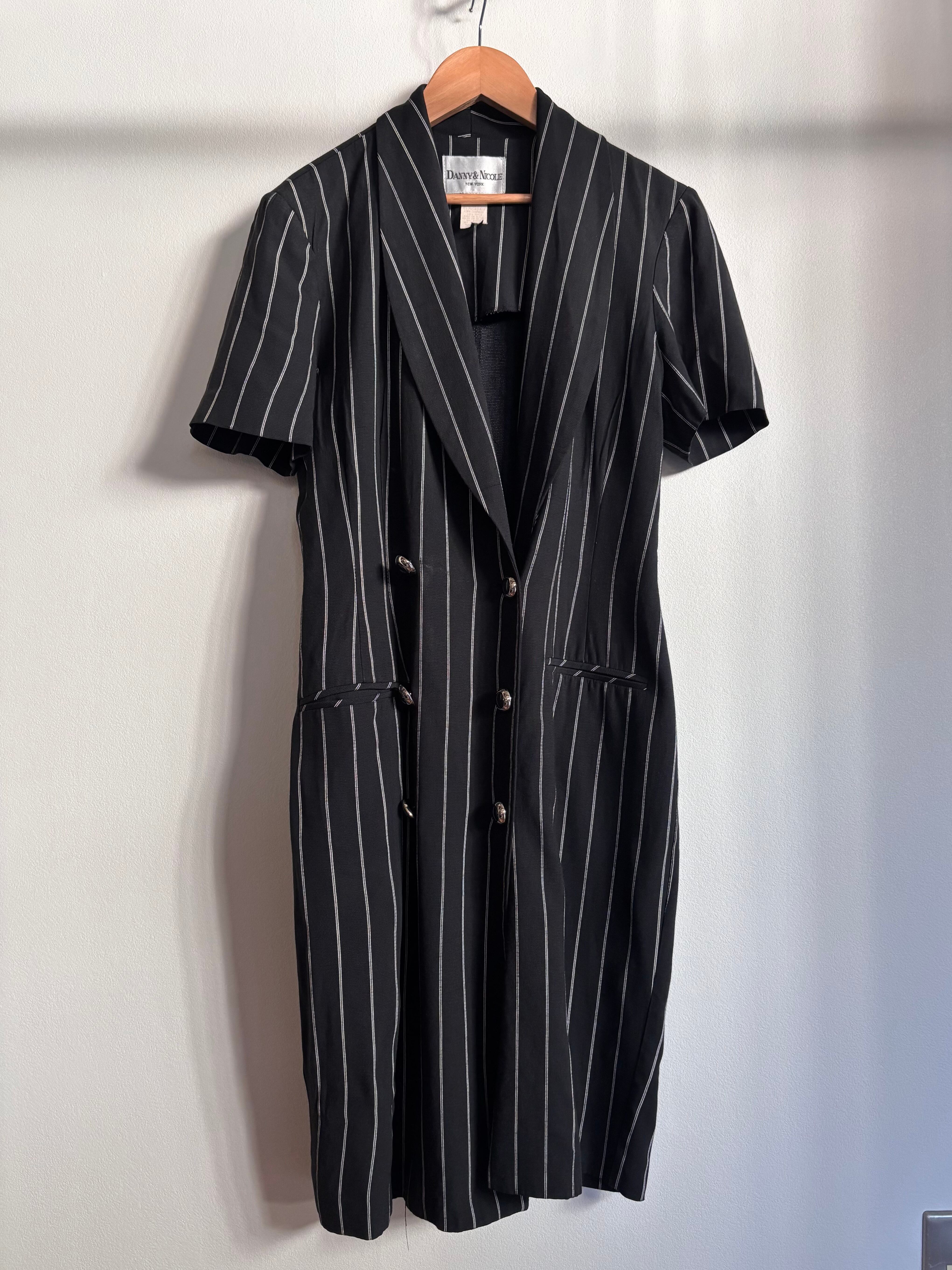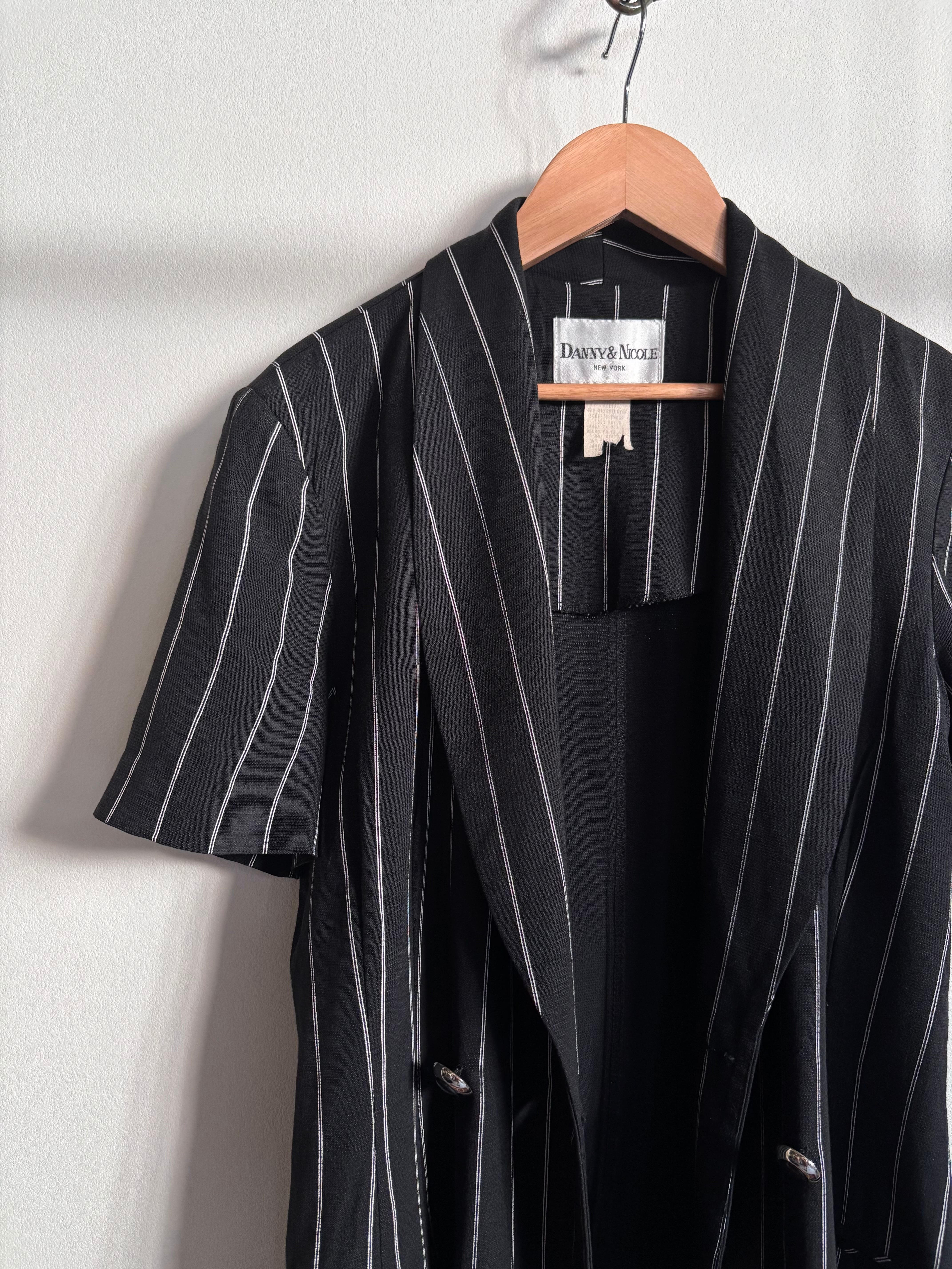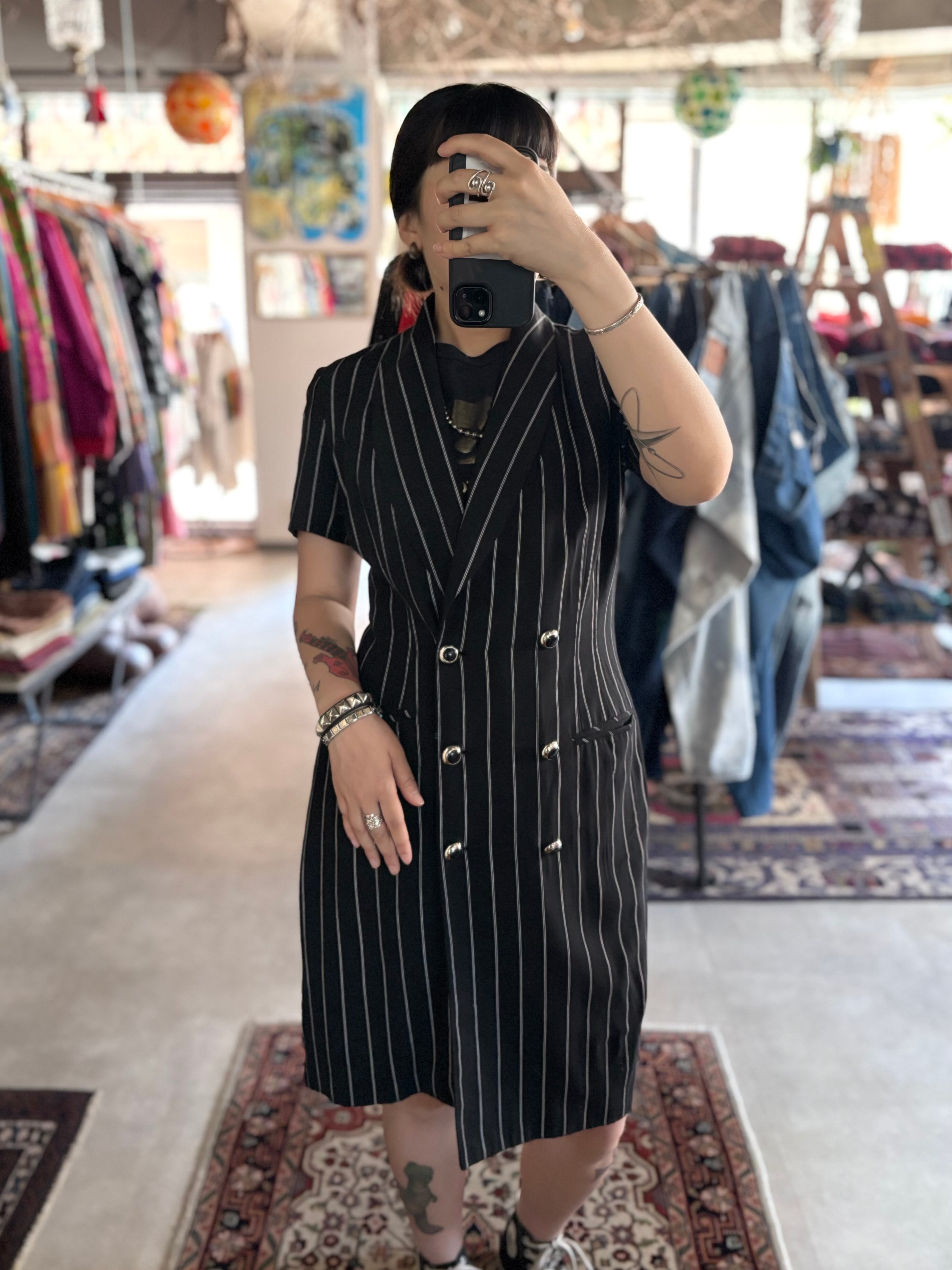 レーヨン×アセテート混紡の半袖ダブルジャケット。しっかりと厚みのある生地感。エレガンスな印象のダブル仕様・ロング丈。フェイクポケット。ワンピースとして着るのはもちろん、レイヤードスタイルにもぴったりです。