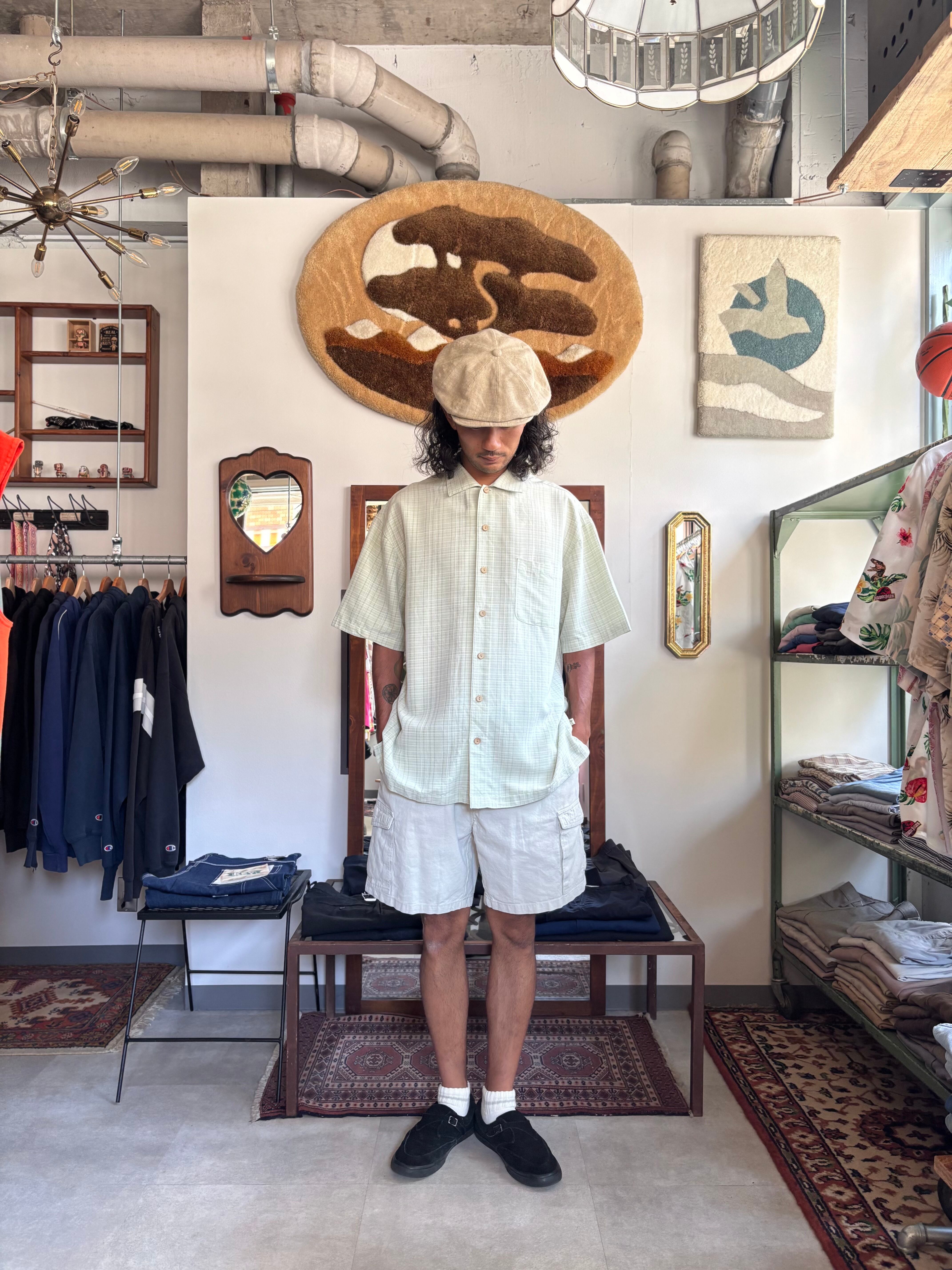 しっかりめの rayon × polyester 素材。メロンのような格子パターン。リラックスフィット。軽いトーンのココナッツボタンに、シンプルな片胸ポケットがとてもお洒落です。