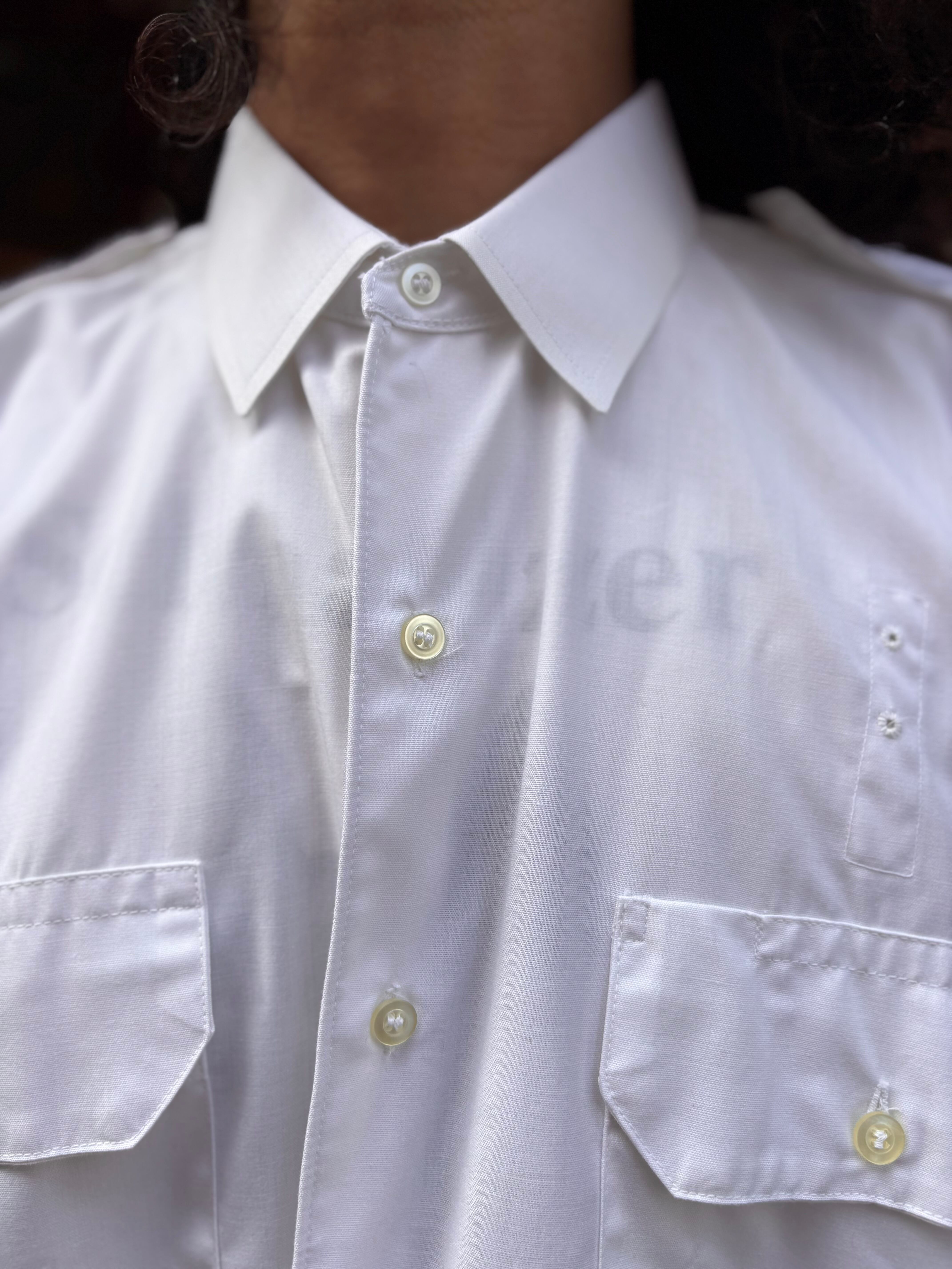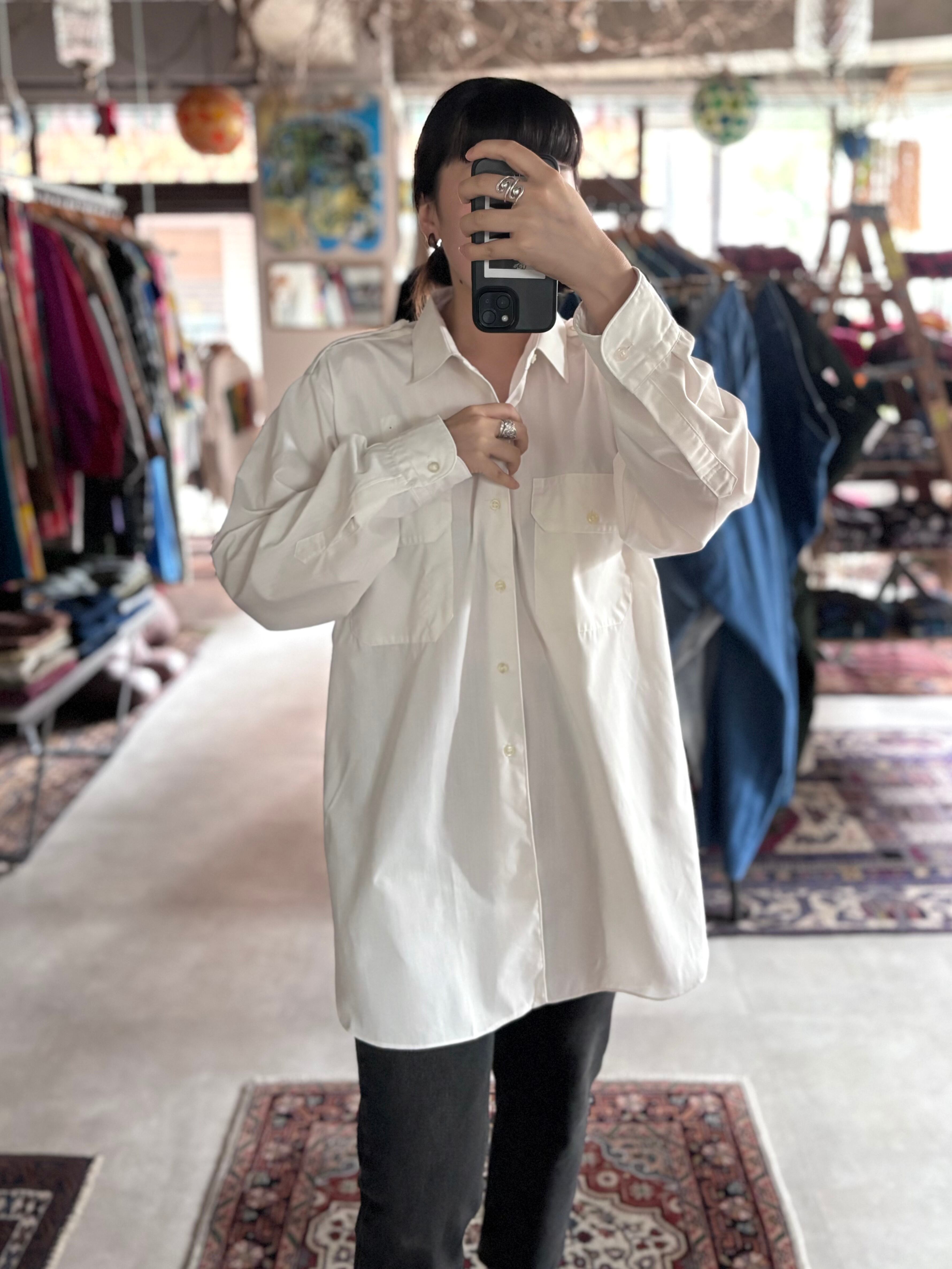 ざらっとしたドライな質感のOLDコットン生地。リラックスフィット。両胸フラップポケットに、エポレット仕様。ネック裏の年号スタンプや、胸の菊穴からユニフォームとして使われていたものと推測。織タグのクオリティも高い上質ビンテージ。オーバーサイズのブラウスとしてもおすすめです。