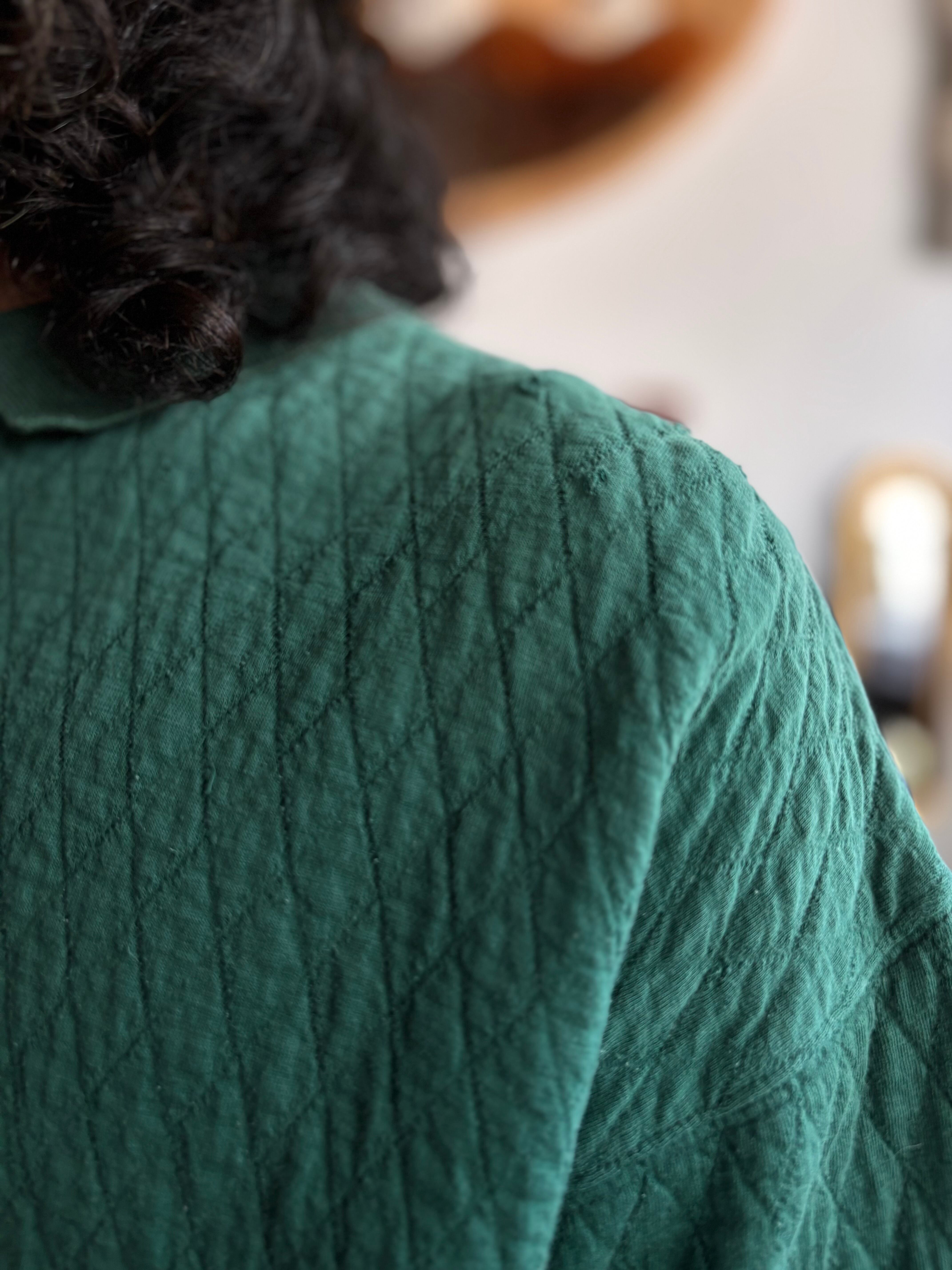 アーガイル調の織柄ファブリック。色褪せたグリーンカラー。 オーセンティックフィット。USA製のビンテージORVIS。クルーネックの内側に襟が付いたクラシカルなスタイル。一枚でとてもお洒落にまとまります。