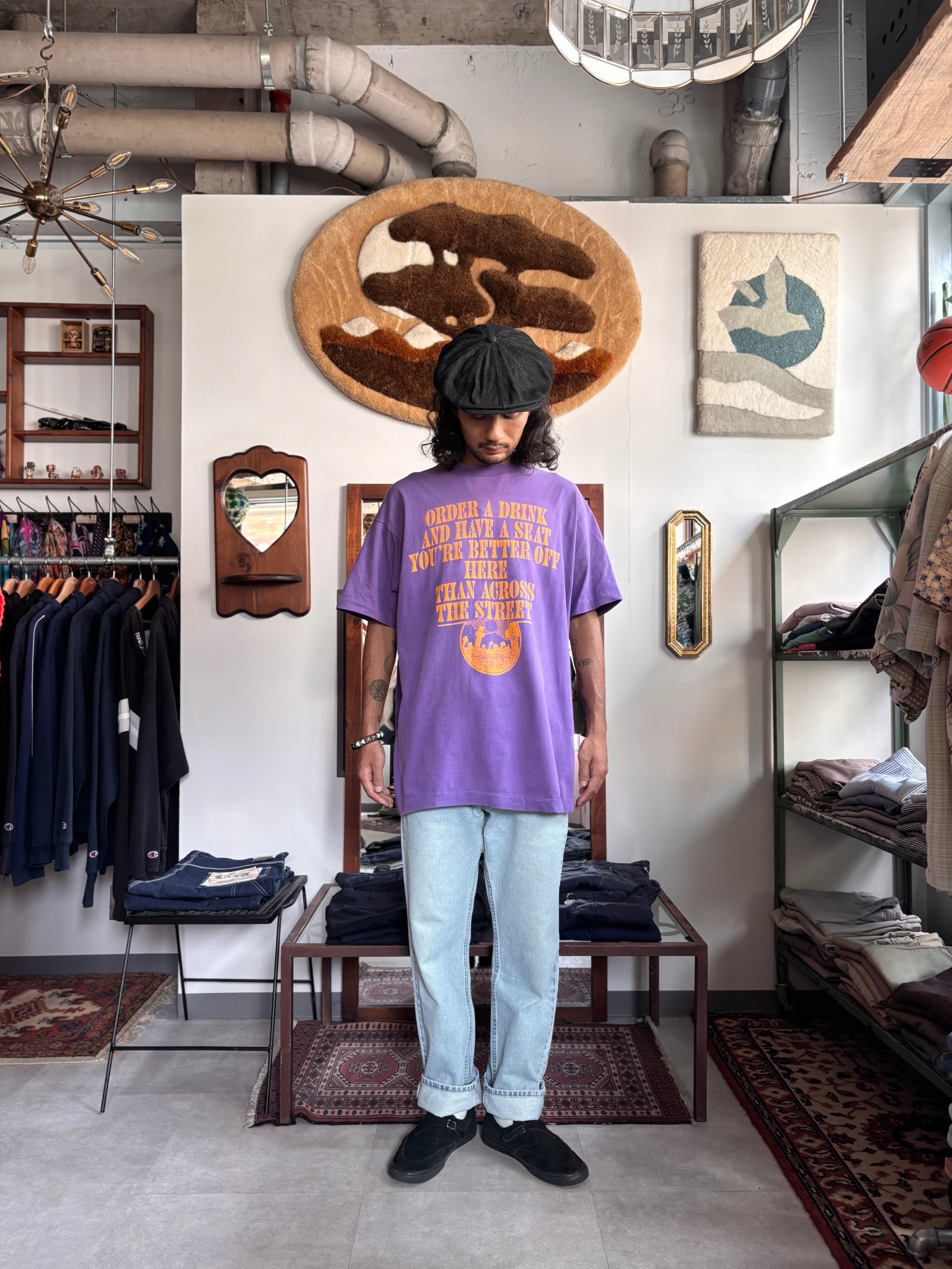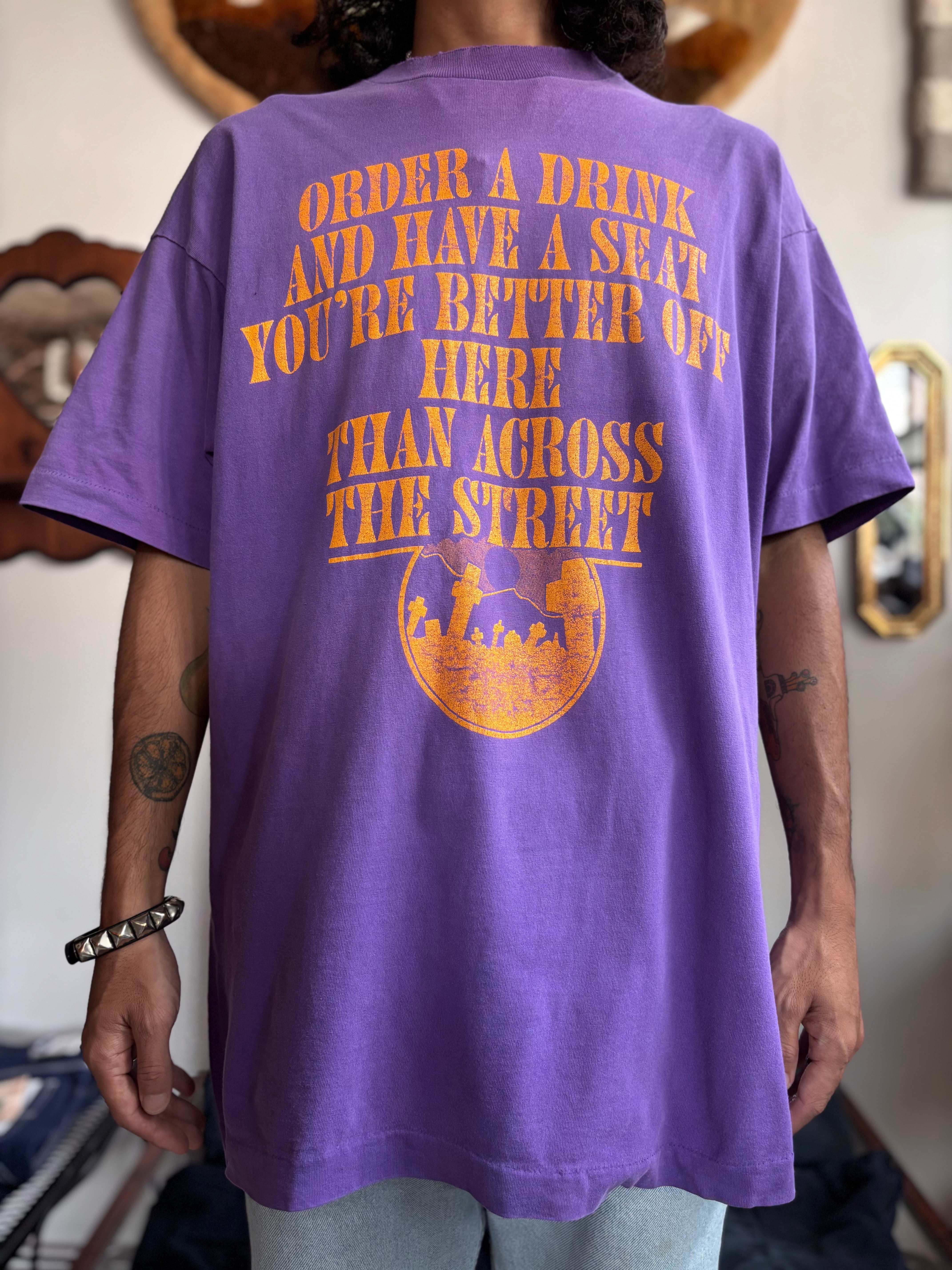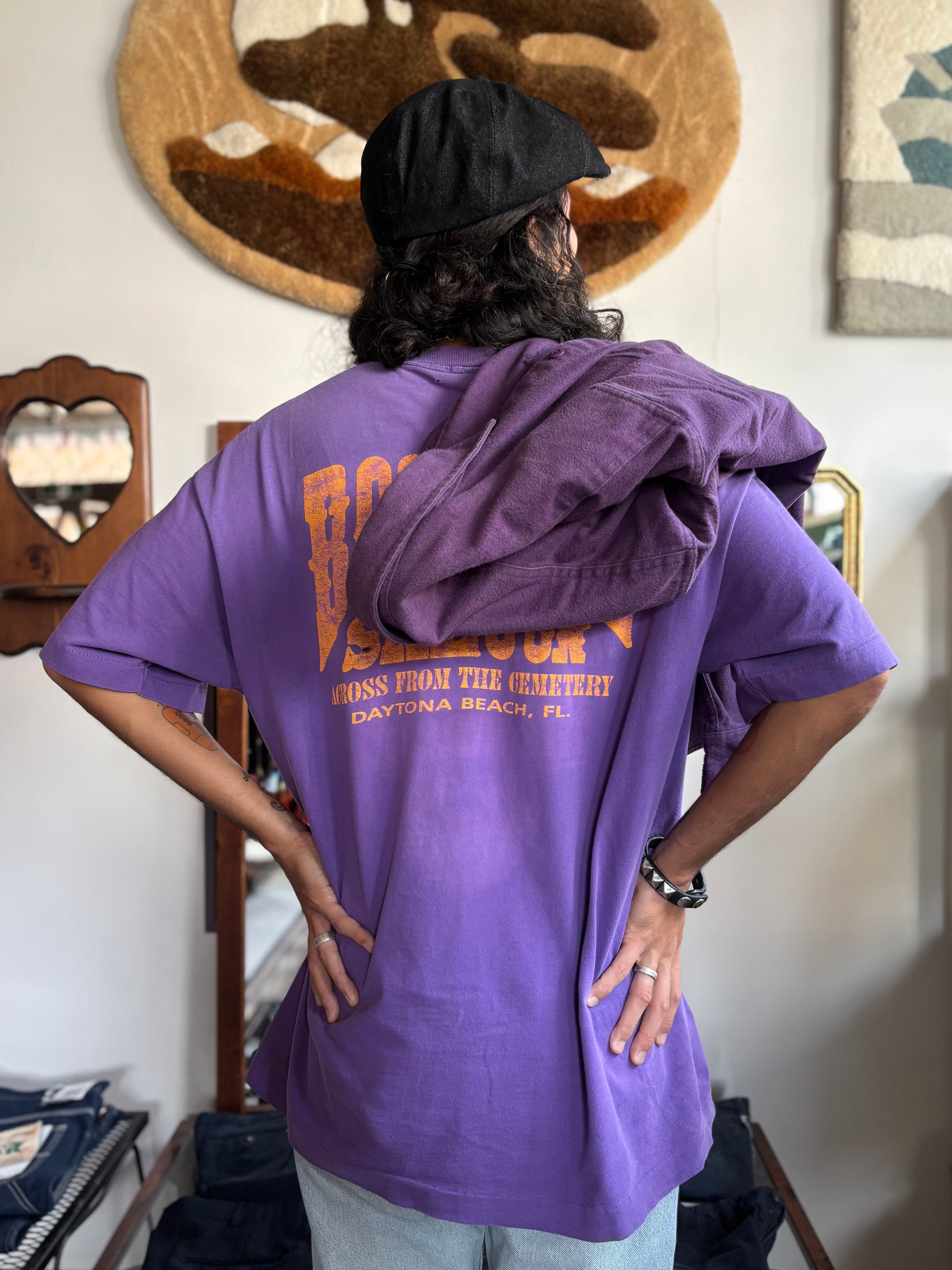厚みのある90sのフルーツボディ。袖、裾シングルステッチ。ゆとりのあるオーバーサイズシルエットに、両面プリント。フロリダ州に現存するバイカーバーの販促物。ボディ、プリント、OLD感ともに完璧なバランスの vintage Tee。