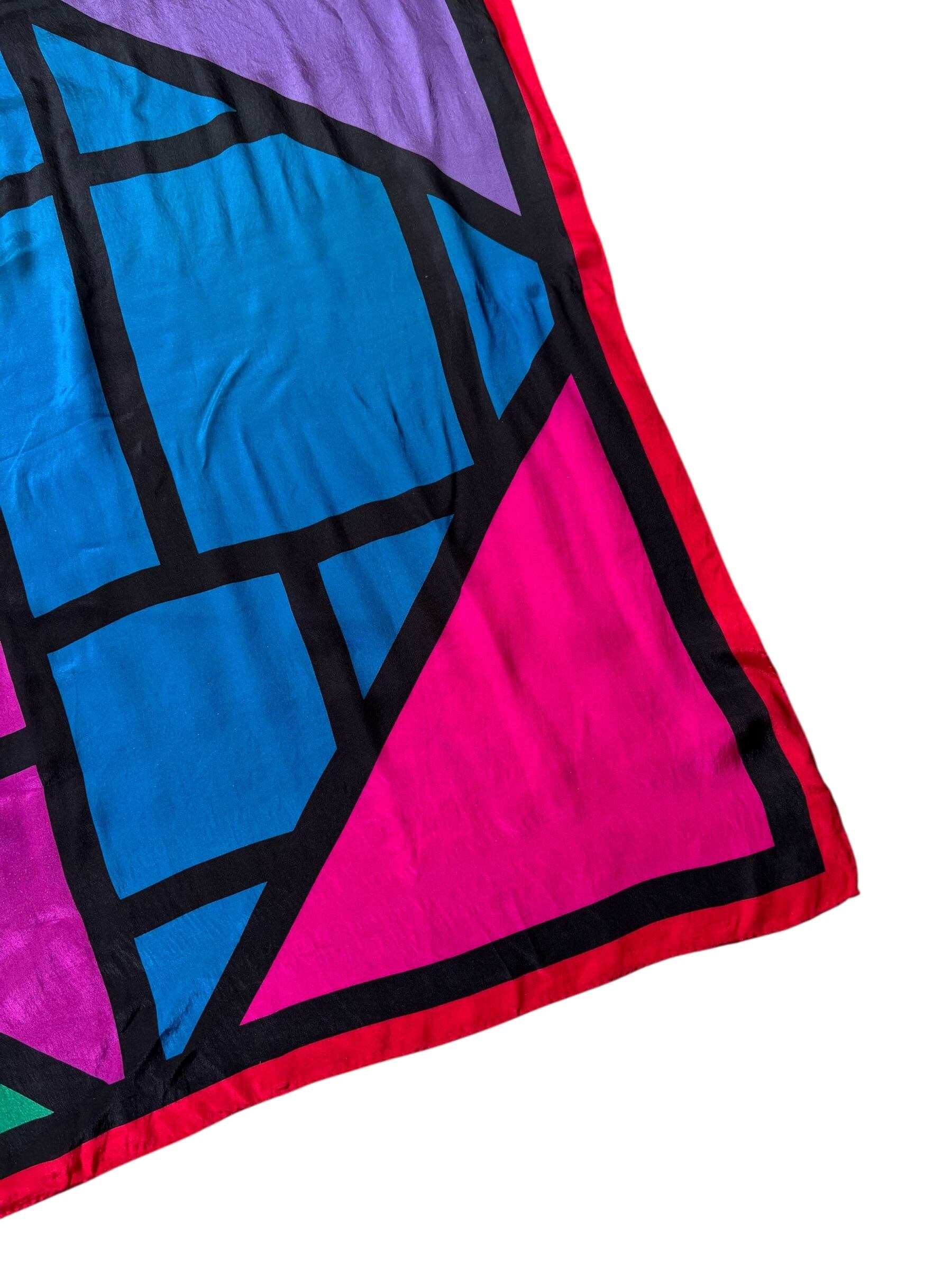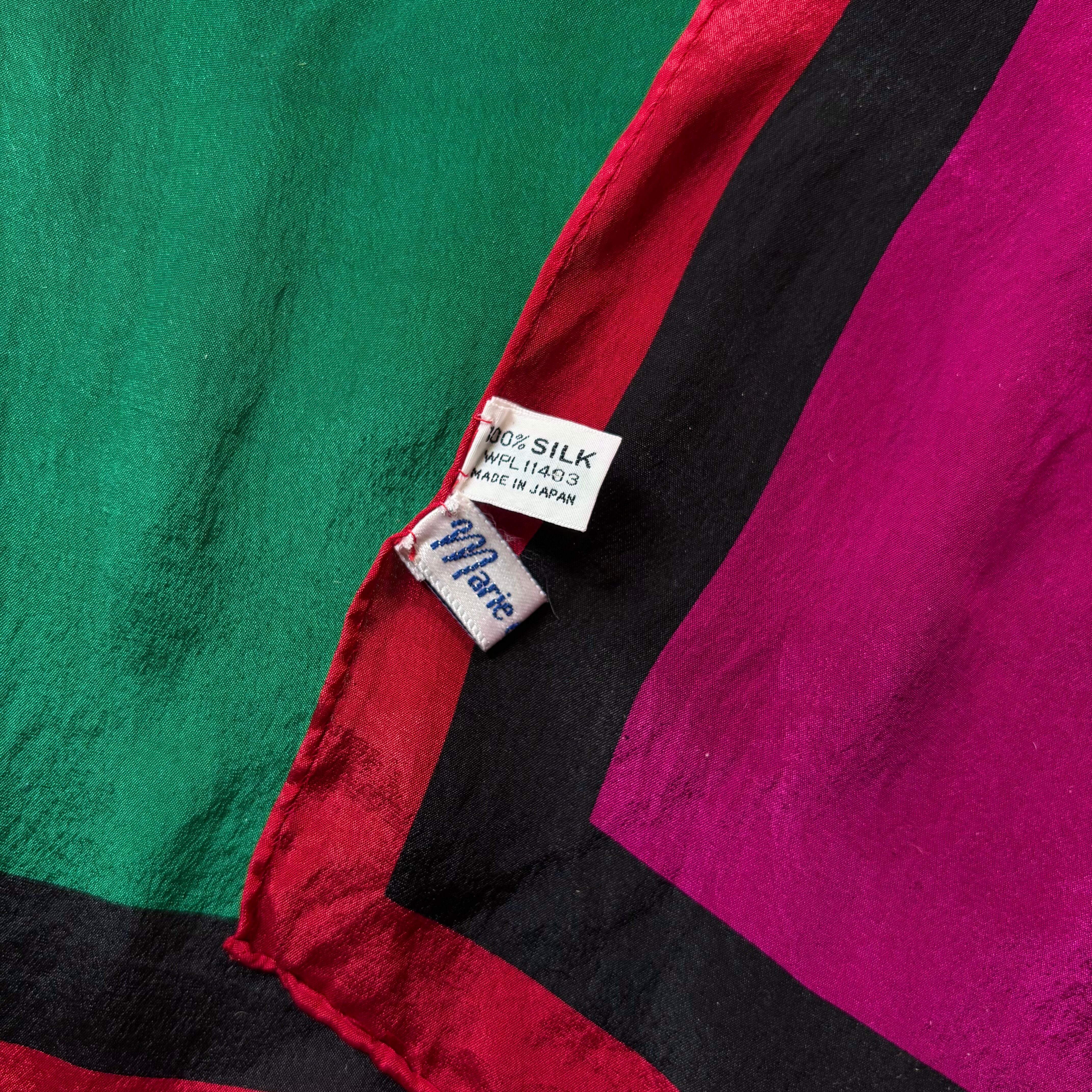 JAPAN MADEのシルク素材スカーフ。とても大判のサイズ感。80年代らしいビビッドでカラフル色合いに、黒の締め色がモダンな印象。