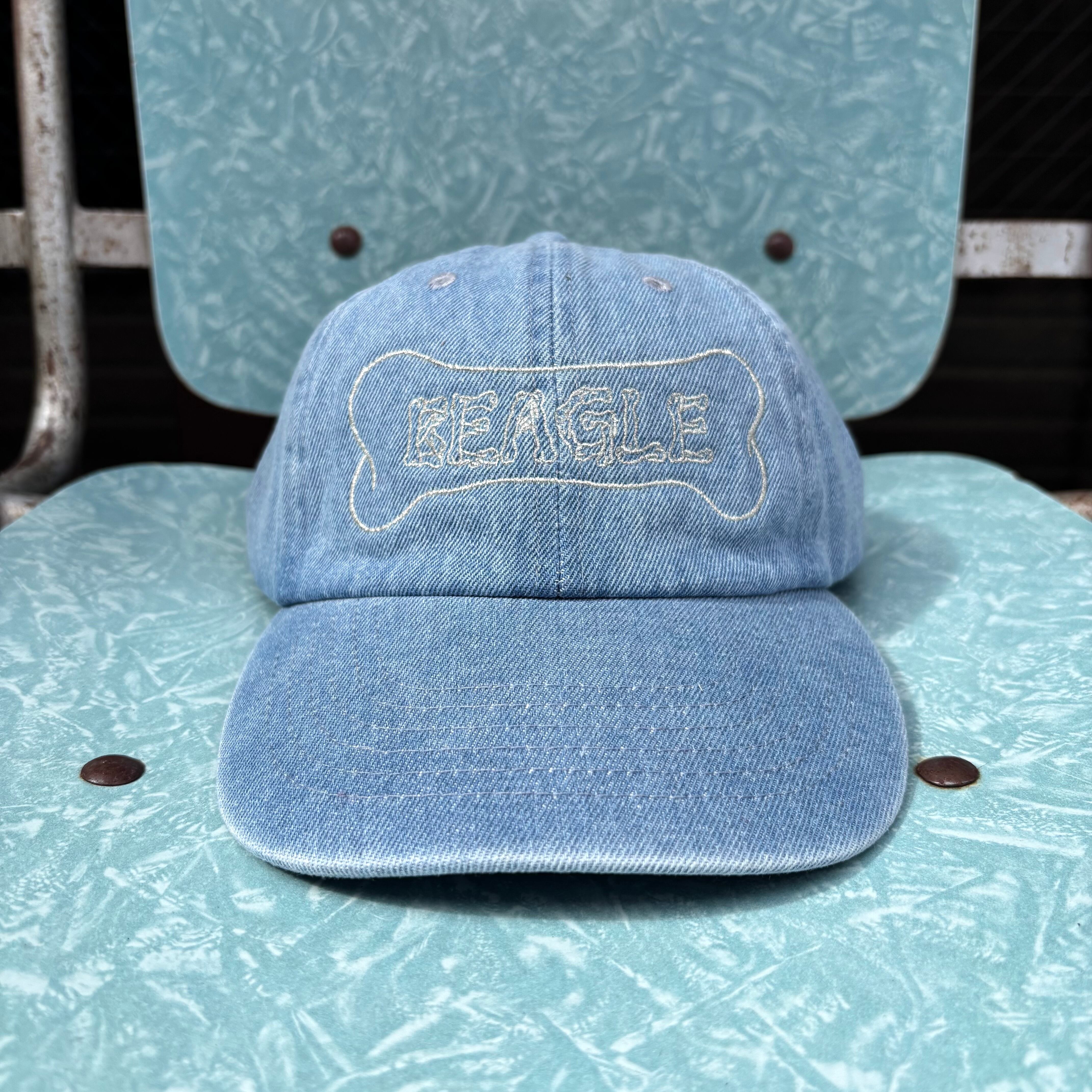 BEAGLEオリジナルロゴデニムキャップ。ウォッシュドデニム生地に、シルバーの刺繍で骨のグラフィック入り。シーズン問わず使えるスタンダードなデザイン。