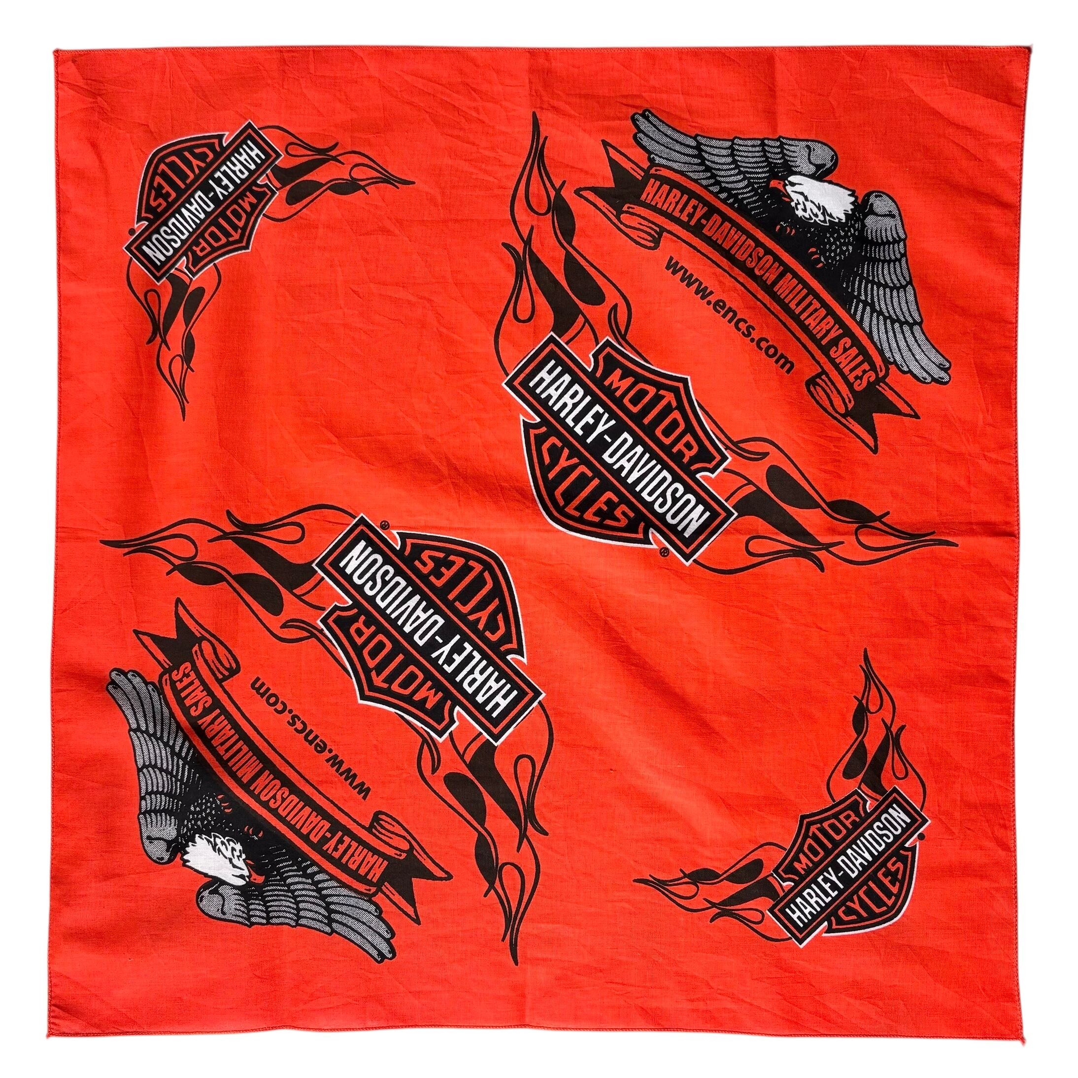HARLEY DAVIDSONのバンダナ。ビビッドなオレンジ。硬派なイーグルモチーフ。頭やバッグ、ボトムスのベルトループに巻くなどコーデのアクセントに◎