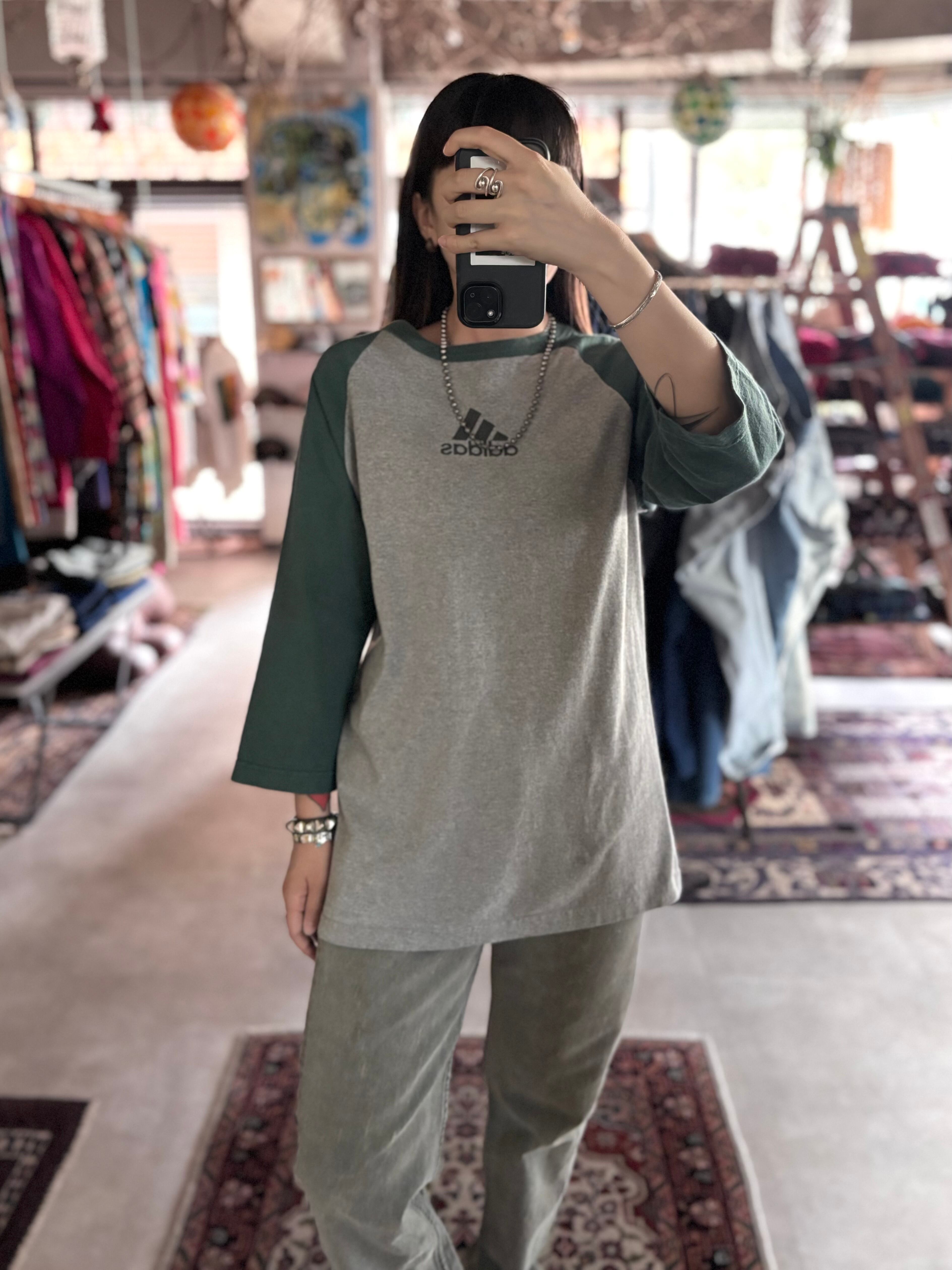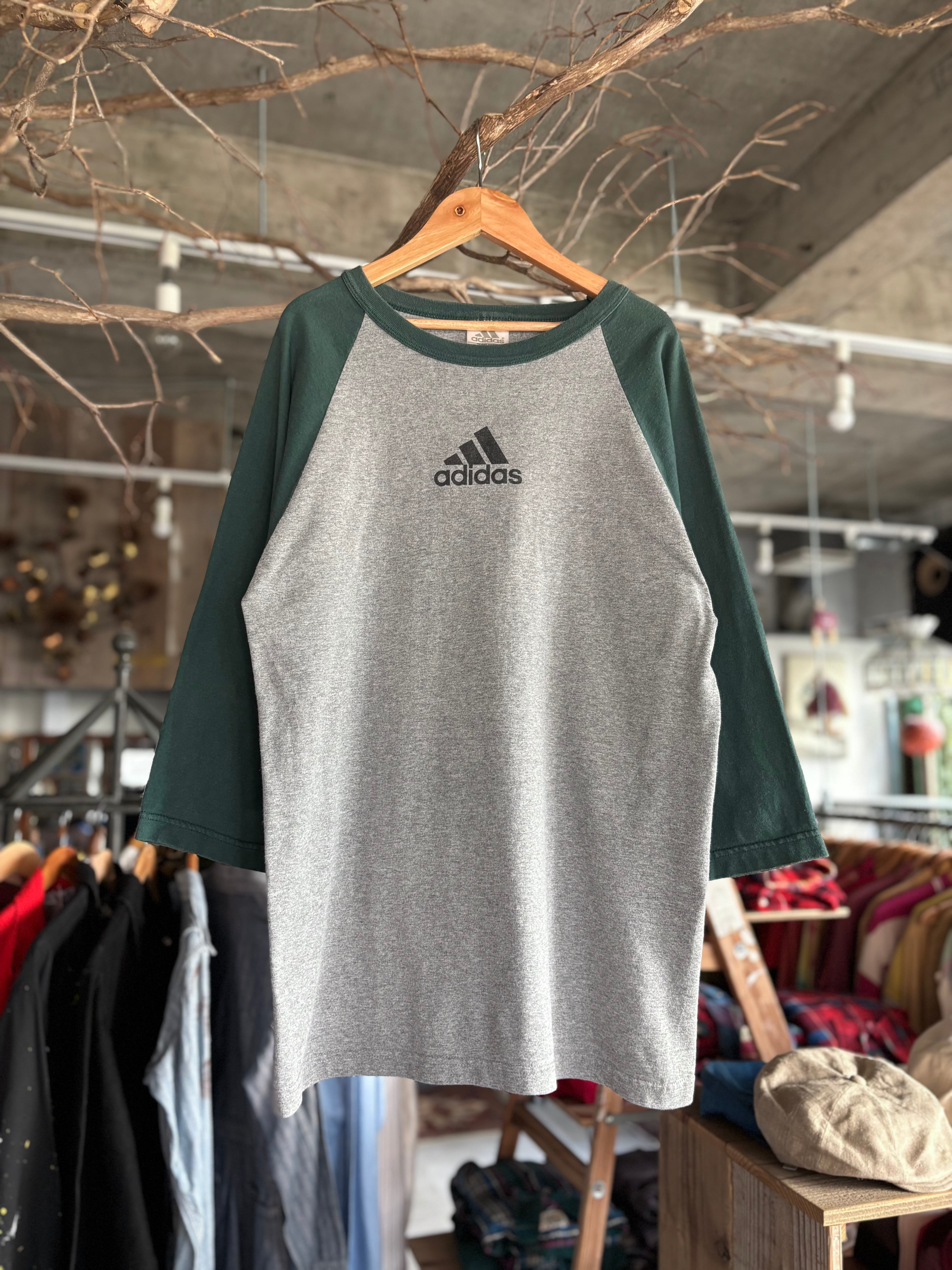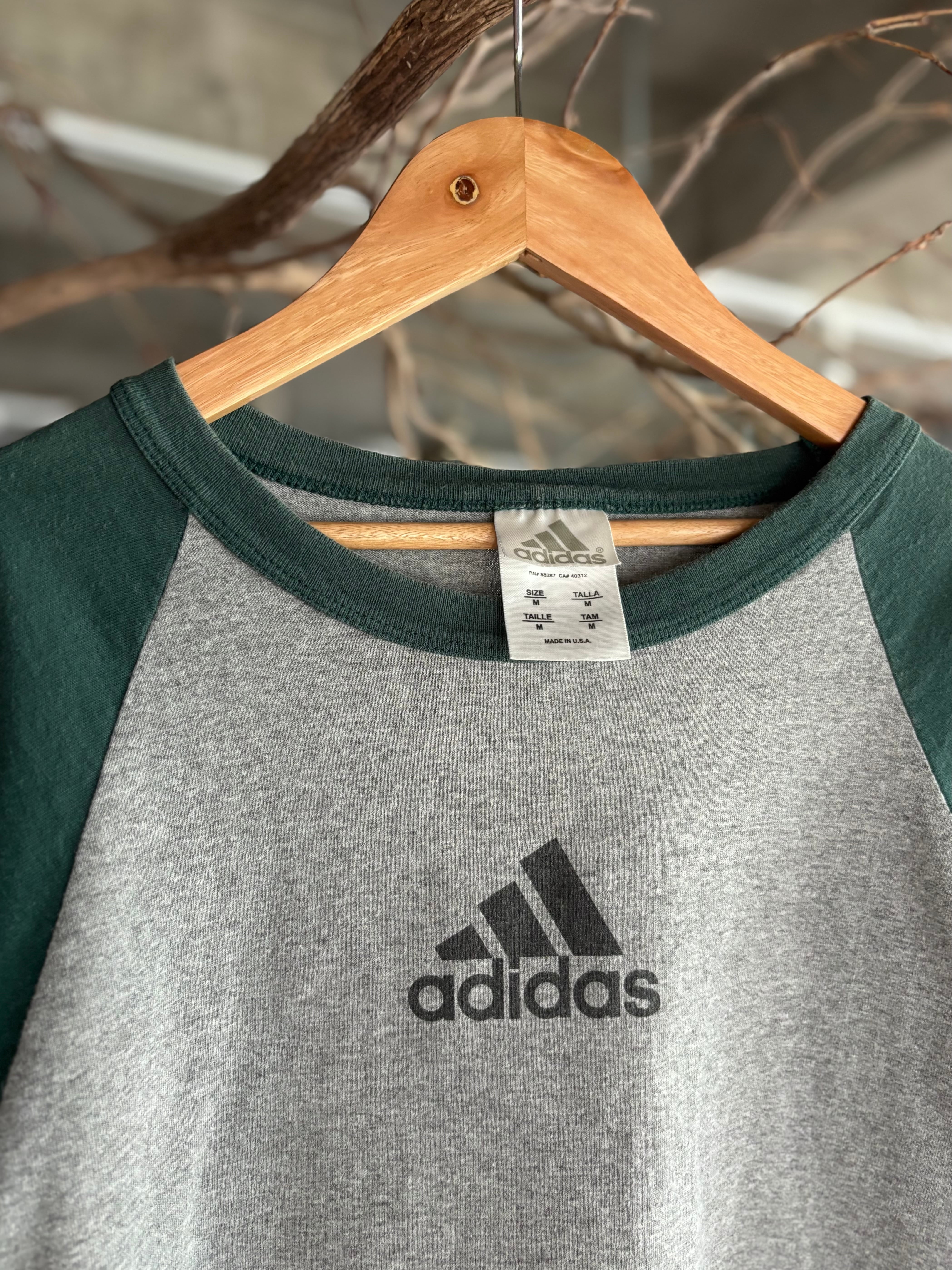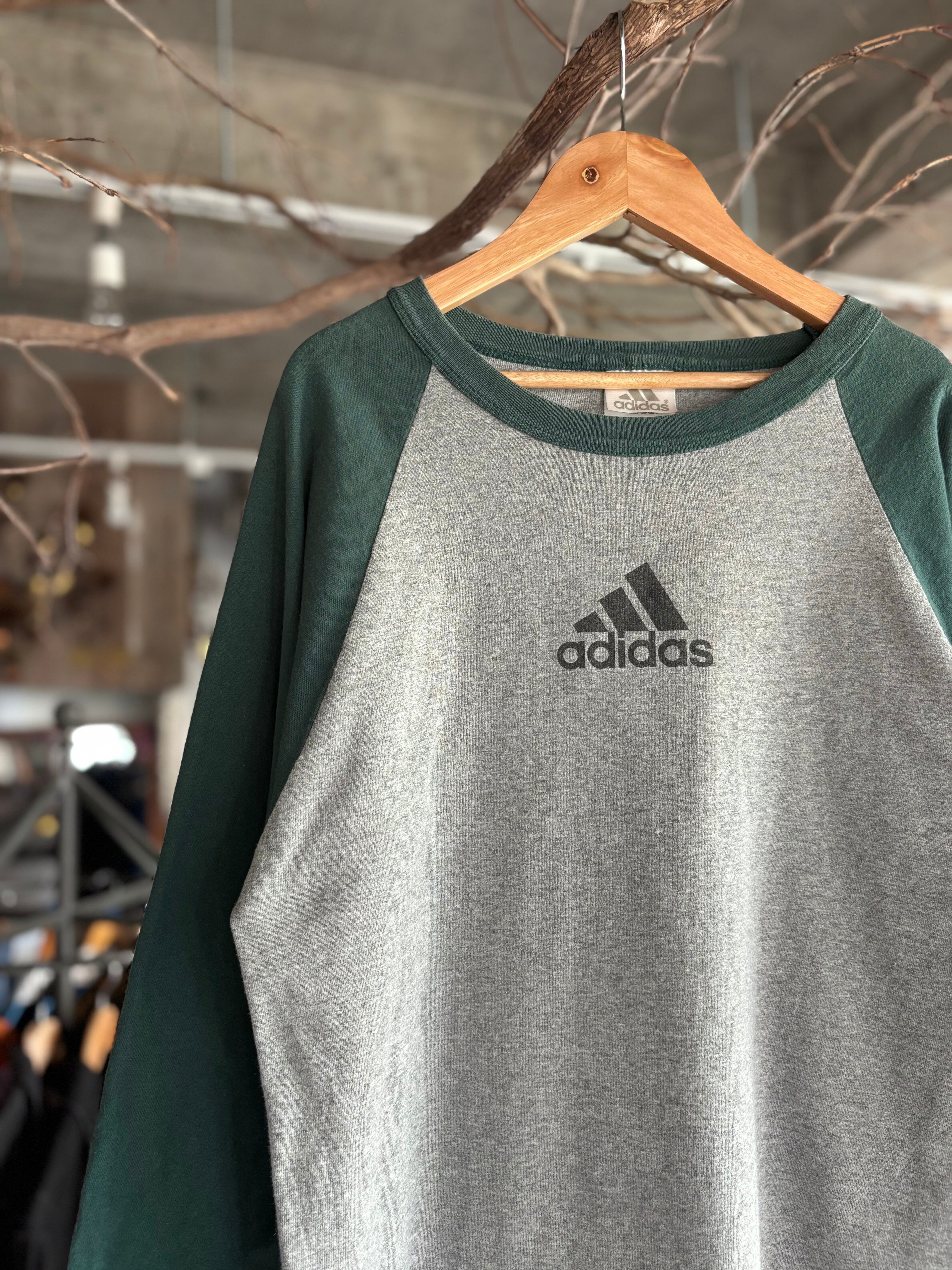 00年代製adidasのラグランTシャツ。アメリカ製。程よくゆとりのあるシルエット。バインダーネック仕様に、グレー×グリーンの落ち着いた配色。