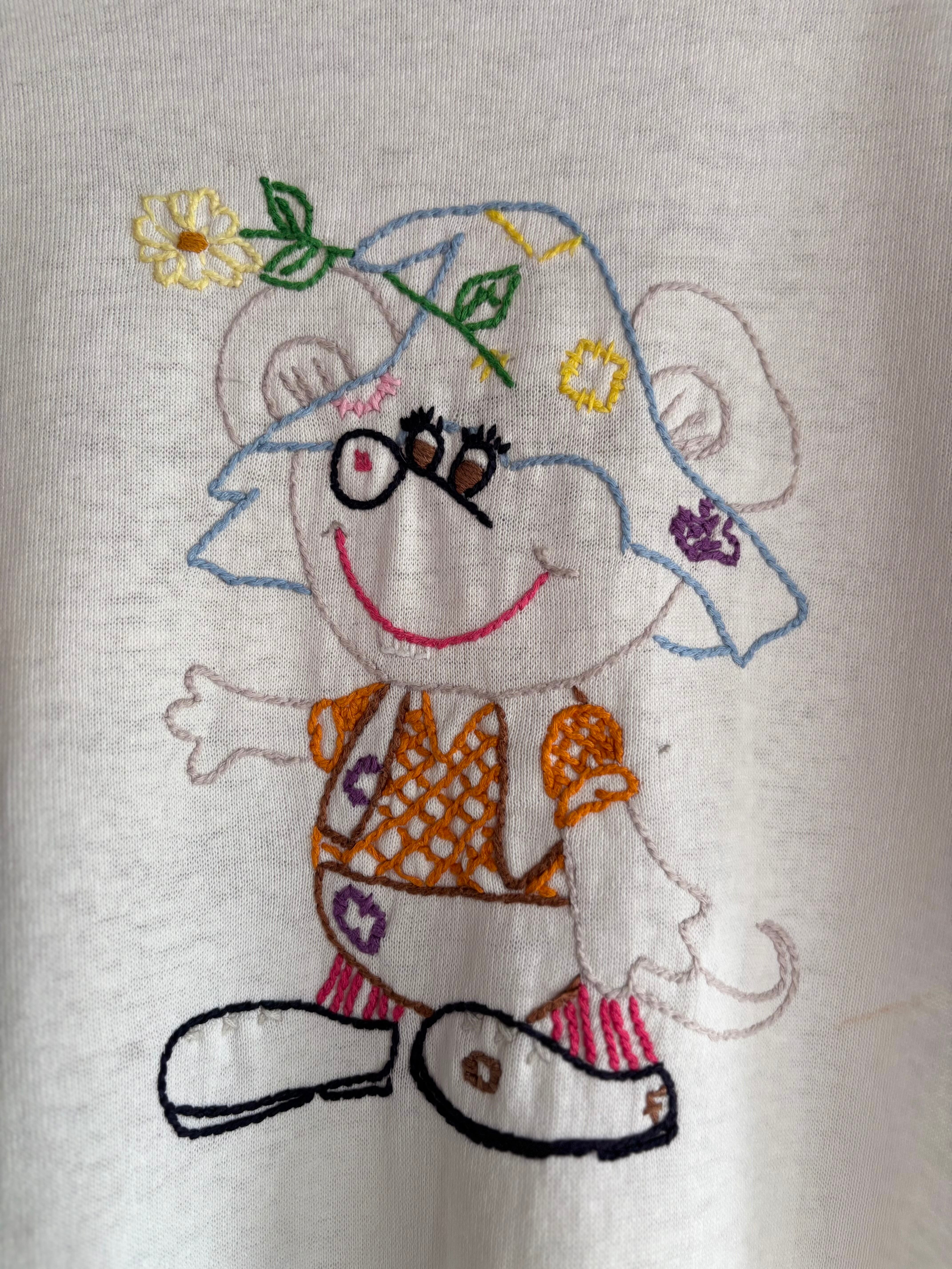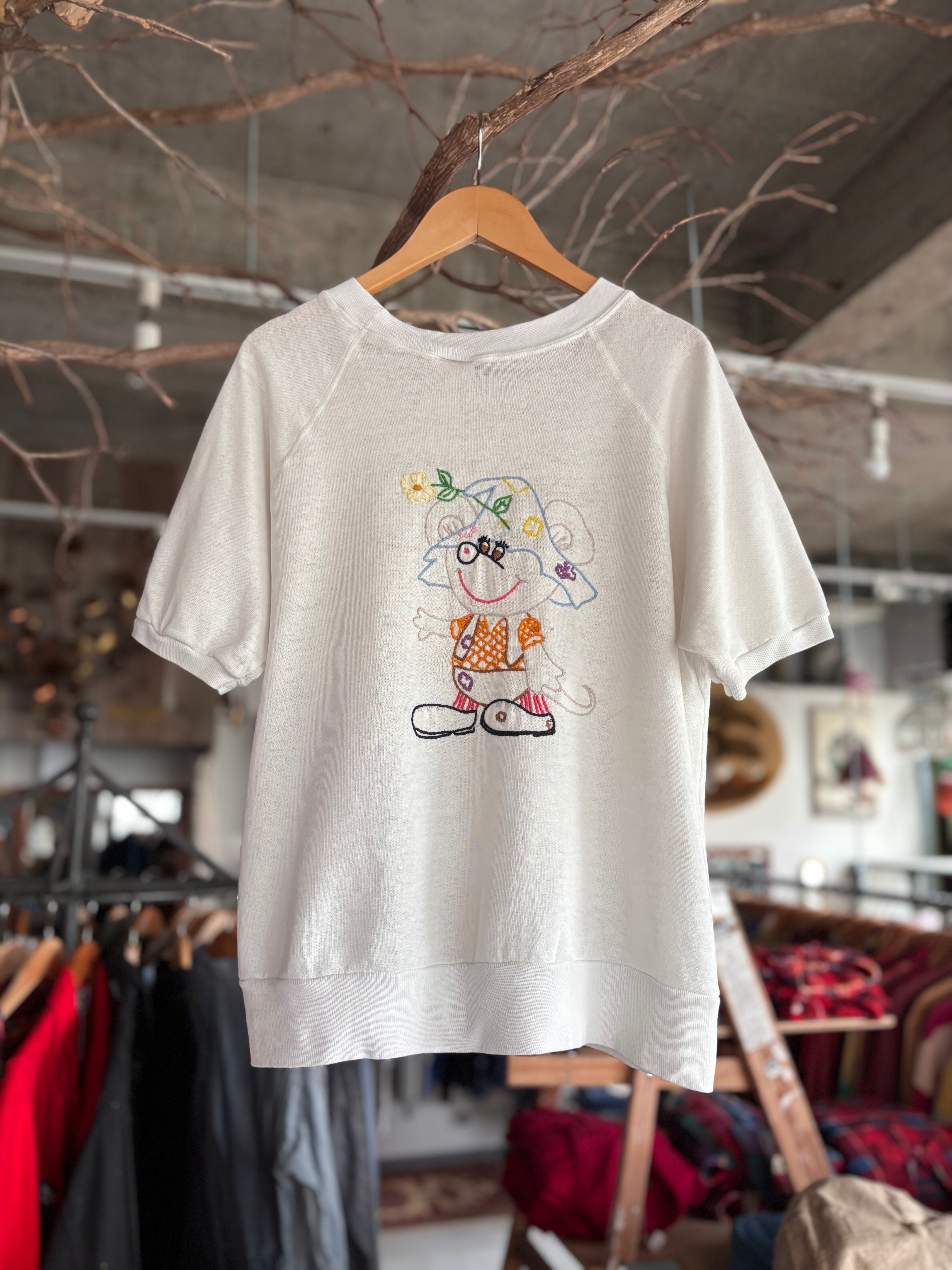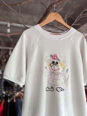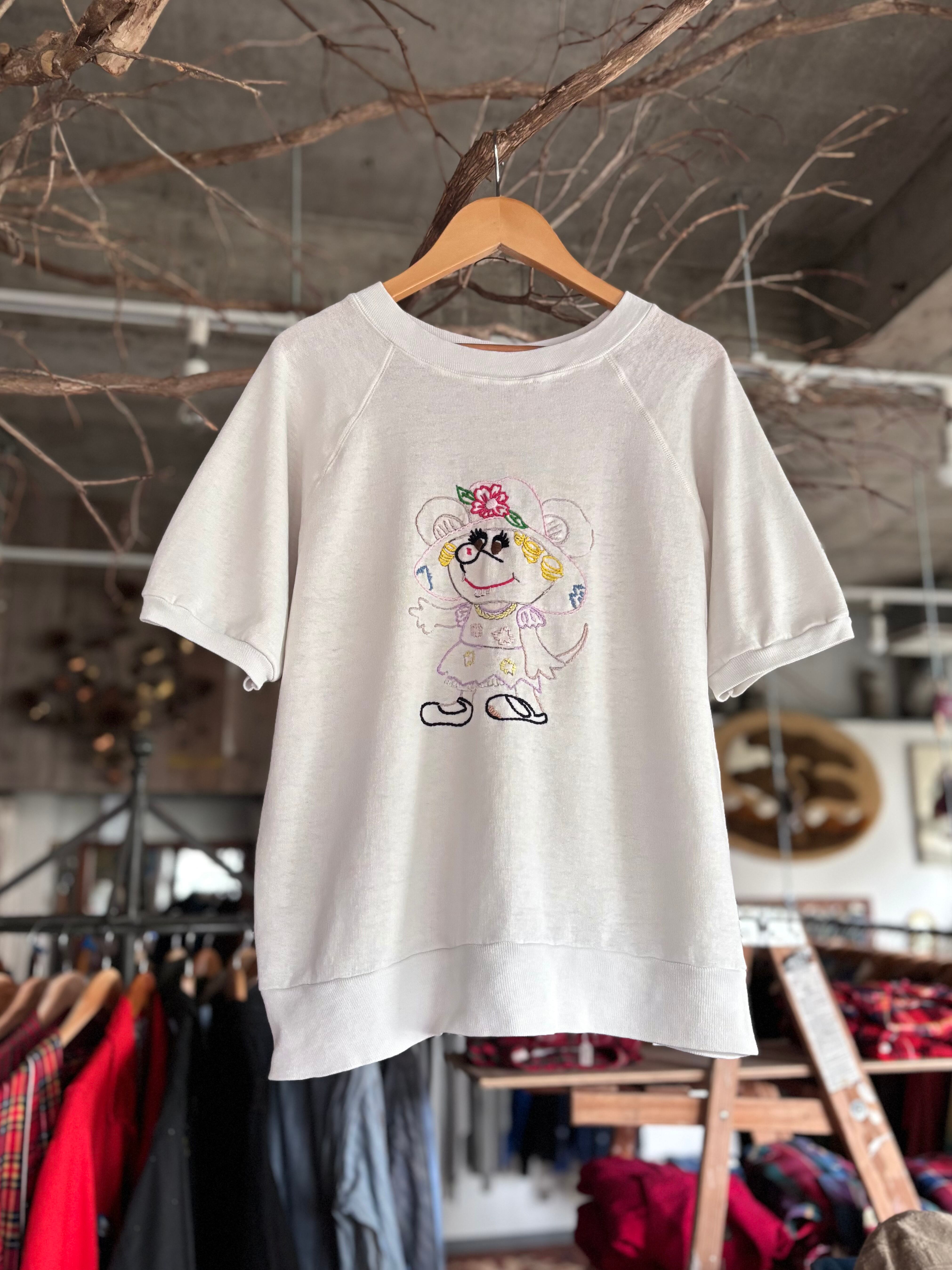 80年代製の半袖スウェット。程よくゆとりのある身幅に、コンパクトな着丈。薄手でクタッとした着心地。ラグラン仕様。両面に刺繍(フロントはねずみの女の子、バックはねずみの男の子)。古着らしいレトロな1点物。この雰囲気がお好きな方には強くおすすめの1着です◎