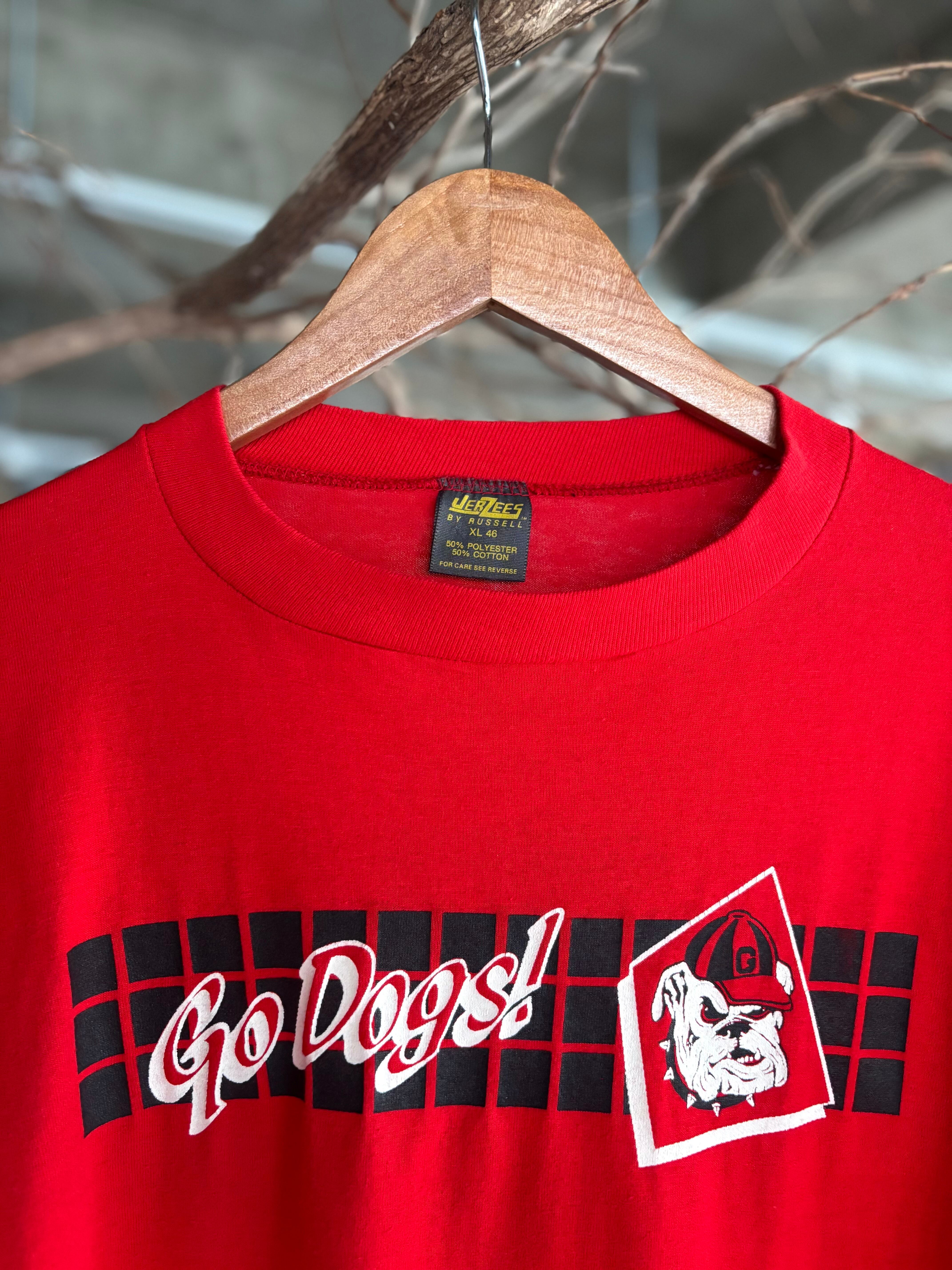 やわらかく着心地の良いのコットンポリ素材。アメリカ製RUSSELLボディ。XLサイズ表記のリラックスフィット。フロント・左袖・バックの3箇所にプリントが入るデザイン。ジョージア大学のカレッジ物。