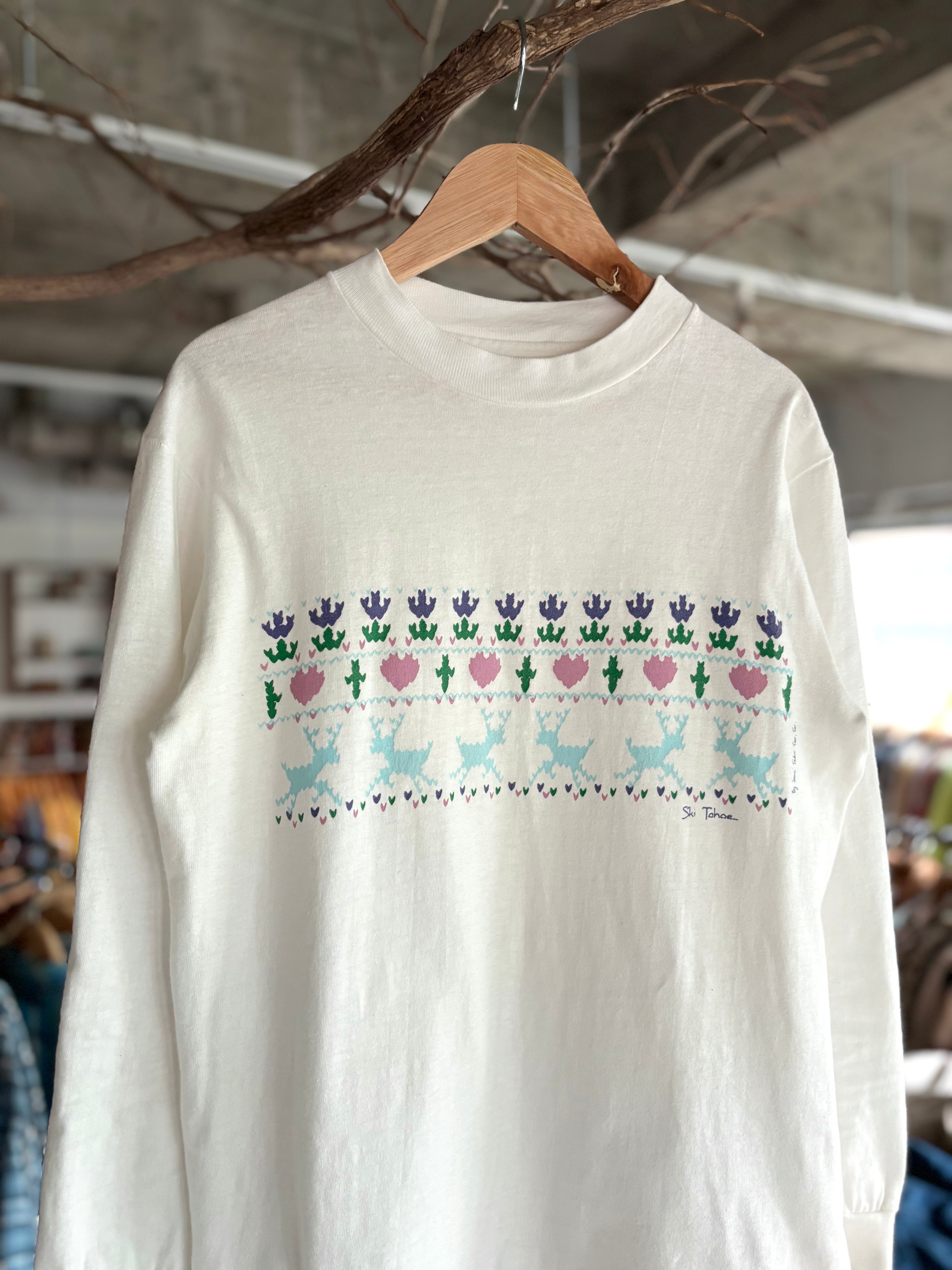 しっかりとした厚みのコットン素材。アメリカ製。Sサイズ表記のオーセンティックフィット。インナーにも使いやすいサイズ感。ハンドステッチの様なノルディック調プリントが北欧ムードたっぷり◎可愛いです。