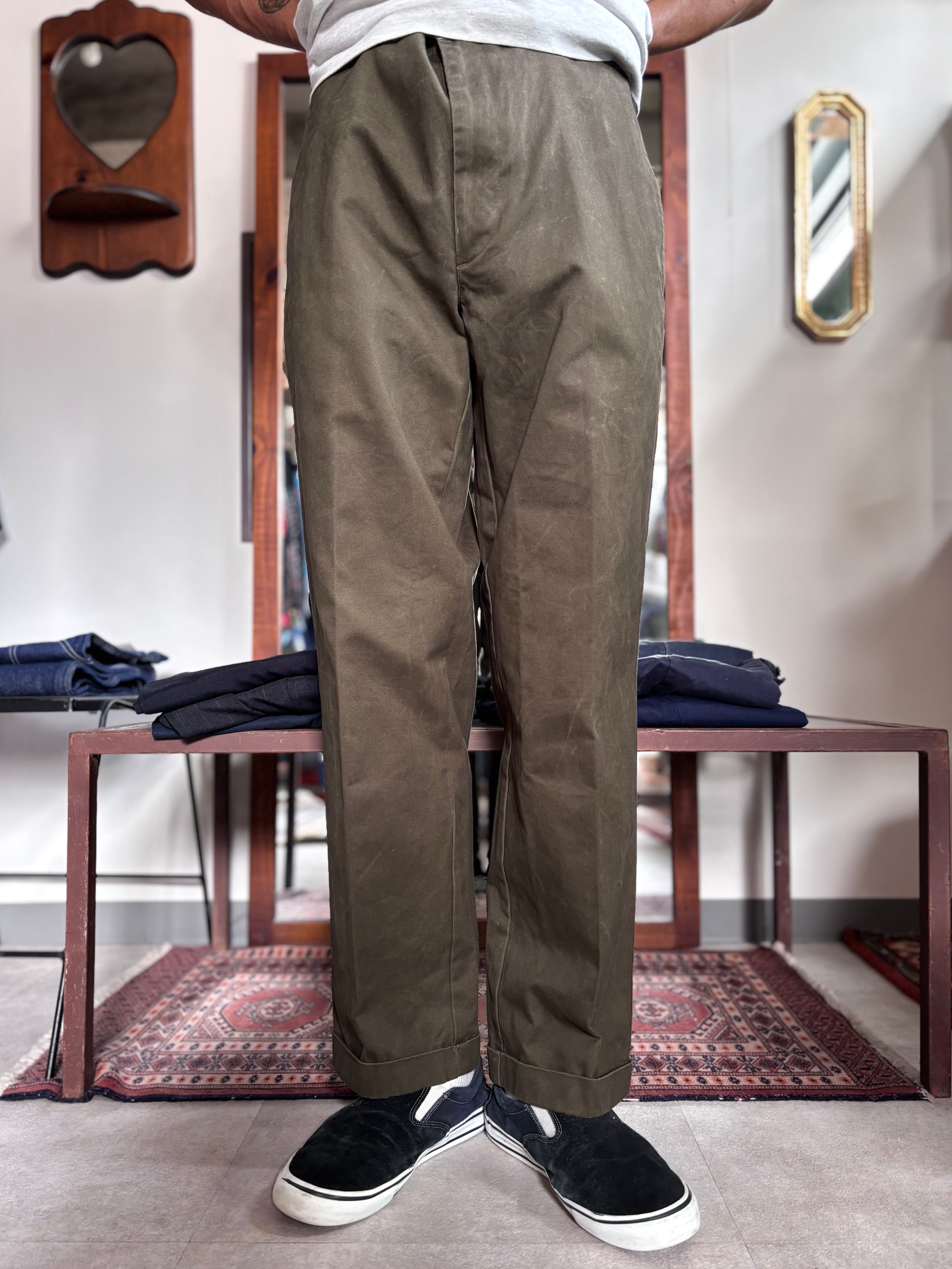 厚手のコットンツイル生地。落ち着いたカーキブラウンカラー。ゆったりした股上に、しっかり太いストレートシルエット。ファブリック、仕立てともにひとつ抜けたクオリティの高さのORVIS製。
