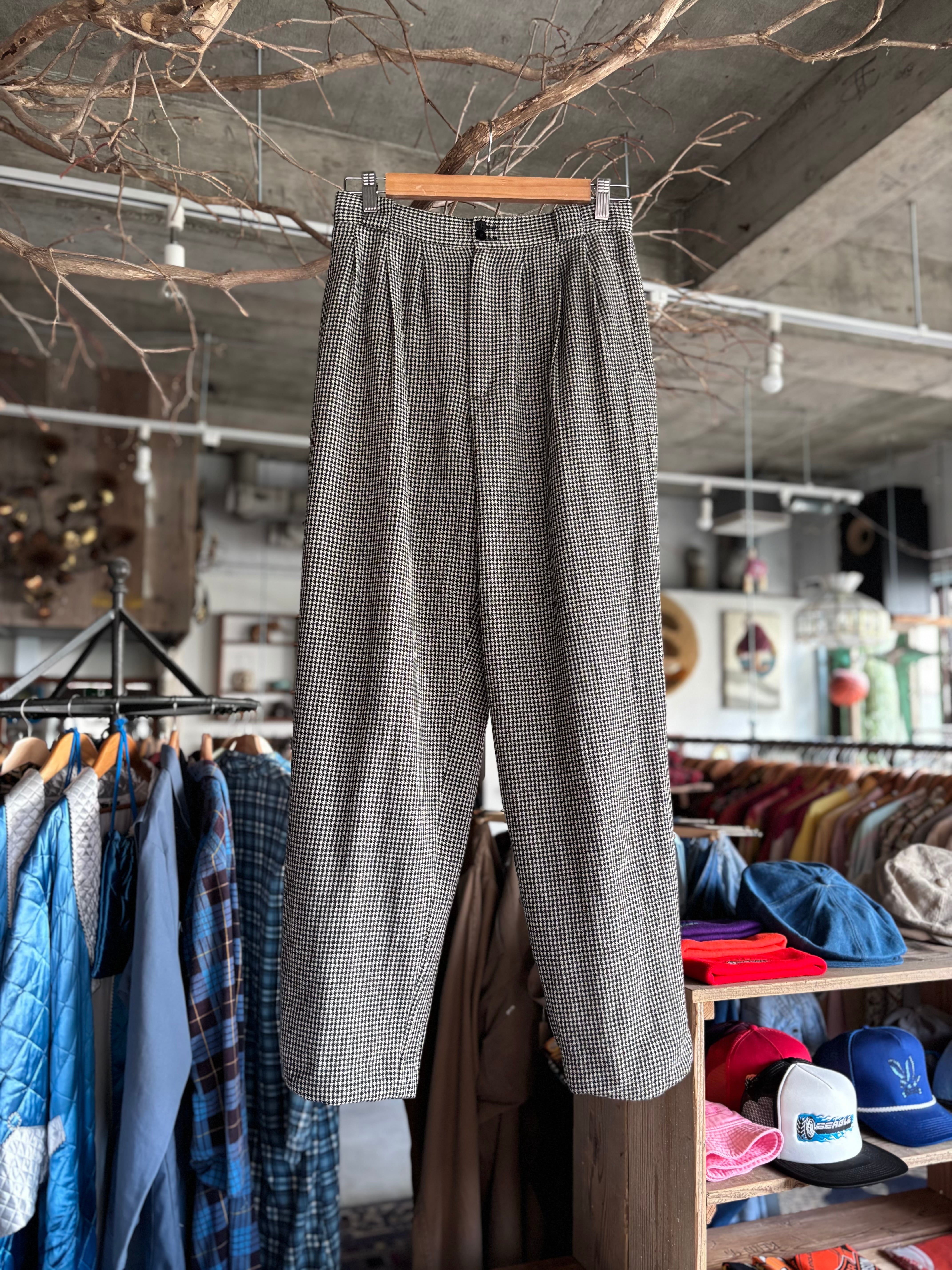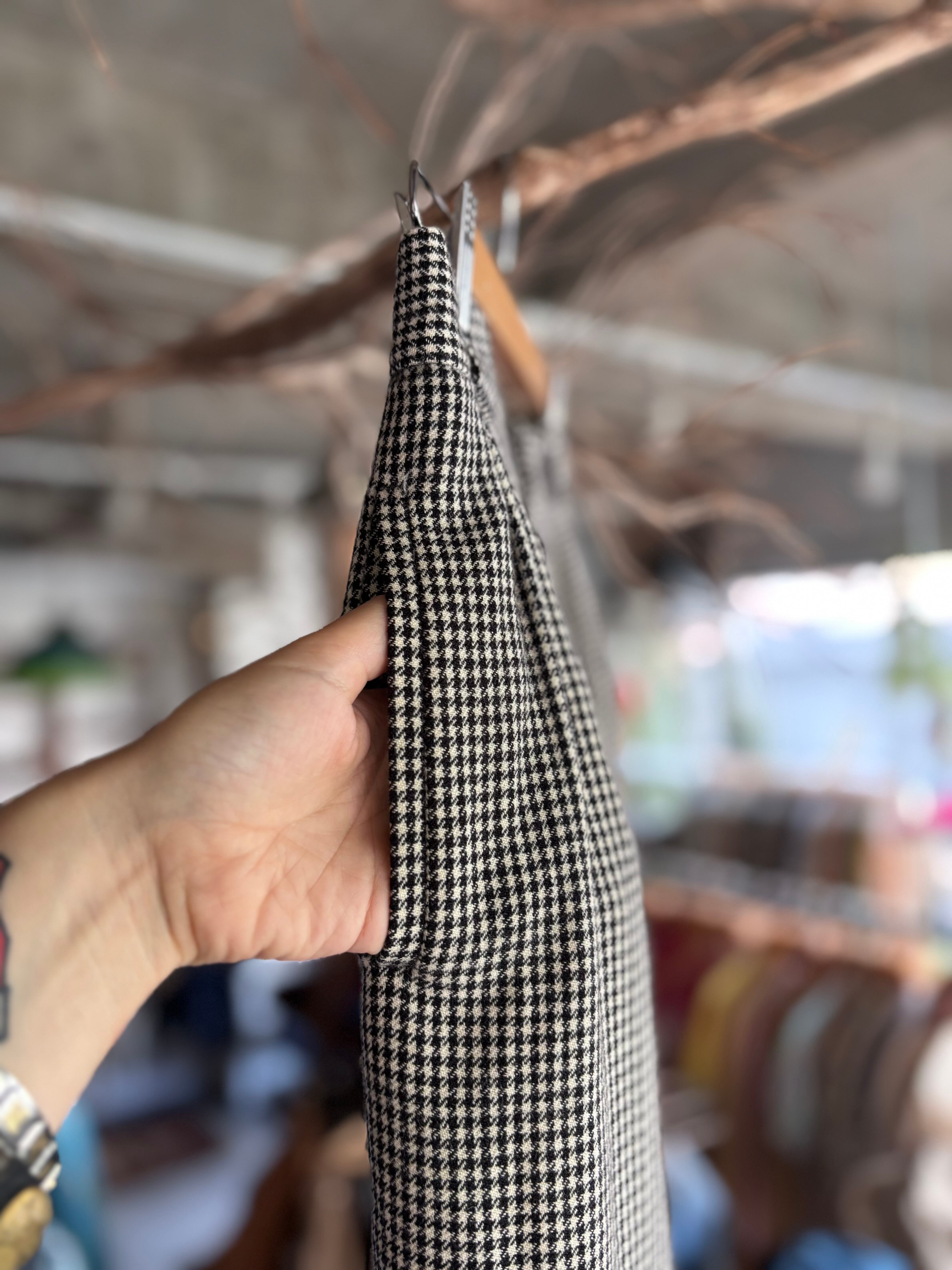 しっかりした厚みのウール生地に、さらりとしたレーヨンのライナー付き。モノトーンの千鳥格子柄。ハイウエストで着用する股上にゆとりのあるシルエット。2タックのテーパードシルエット。ファブリック、ディテールともにひとつ抜けたクオリティのウールスラックス。