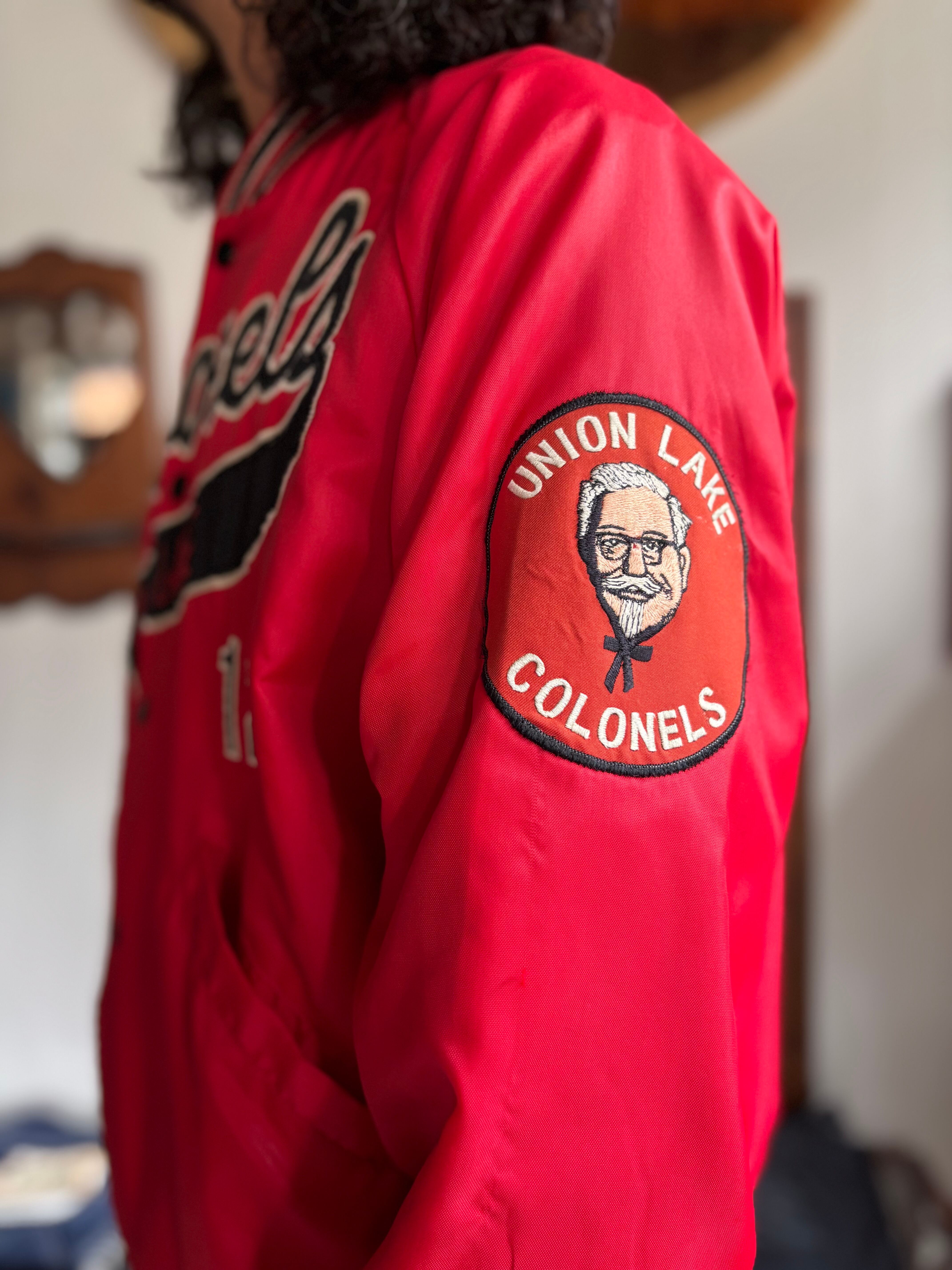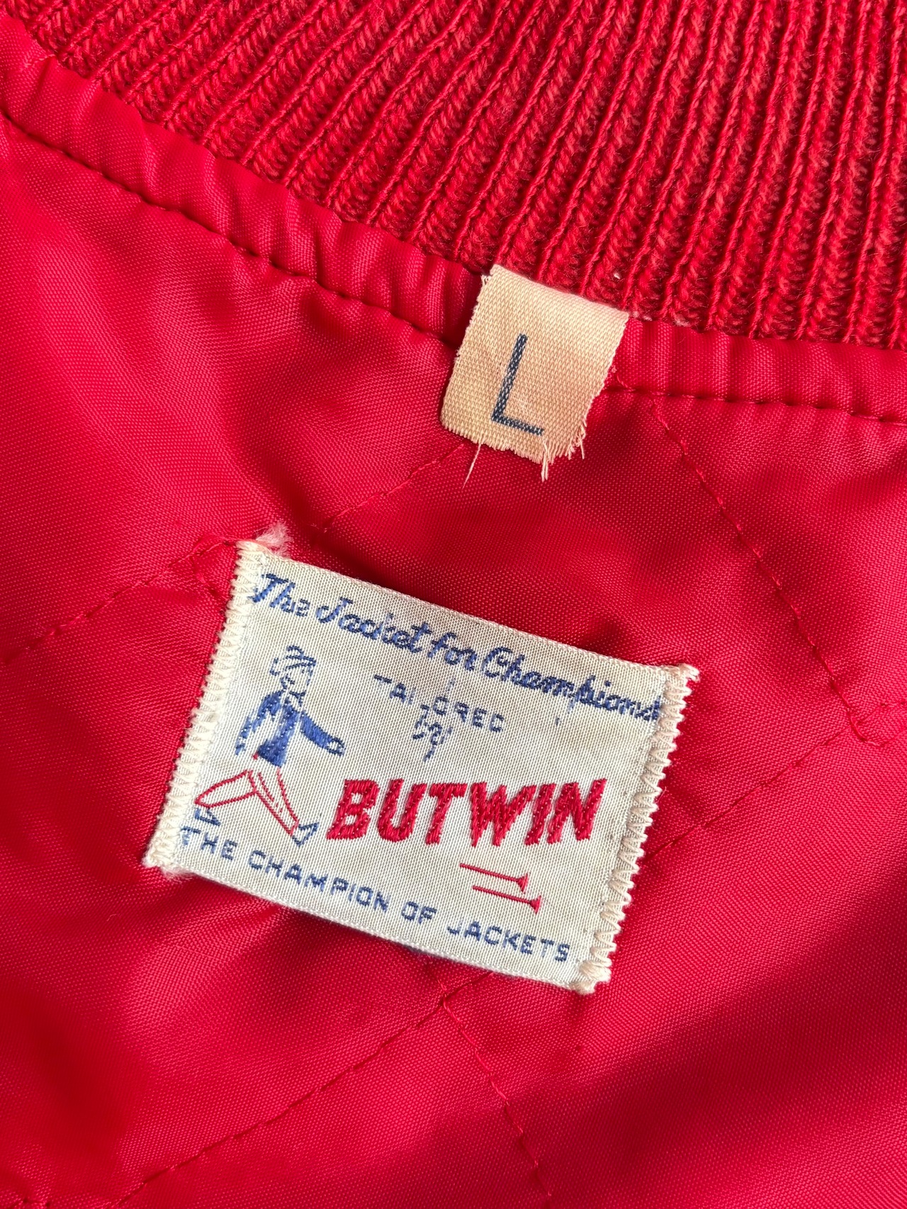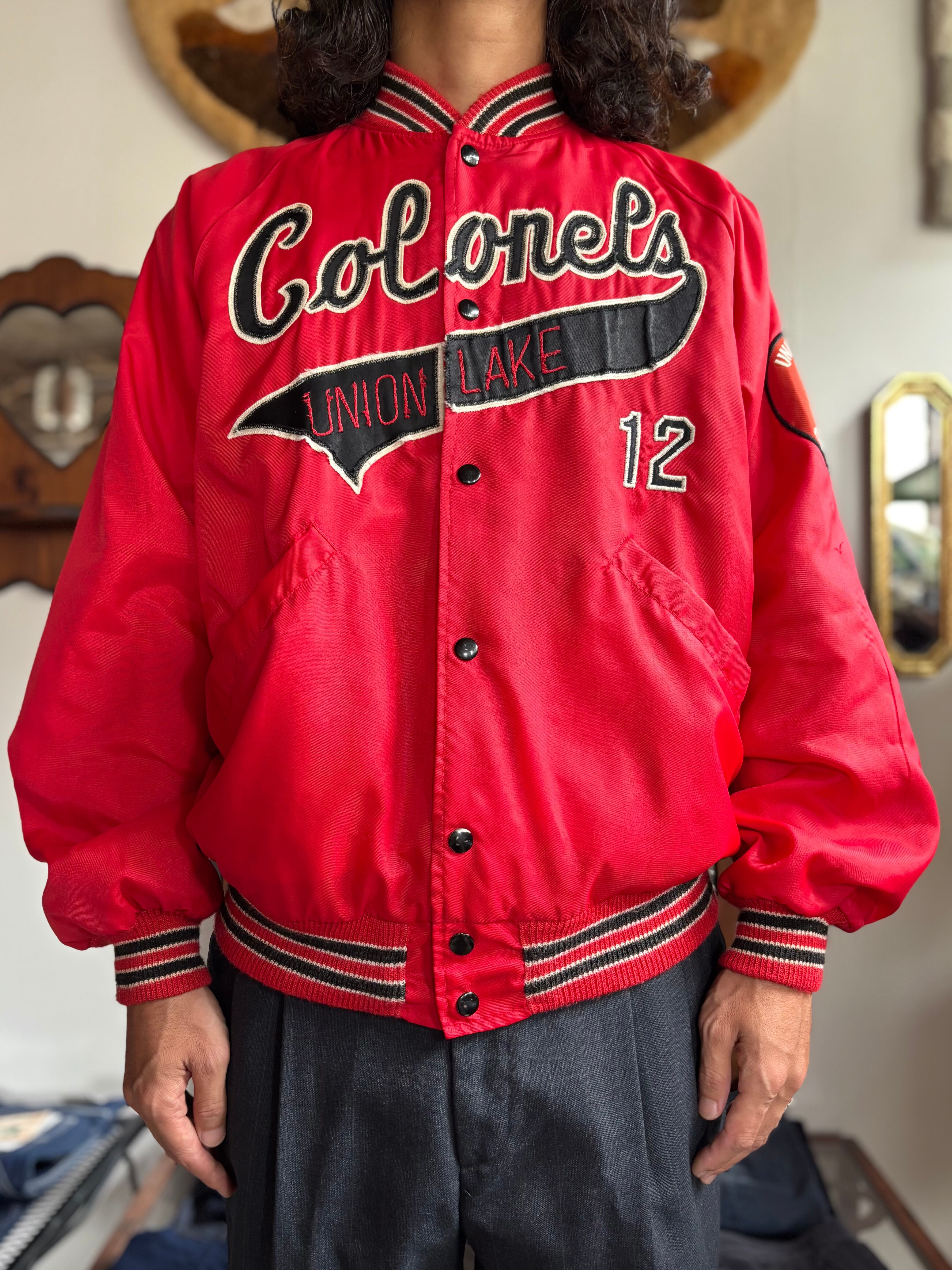 軽い着心地のナイロンシェルに、薄手のキルティングライナー仕様。シェル、リブカラーともにOLD感抜群の褪せたレッドカラー。丈短めのリラックスシルエット。黒縁に白ヒゲがトレードマークの某ファーストフードチェーンのローカルスポーツチームもの。ラッカーボタンのハゲも無く、装飾も綺麗に残っている良好なコンディション。重量感を感じずに気軽に羽織ることができる良質vintageです。