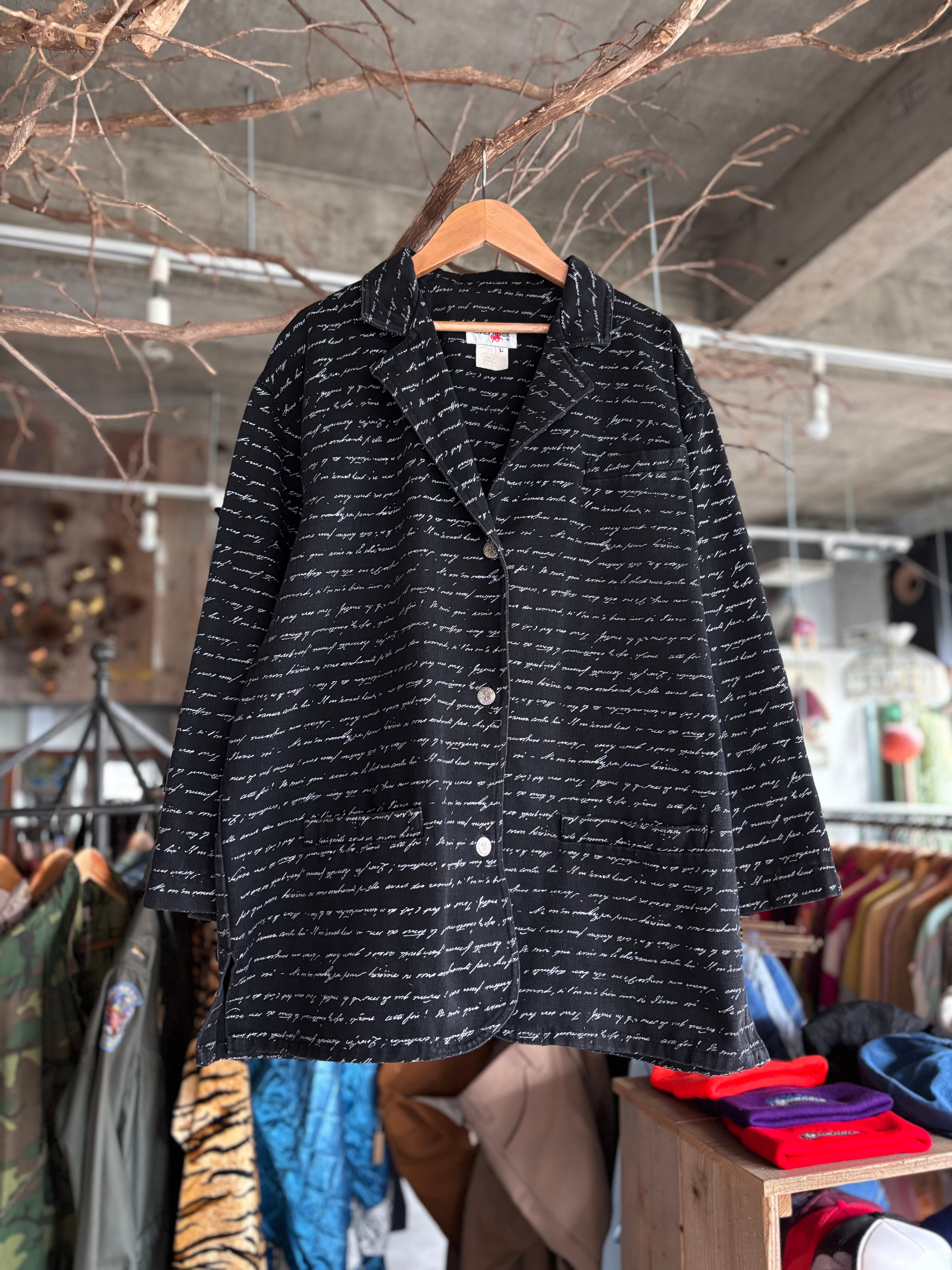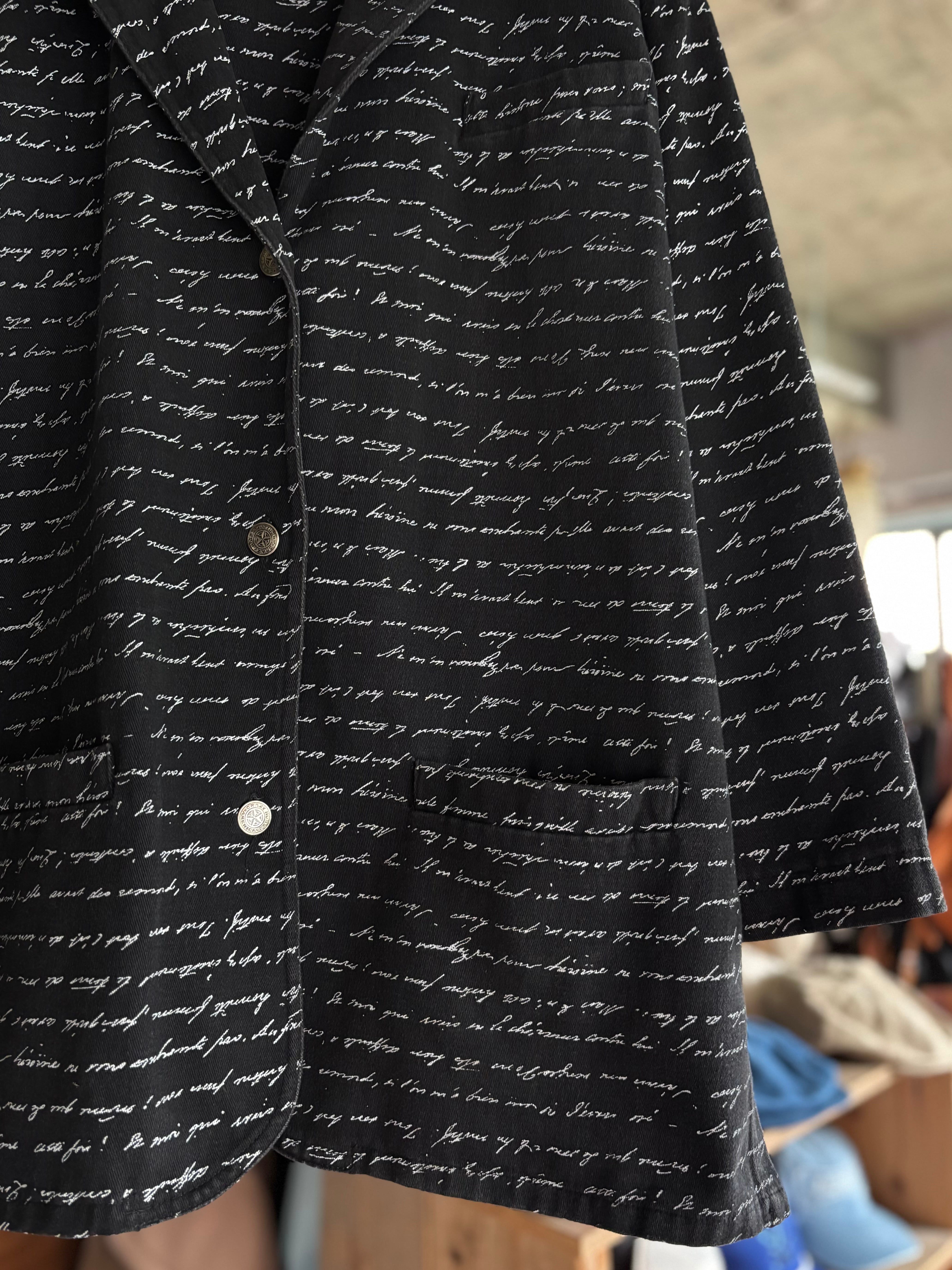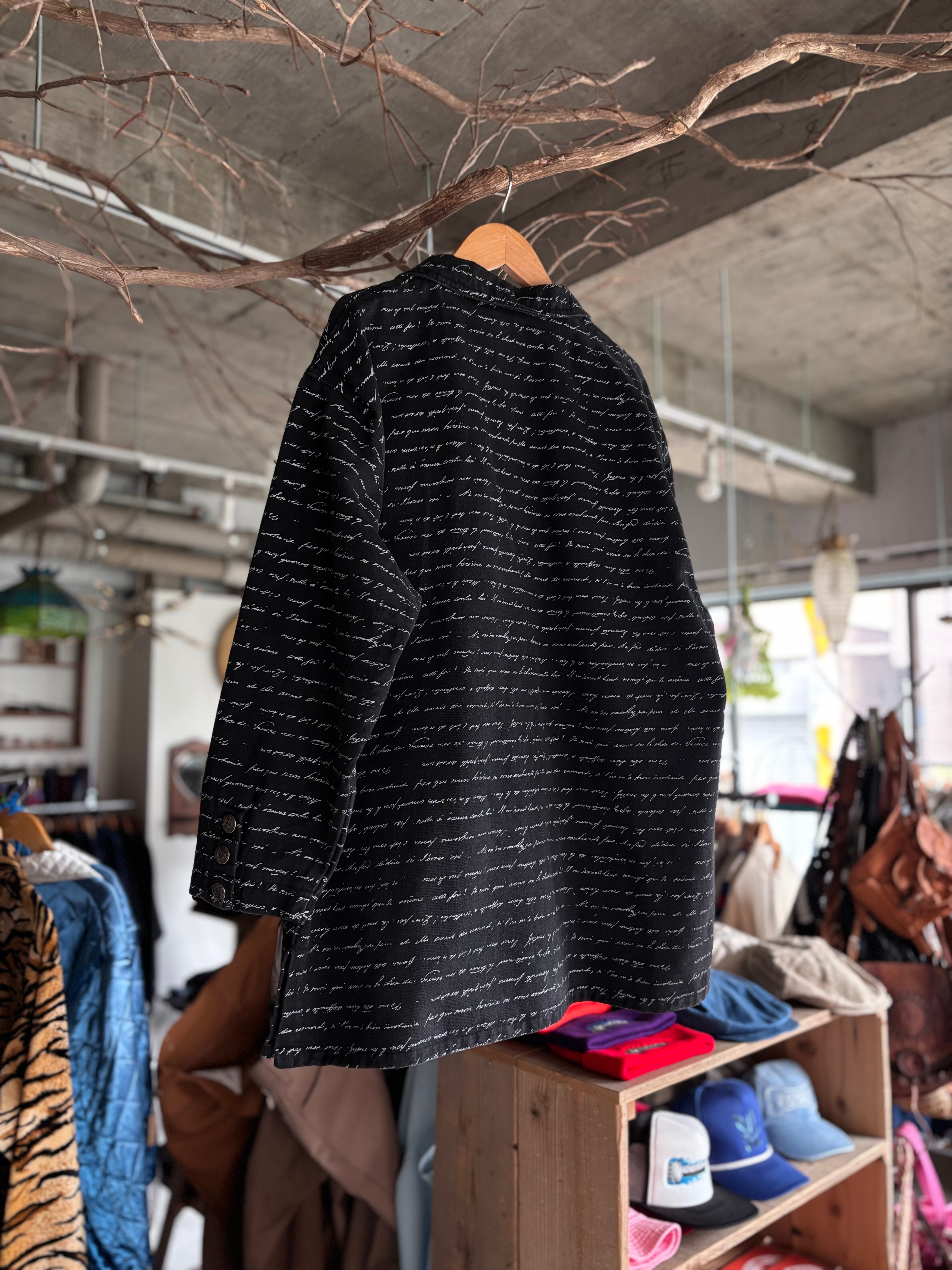 厚手のコットンツイル素材。リラックスフィット。モノトーンの総柄プリントに、細めのアームがスタイリッシュな印象。メタルボタン仕様。
