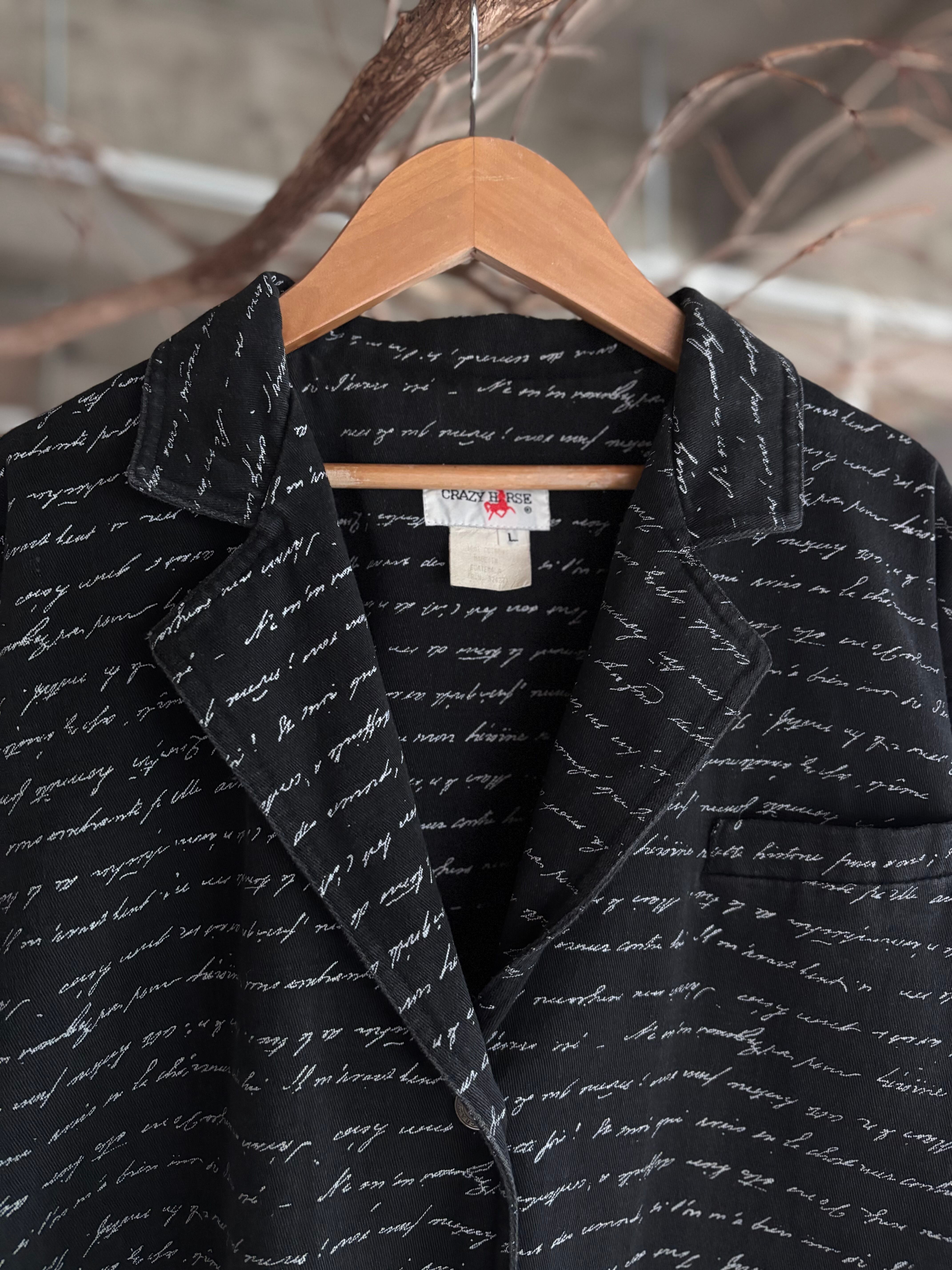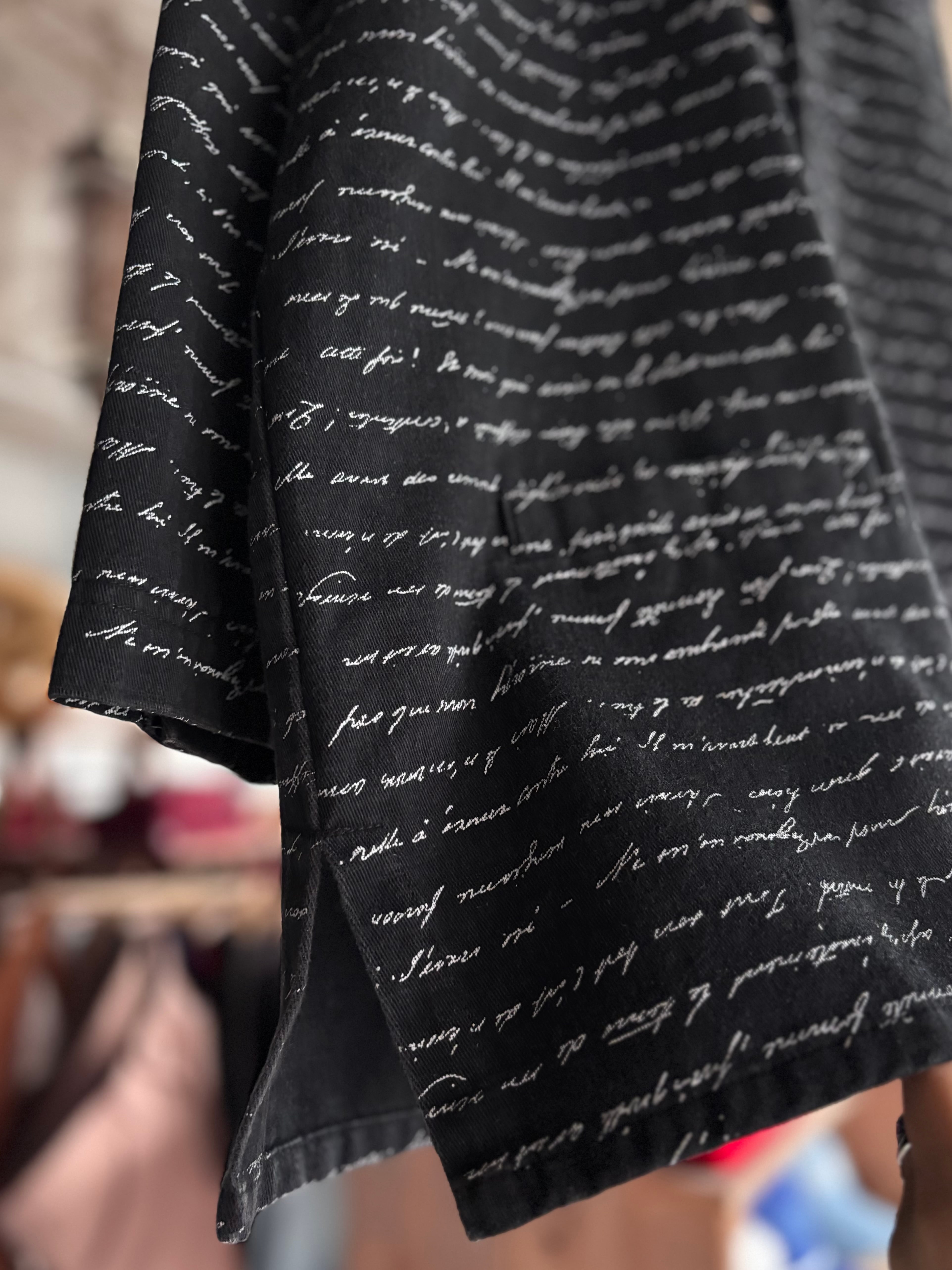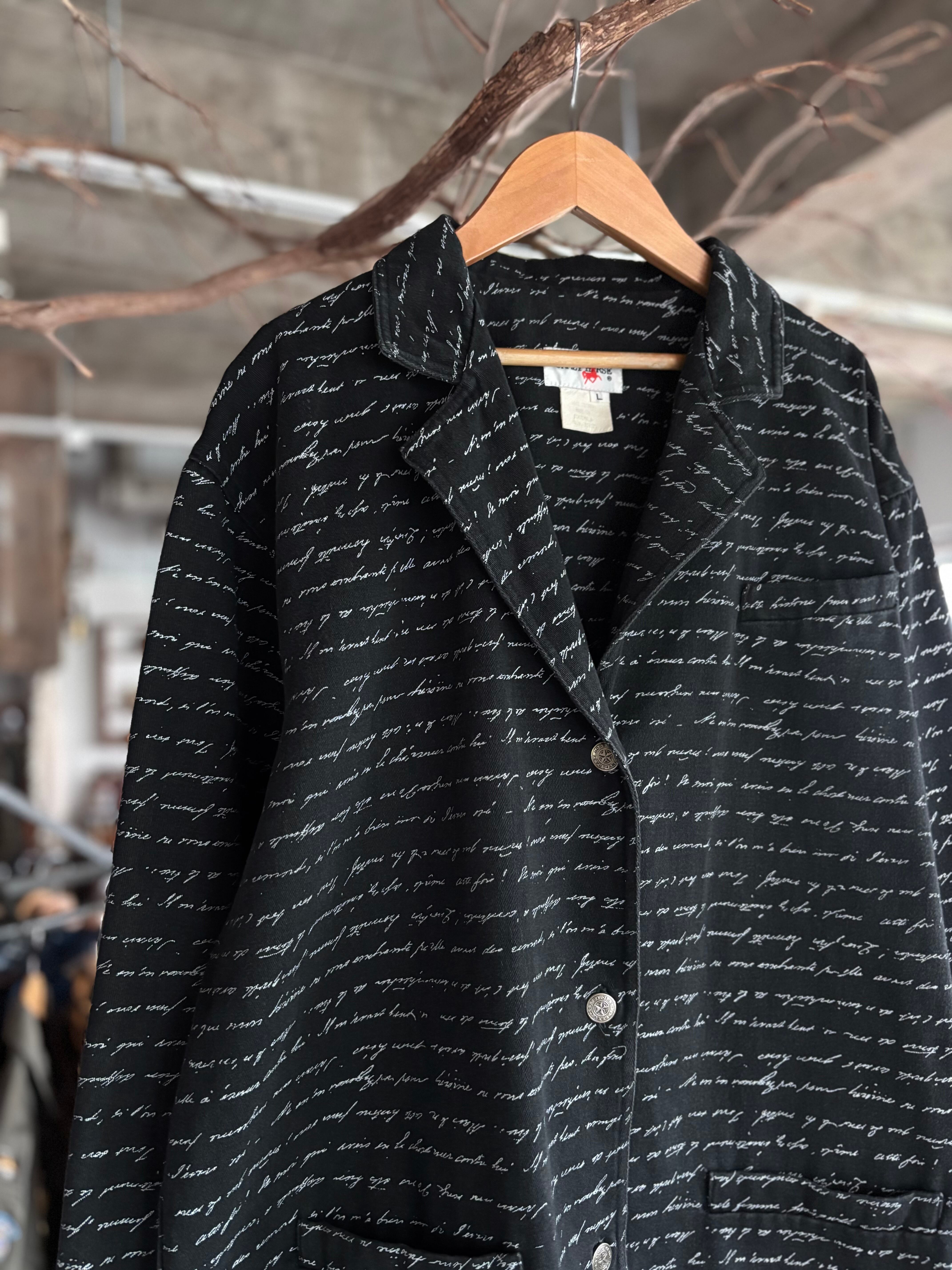 厚手のコットンツイル素材。リラックスフィット。モノトーンの総柄プリントに、細めのアームがスタイリッシュな印象。メタルボタン仕様。