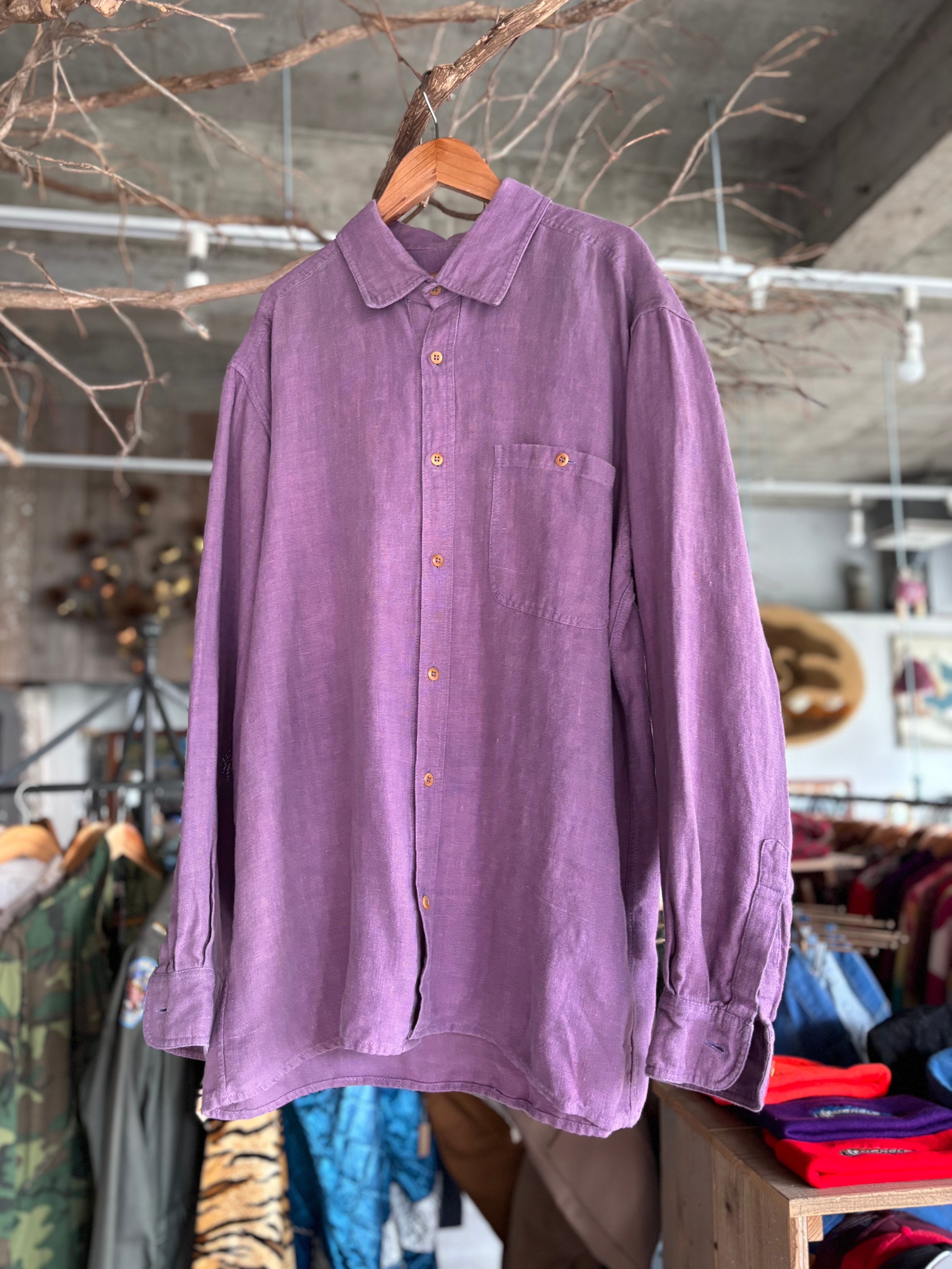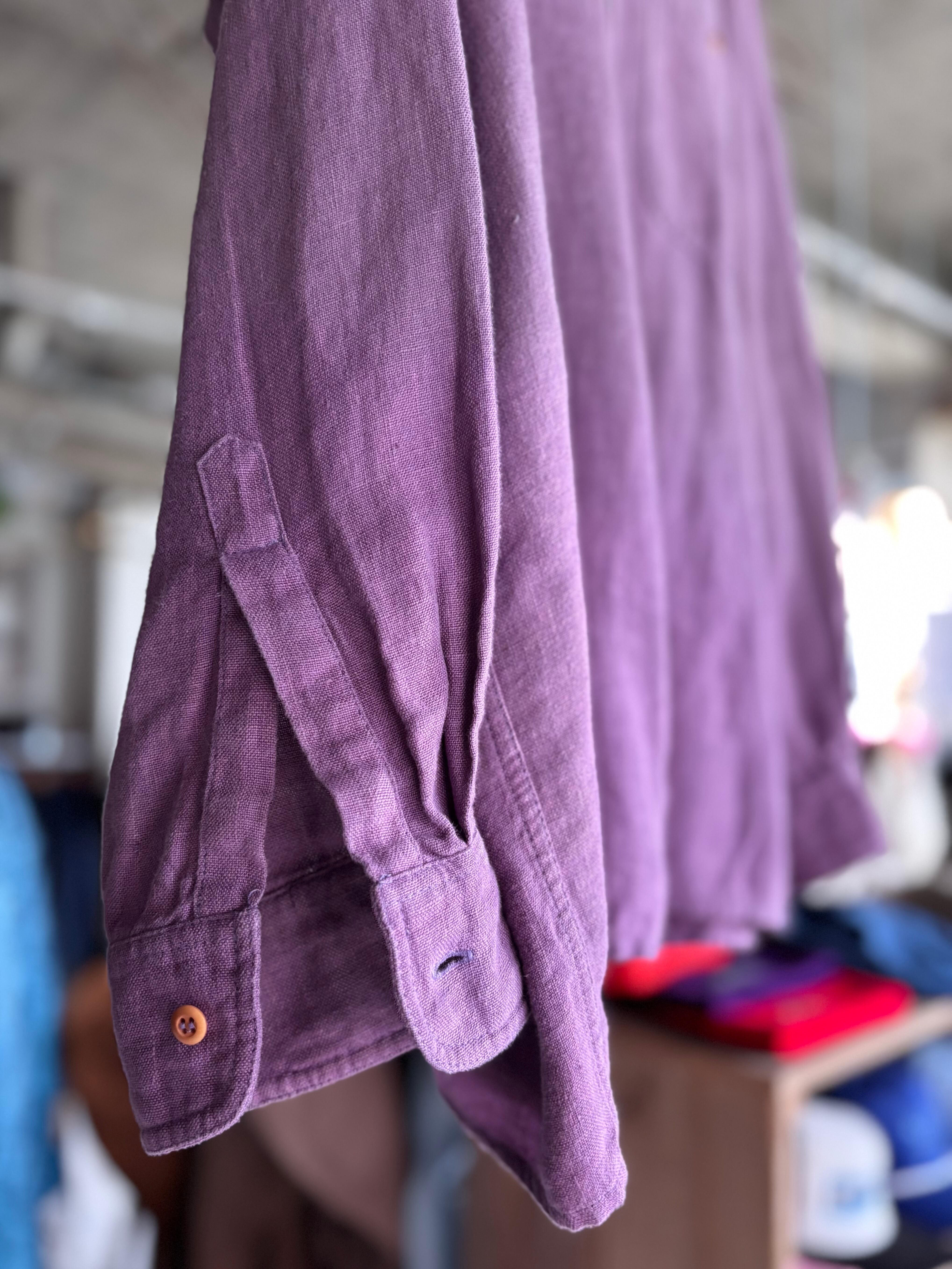 柔らかいヘンプ素材。柔らかい発色の藤色。リラックスフィット。仕立ての良いRUMANIA製。上品な雰囲気でユニセックスでおすすめの一着です。