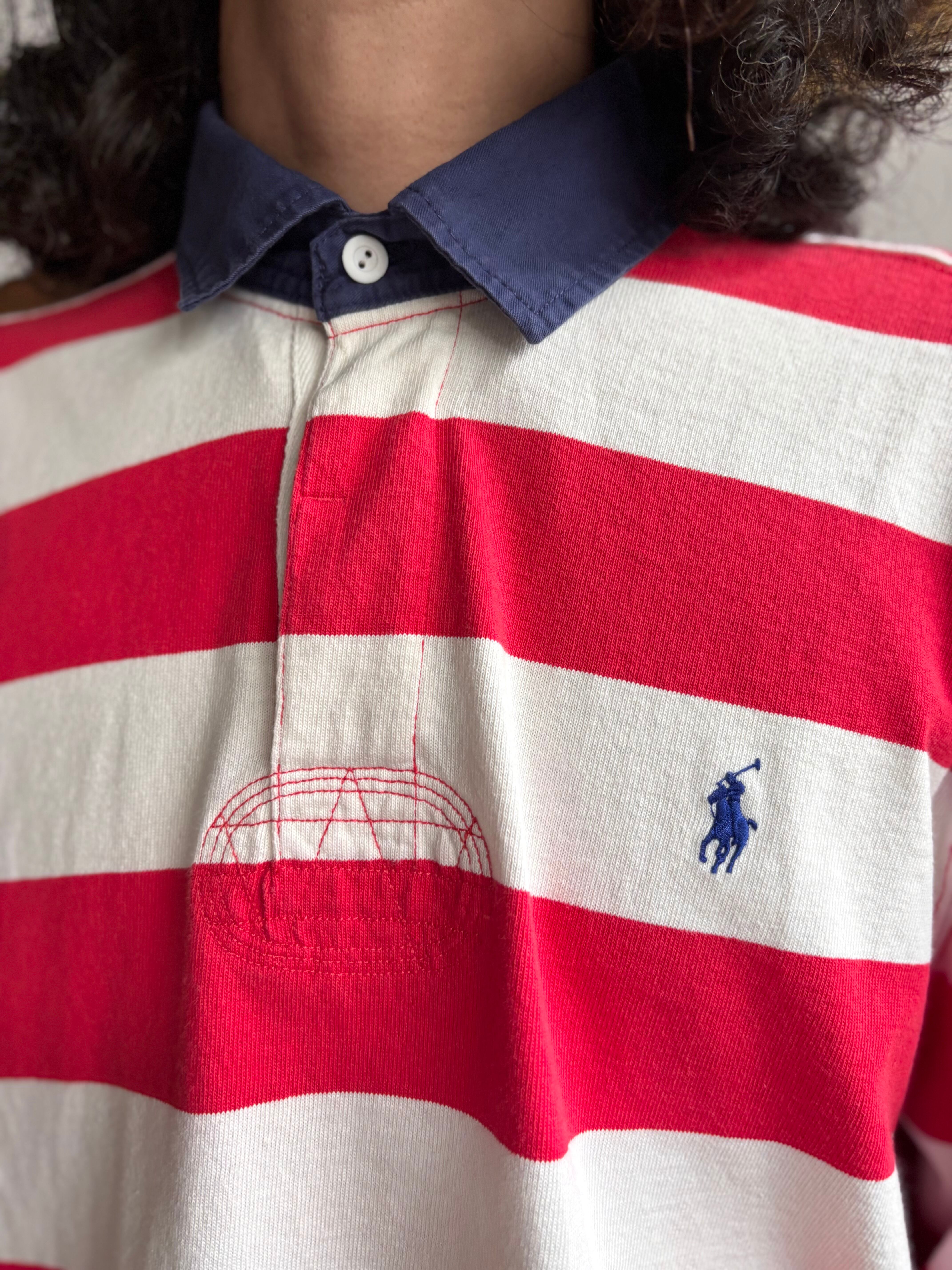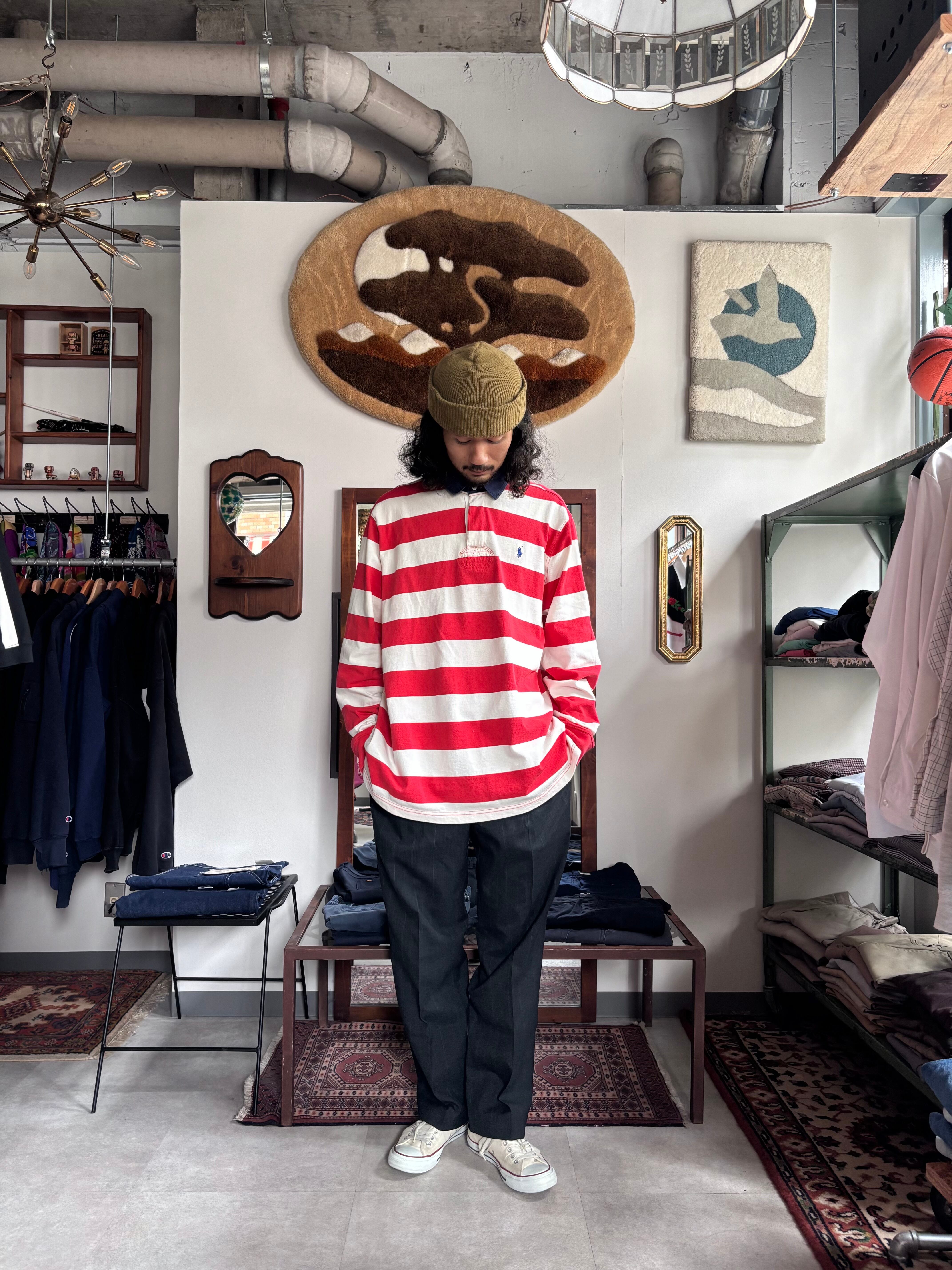 厚手のコットン素材。赤白ボーダーに、ネイビーの襟とポニー刺繍。ルーズフィット。フロントボタン下の補強ステッチや、脇下の切り返しなど仕立ての良いラガーシャツ。