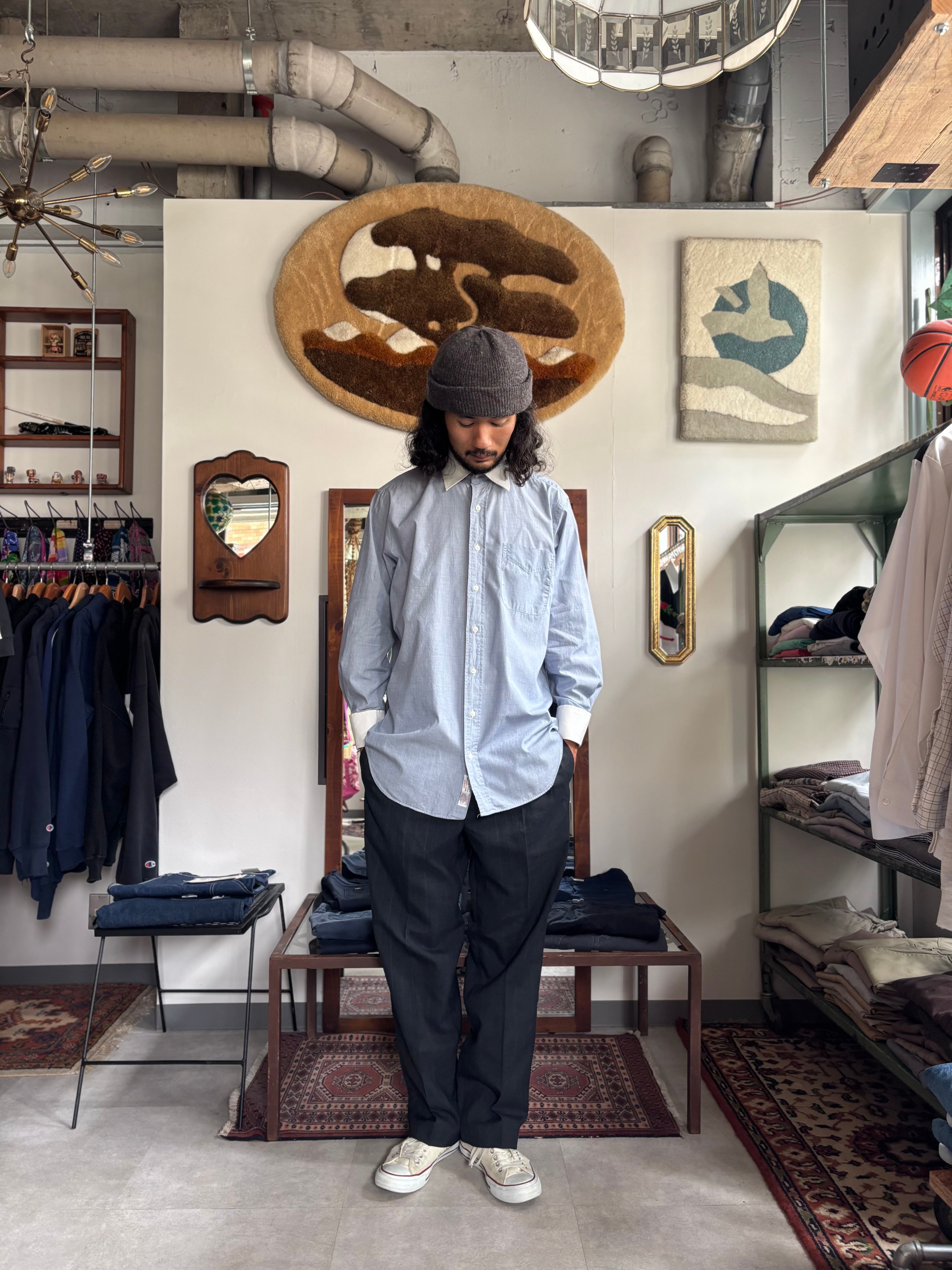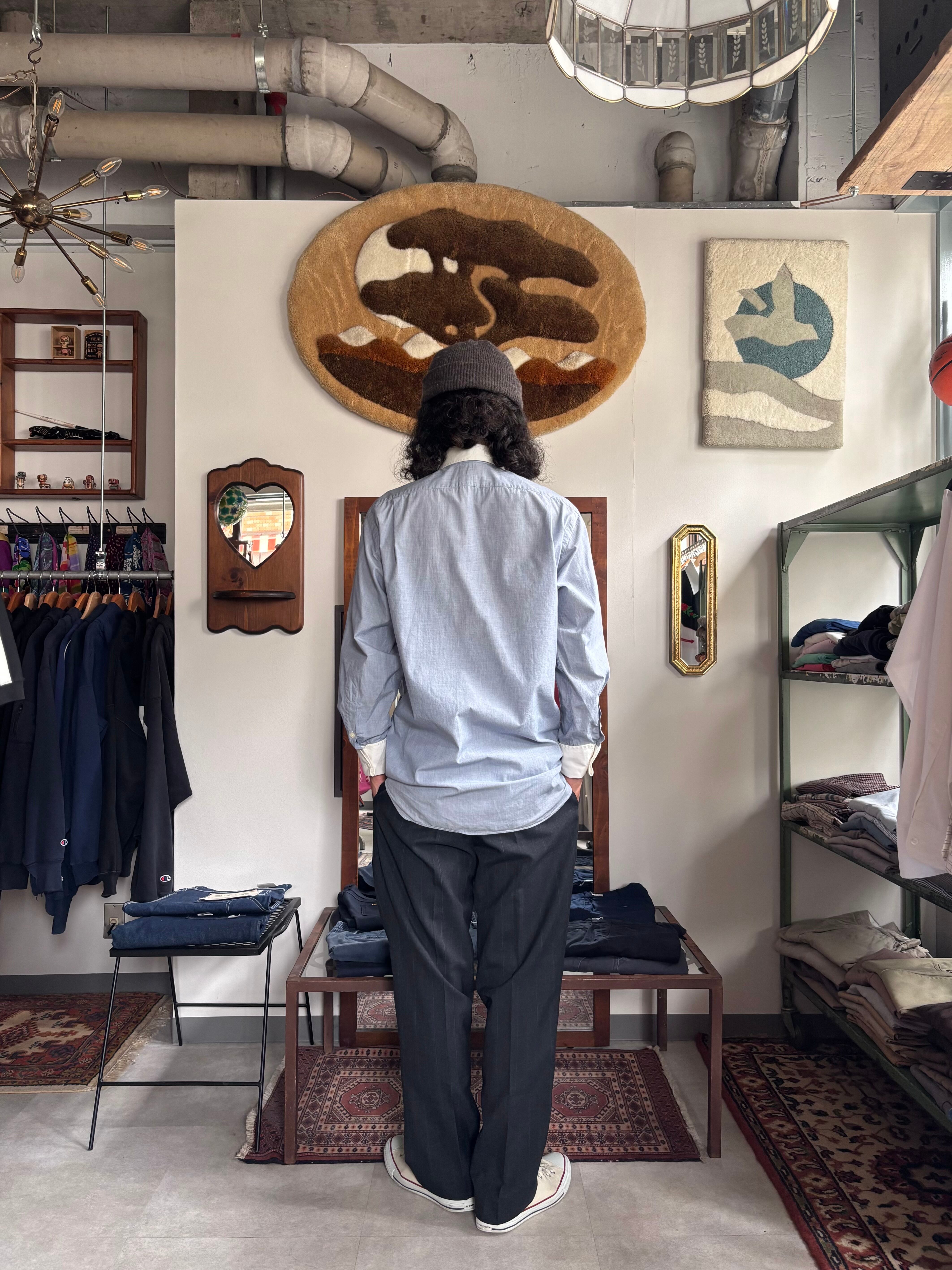 薄手のコットン素材。リラックスフィット。USA製のOLDモデル。ハケメ生地のクレリックシャツ。ダブルカフスにシェルボタンを後付けし、そのまま着用できるようにしてあります。