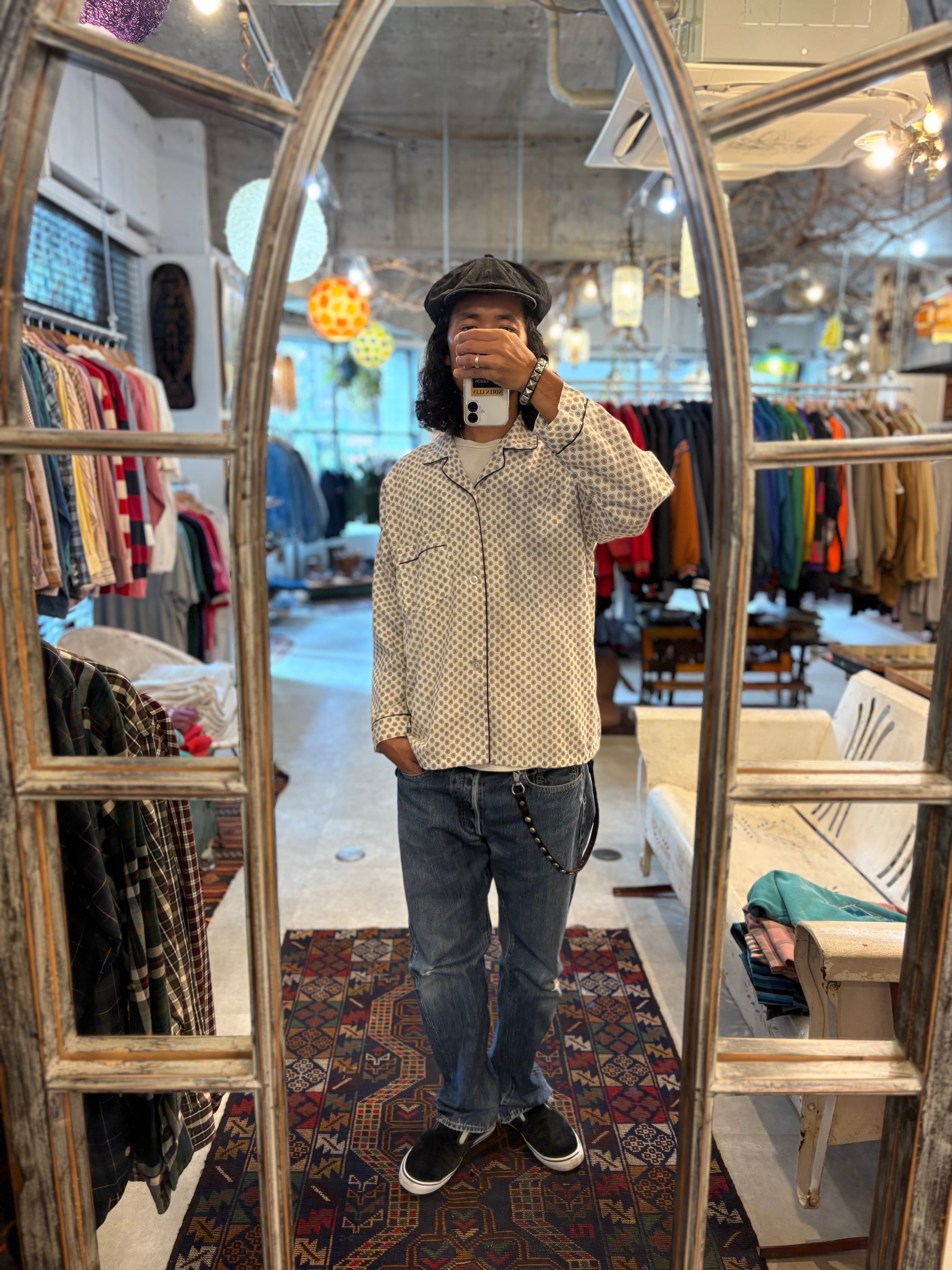 薄手のコットンポリ素材。オーセンティックフィット。ラペルカラーに、パイピングデザインのクラシカルなパジャマシャツのディテール。60s~70sにかけて人気の高かった小紋柄タイプ。Tシャツの上から羽織るのにも最適なvintageシャツです。