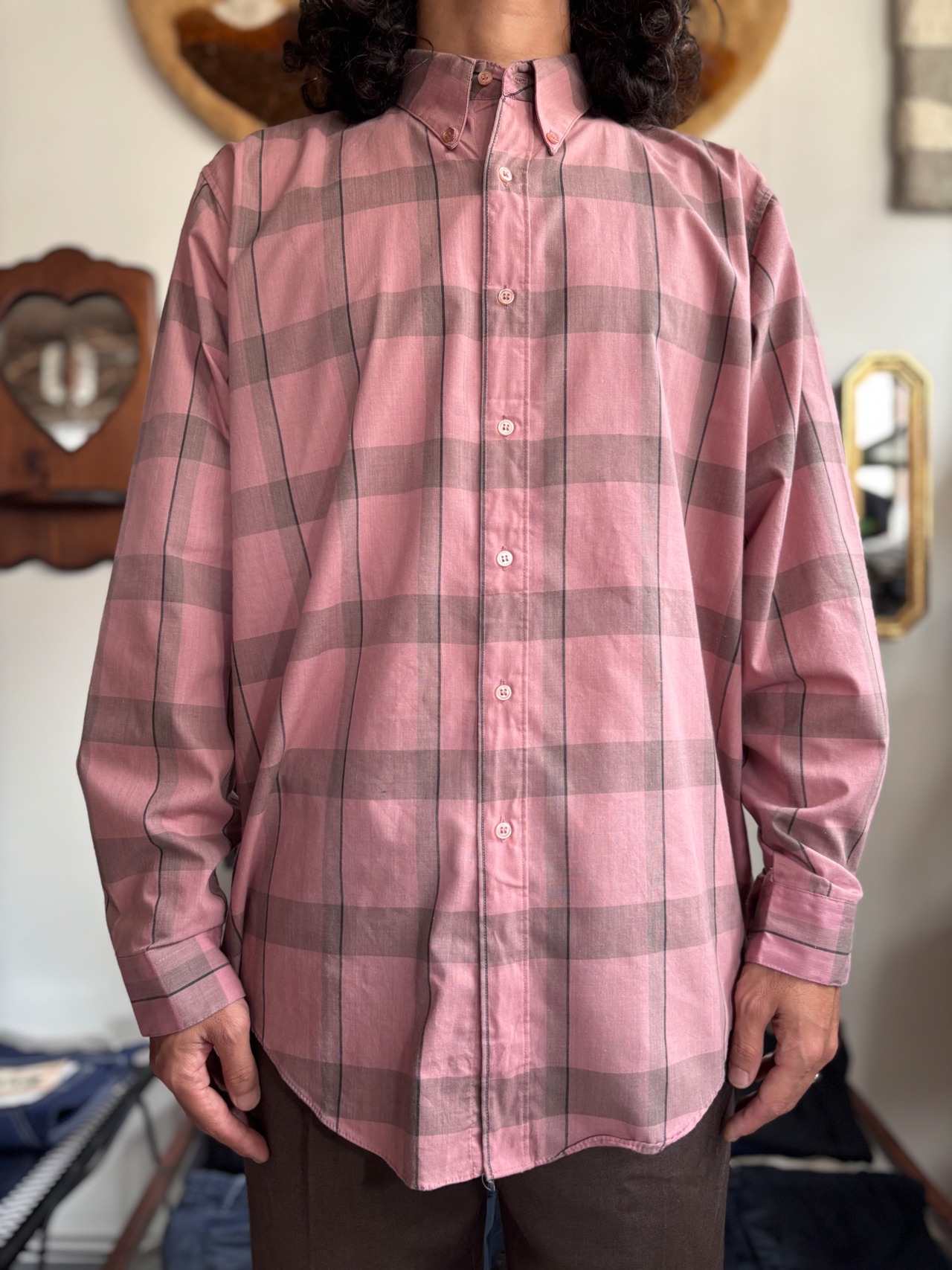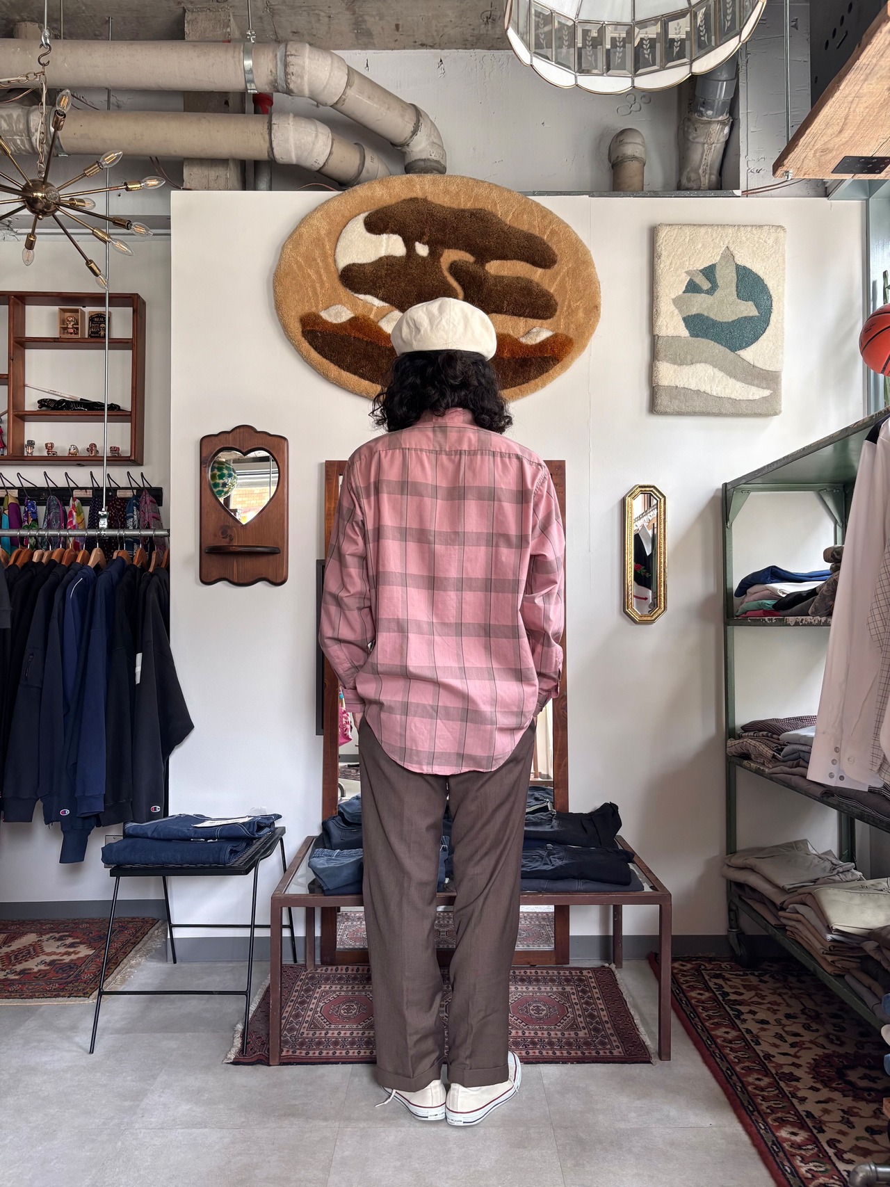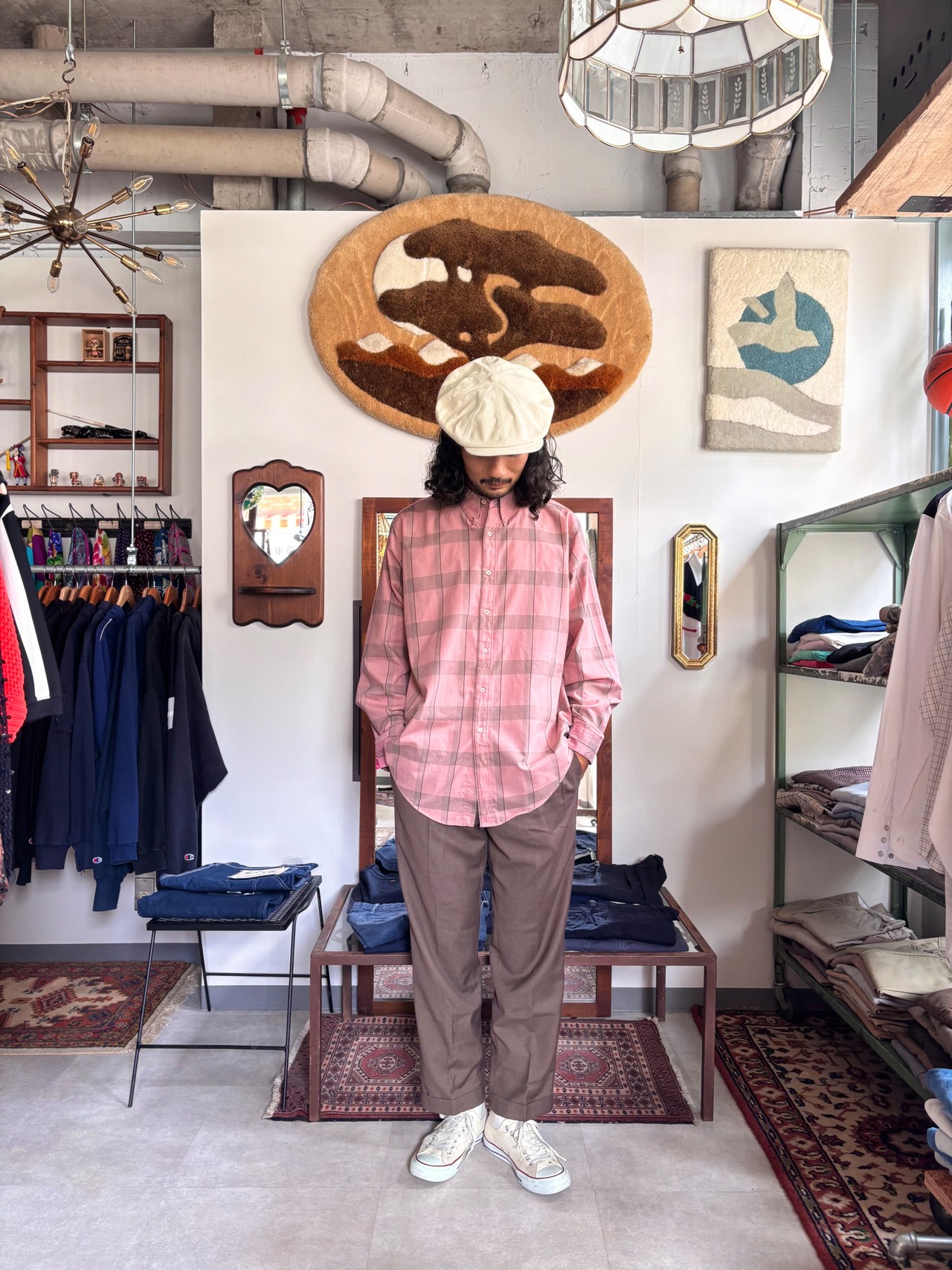薄手のコットンポリ素材。オーセンティックフィット。お洒落感抜群の pink × gray カラー。胸ポケット無しのBD仕様。single needle tailoring 仕上げ。ピンクのクリアボタンも可愛いです。